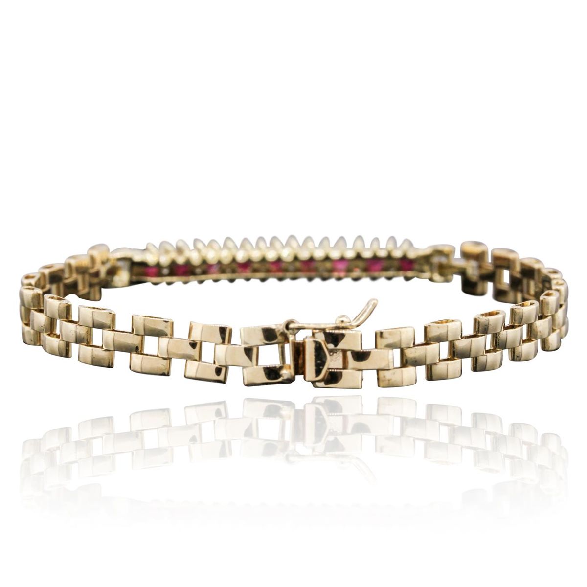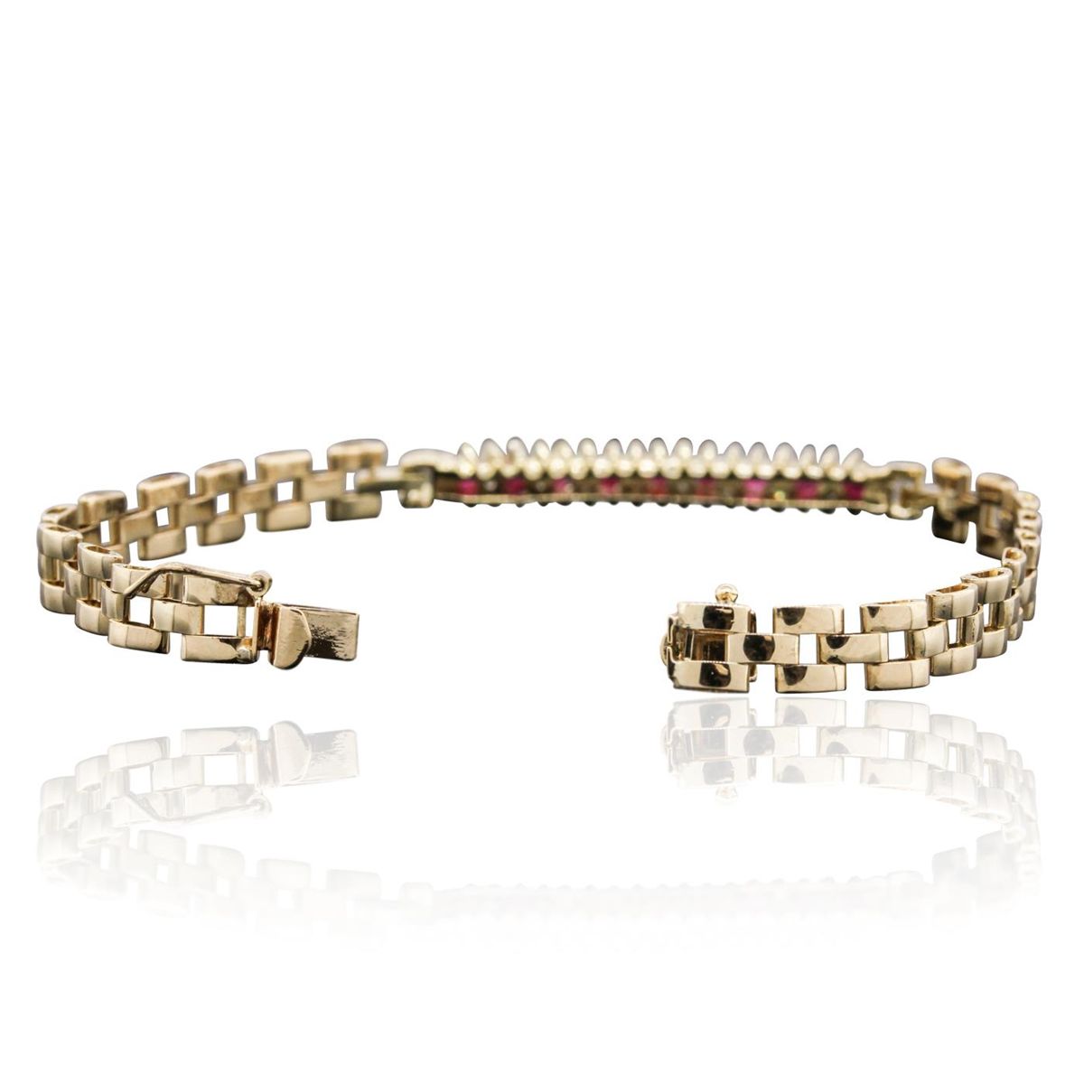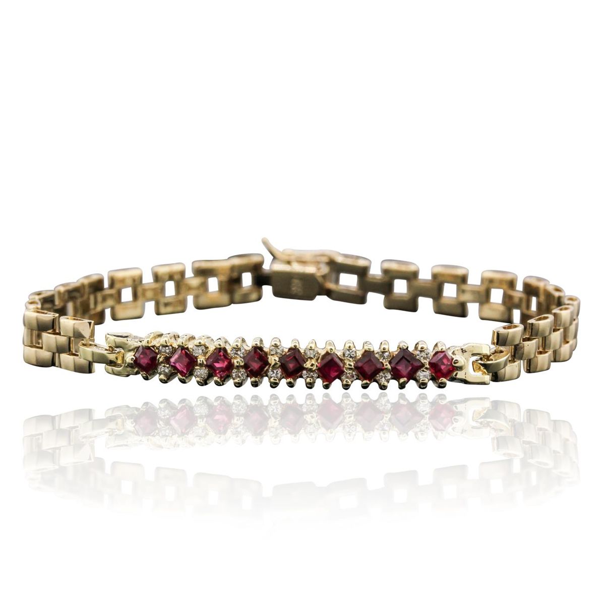 One electronically tested 14KT yellow gold Ladies combination cast & assembled bracelet with a hidden box clasp with a bright polish finish. Condition is very good. Measurements: 6.5" in length. Identified with markings of "14K". Containing: Nine prong set square standard step cut natural rubies, measuring 2.80 x 2.80 x 1.82mm, approximate. Total Weight of 1.26ct., clarity is eye clean, type II, medium, moderately strong, red color, (GIA R 5/4), cut is good. Colored gemstones are presumed to have been subjected to commonly used color/clarity enhancement processes. Sixteen prong set round brilliant cut diamonds, measuring 1.50 - 1.50 x 0.90mm (depth est.) approximate. Total Weight of 16 Stones = 0.20ct. Clarity: I-1. Color: J - K, Cut is Good. Total Weight of Colored Stones 1.26ct. Total Weight of Diamonds 0.20ct. Total Weight of Bracelet 10.90 grams. GGL Appraised at $4,980.00.
