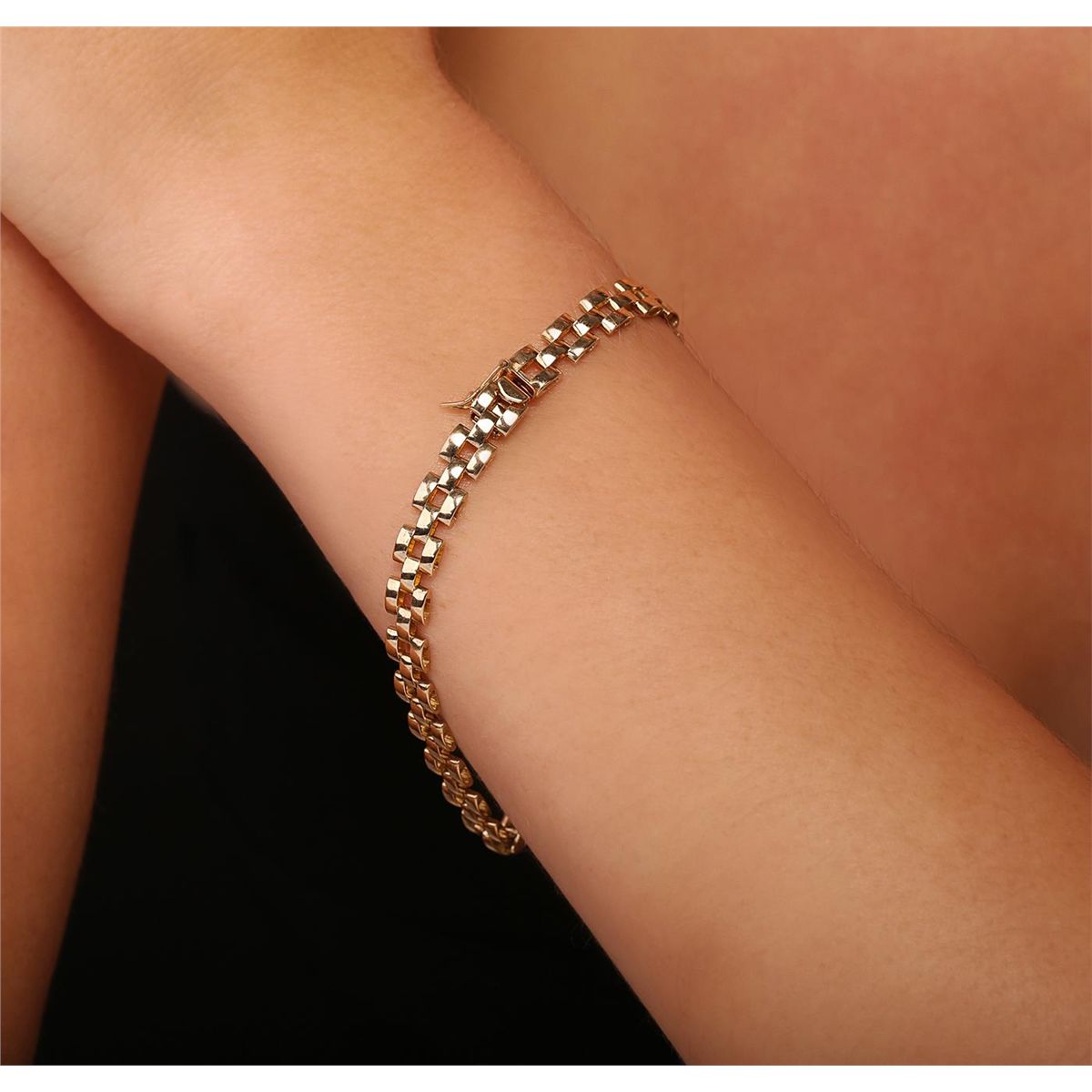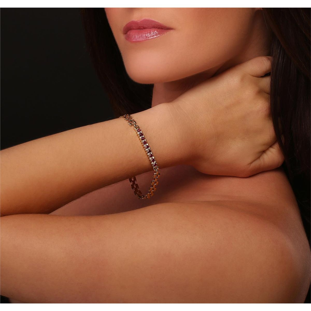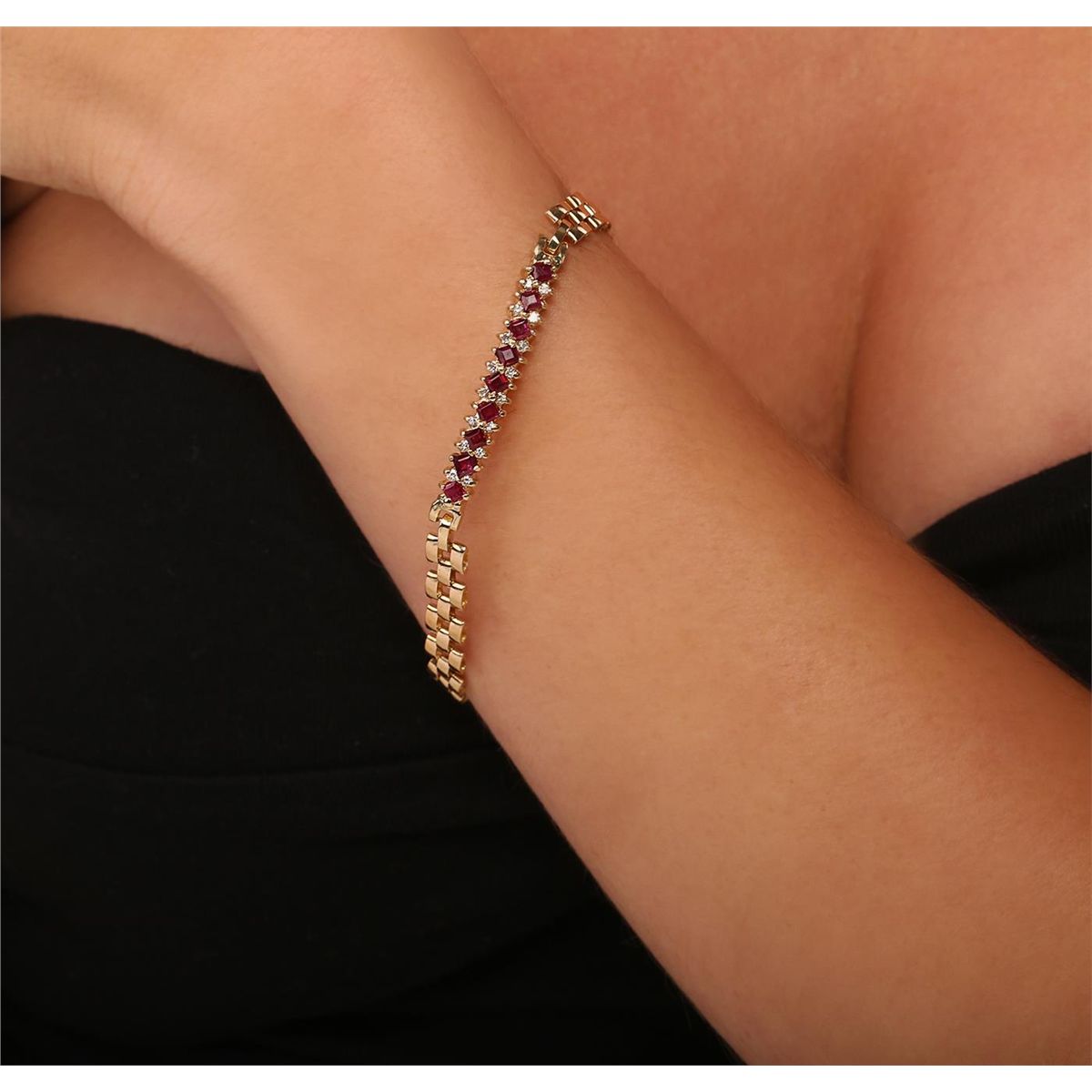 One electronically tested 14KT yellow gold Ladies combination cast & assembled bracelet with a hidden box clasp with a bright polish finish. Condition is very good. Measurements: 6.5" in length. Identified with markings of "14K". Containing: Nine prong set square standard step cut natural rubies, measuring 2.80 x 2.80 x 1.82mm, approximate. Total Weight of 1.26ct., clarity is eye clean, type II, medium, moderately strong, red color, (GIA R 5/4), cut is good. Colored gemstones are presumed to have been subjected to commonly used color/clarity enhancement processes. Sixteen prong set round brilliant cut diamonds, measuring 1.50 - 1.50 x 0.90mm (depth est.) approximate. Total Weight of 16 Stones = 0.20ct. Clarity: I-1. Color: J - K, Cut is Good. Total Weight of Colored Stones 1.26ct. Total Weight of Diamonds 0.20ct. Total Weight of Bracelet 10.90 grams. GGL Appraised at $4,980.00.