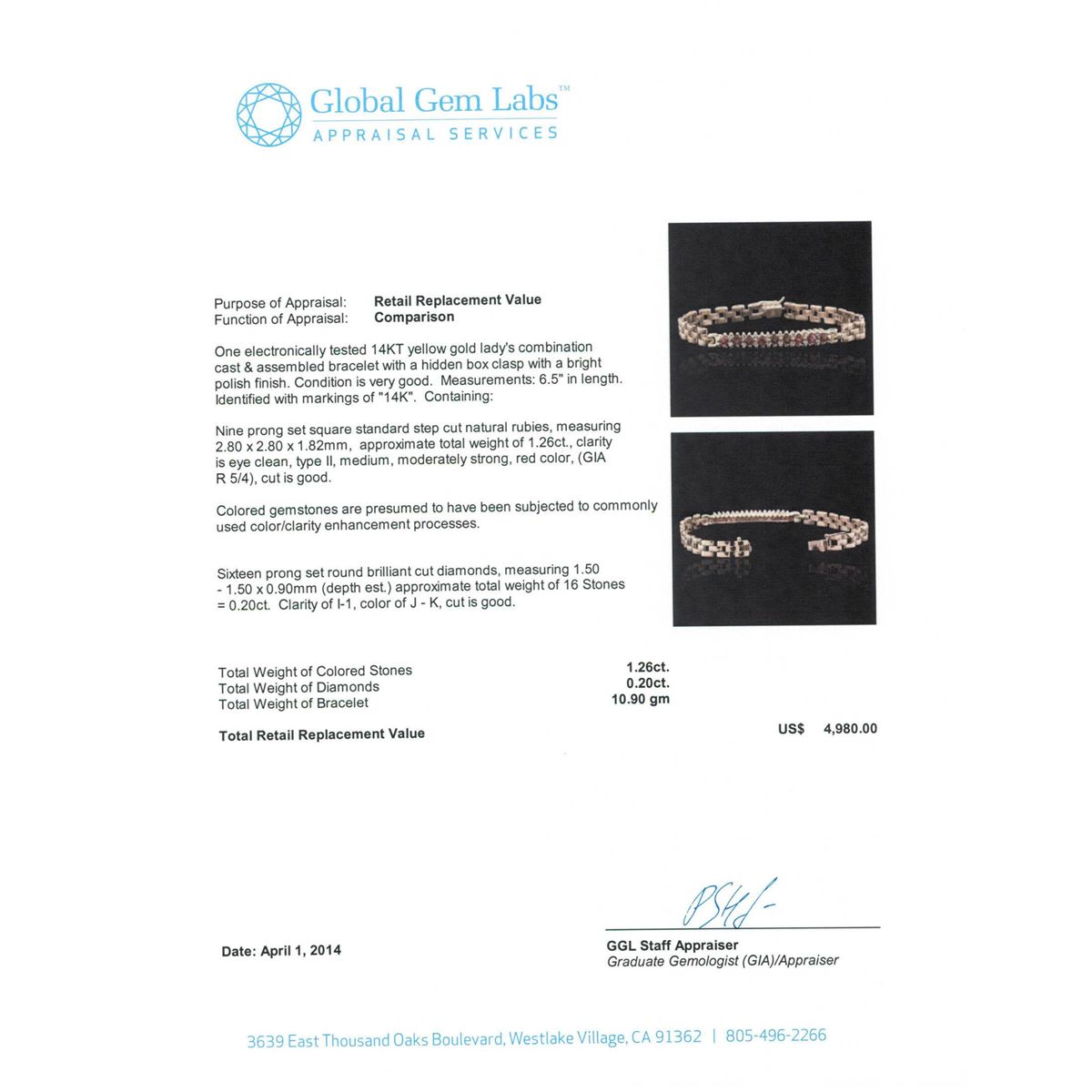 One electronically tested 14KT yellow gold Ladies combination cast & assembled bracelet with a hidden box clasp with a bright polish finish. Condition is very good. Measurements: 6.5" in length. Identified with markings of "14K". Containing: Nine prong set square standard step cut natural rubies, measuring 2.80 x 2.80 x 1.82mm, approximate. Total Weight of 1.26ct., clarity is eye clean, type II, medium, moderately strong, red color, (GIA R 5/4), cut is good. Colored gemstones are presumed to have been subjected to commonly used color/clarity enhancement processes. Sixteen prong set round brilliant cut diamonds, measuring 1.50 - 1.50 x 0.90mm (depth est.) approximate. Total Weight of 16 Stones = 0.20ct. Clarity: I-1. Color: J - K, Cut is Good. Total Weight of Colored Stones 1.26ct. Total Weight of Diamonds 0.20ct. Total Weight of Bracelet 10.90 grams. GGL Appraised at $4,980.00.