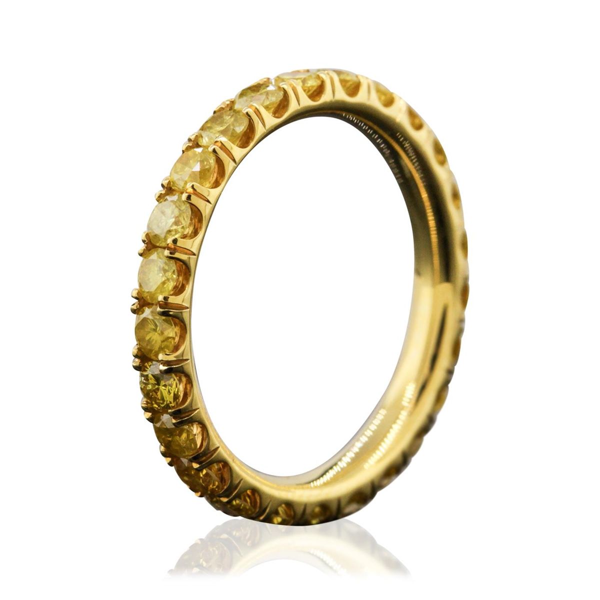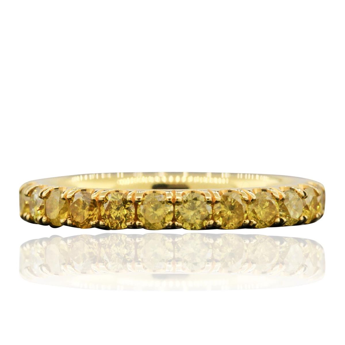 One electronically tested 14KT yellow gold Ladies combination cast & assembled wedding band with a bright polish finish. Condition is very good. Identified with markings of "14K". Containing: Twenty-Five prong set round brilliant cut diamonds, measuring 2.40 - 2.40 x 1.44mm (depth est.) approximate. Total Weight of 25 Stones = 1.27ct. Clarity: I-1 to I-2, Cut is Good. Color of the diamonds has been enhanced. All diamonds are graded in the mounting, unless otherwise stated. Total Weight of Diamonds 1.27ct. Total Weight of Wedding Band 2.30 grams.. GGL Appraised at $5,860.00.