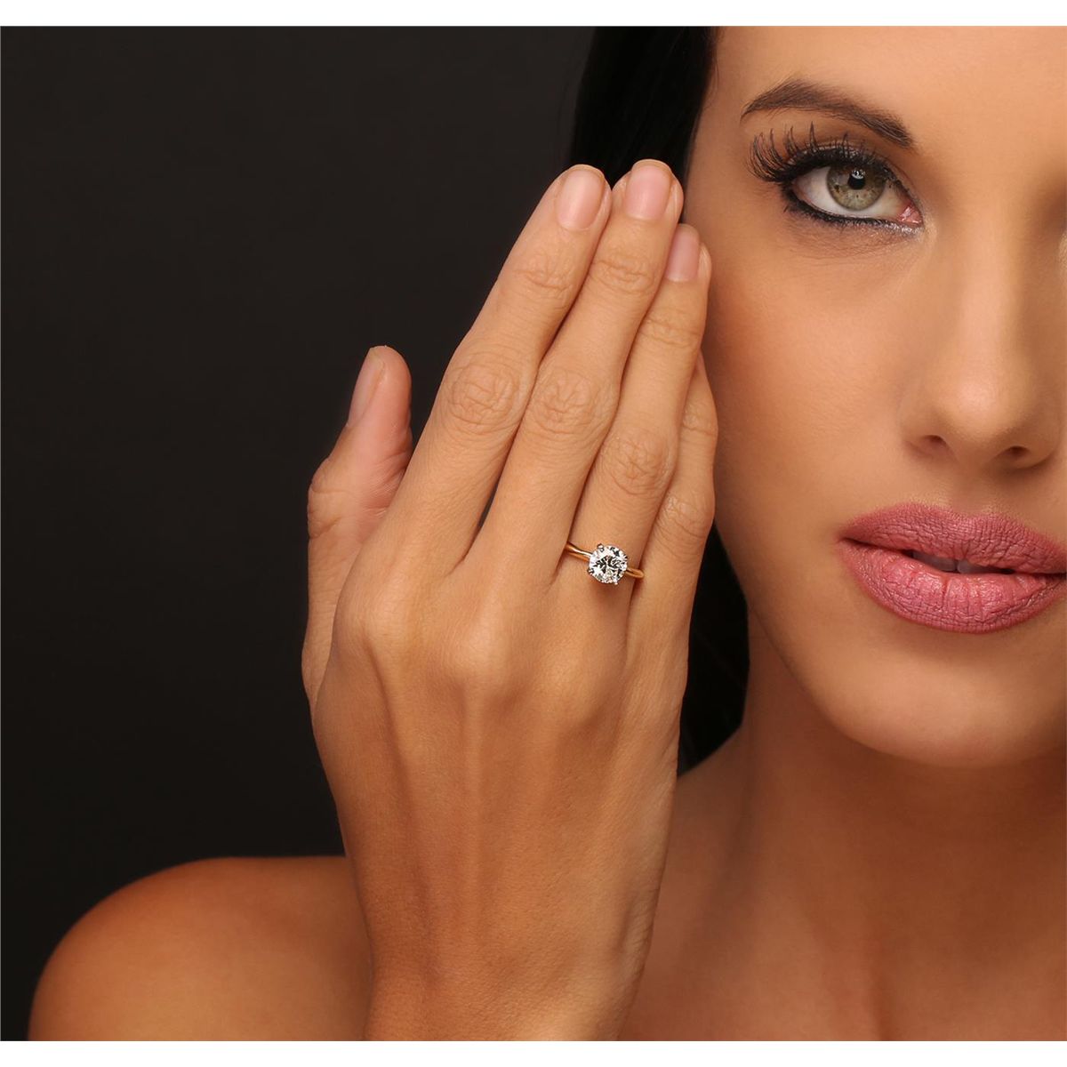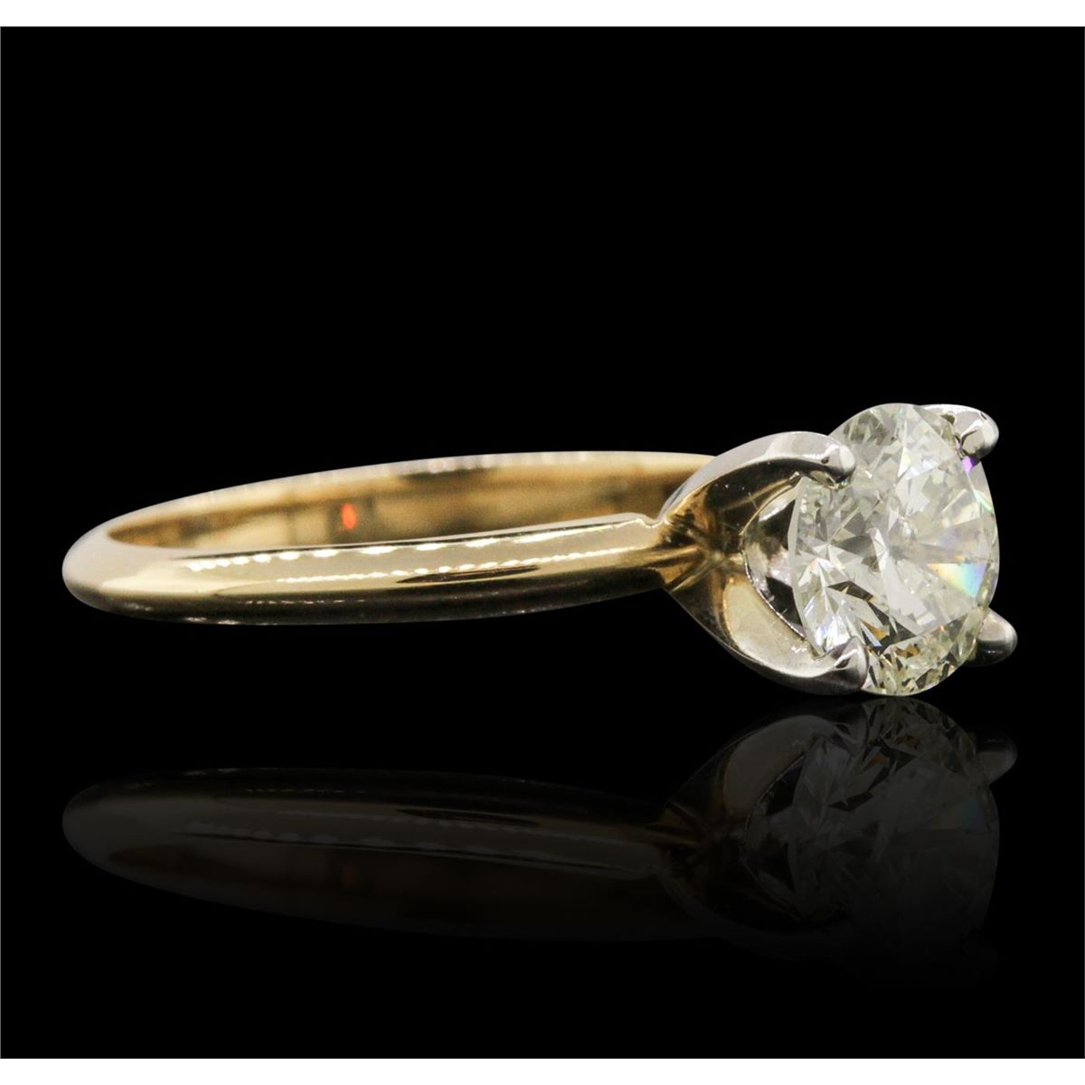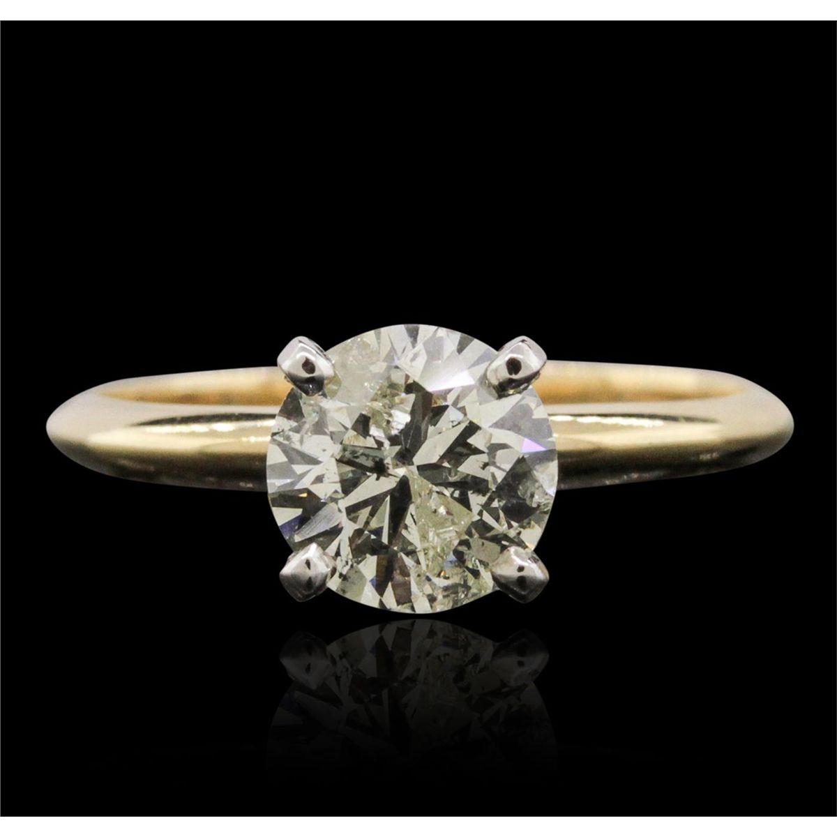 One electronically tested 14KT yellow gold ladies cast diamond solitaire ring with a bright polish finish. Condition is new, good workmanship. The ring is completed by a one and one-half millimeter wide band. Identified with markings of "14K". Containing: One prong set round brilliant cut diamond, measuring 6.96 - 6.95 x 4.20mm (depth est.), 4.00.%. GTCF approximate weight of 1.29ct. Graded in the setting. Clarity: I-1. Color: K Depth 60.3%. Table 56.0%. Total Weight of Diamonds 1.29ct. Total Weight of Ring 2.36 grams. AIG Appraised at $11,025.00.