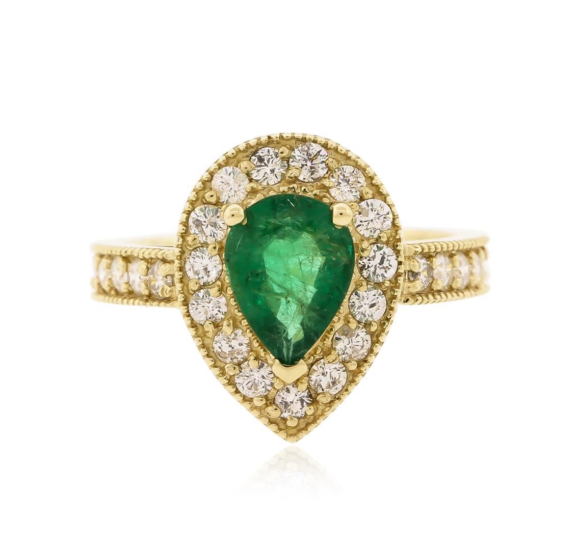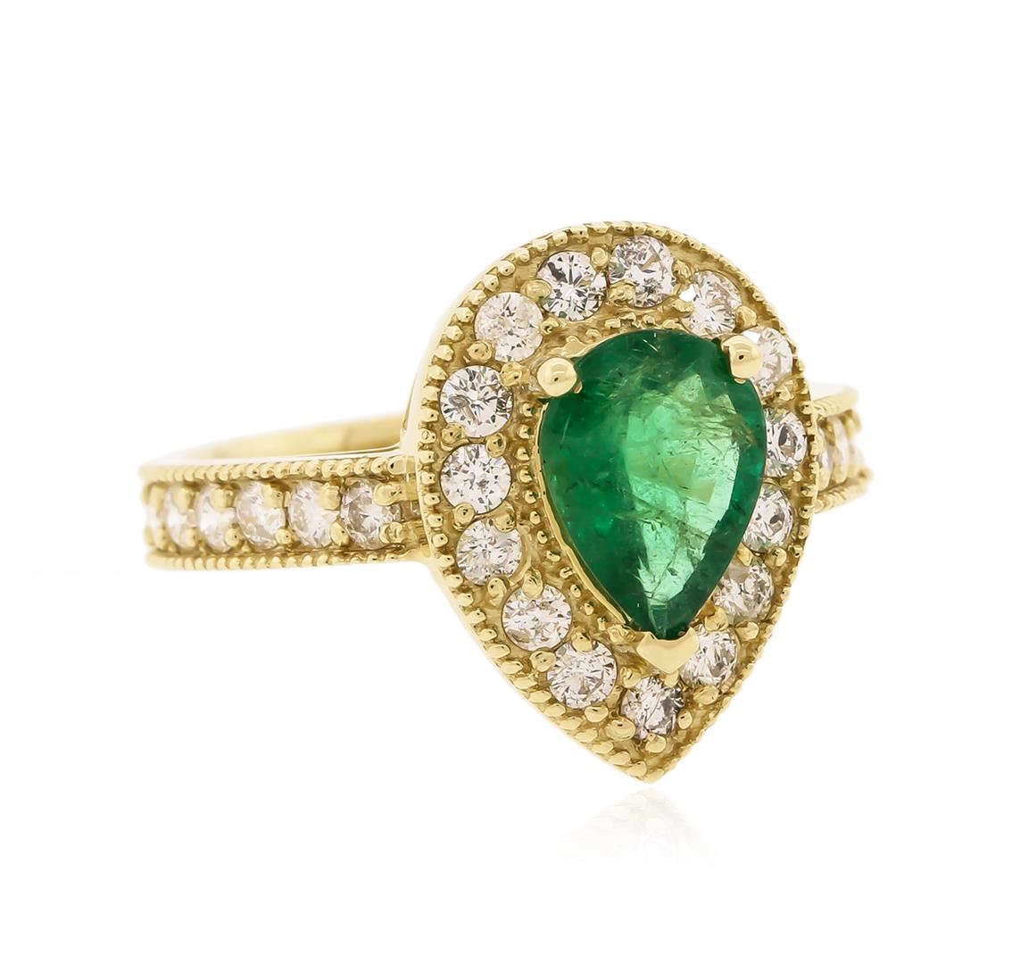 One electronically tested 14KT yellow gold ladies cast emerald and diamond ring. Condition is new, good workmanship. The featured emerald is set within a diamond bezel, supported by diamond set shoulders and completed by a three millimeter wide band. Bright polish finish with milgrain detailing throughout. Identified with markings of "K14". Containing: One prong set pear mixed cut natural emerald, measuring 9.20 x 6.60 x 3.75mm, 8% bulge factor, approximate weight of 1.34ct, clarity is heavily included, type III, medium dark, moderately strong, very slightly bluish green color, (GIA vslbG 6/4), cut is good. Transmitting light with a minimum of distortion, transparent to translucent. Naturally occurring internal & external characteristics are present. Indications of oil residue. Graded in the setting. Twenty-Seven bead set round brilliant cut diamonds, measuring 2.00 - 1.90 x 1.17mm (depth est.) approximate total weight of 27 Stones = 0.83ct. Graded in the setting. Clarity SI-2 to I-1 Color F - H Total Weight of Colored Stones 1.34ct. Total Weight of Diamonds 0.83ct. Total Weight of Ring 5.00 grams. AIG Appraised at $5,630.00.