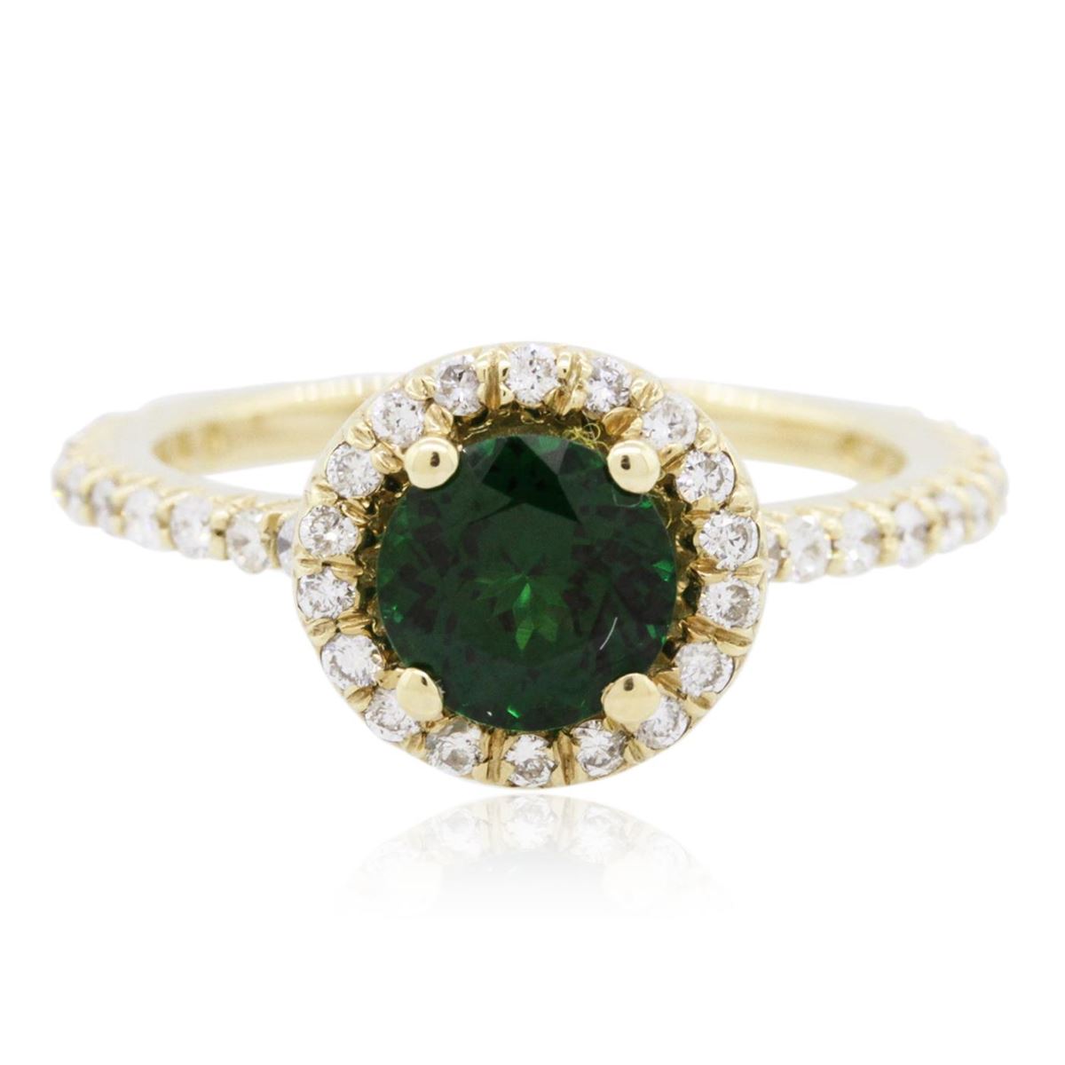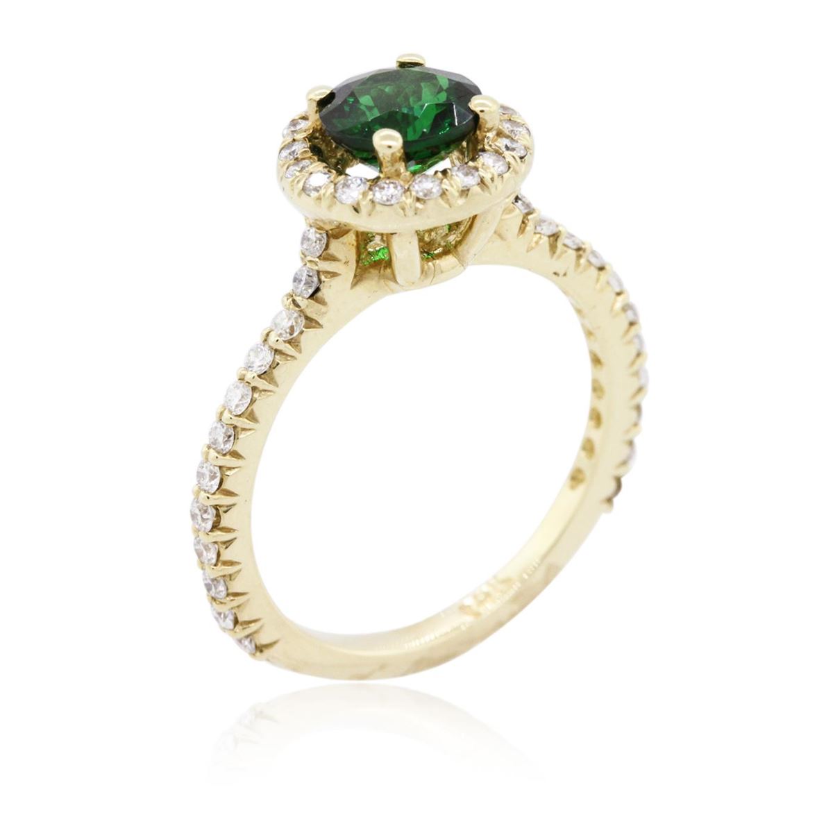 One electronically tested 14KT yellow gold ladies combination cast & assembled garnet and diamond ring with a cathedral shank with a bright polish finish. Identified with markings of "14K". Condition is new. Containing: One prong set round modified brilliant cut natural garnet, measuring 6.41 - 6.40 x 4.10 mm, approximate weight of 1.36ct., clarity is eye clean, medium, moderately strong, green color, (GIA G 5/4), cut is good. Forty-Two prong set round brilliant cut diamonds, measuring 1.50 - 1.30 x 0.84mm (depth est.) approximate total weight of 42 Stones = 0.42ct. Clarity: I-1 to I-2. Color: I - J, Cut is Good. All diamonds and colored gemstones are graded in the mounting, unless otherwise stated. Colored gemstones are presumed to have been subjected to commonly used enhancement processes. Total Weight of Colored Stones 1.36ct. Total Weight of Diamonds 0.42ct. Total Weight of Ring 3.80 grams. GGL Appraised at $3,290.00.
