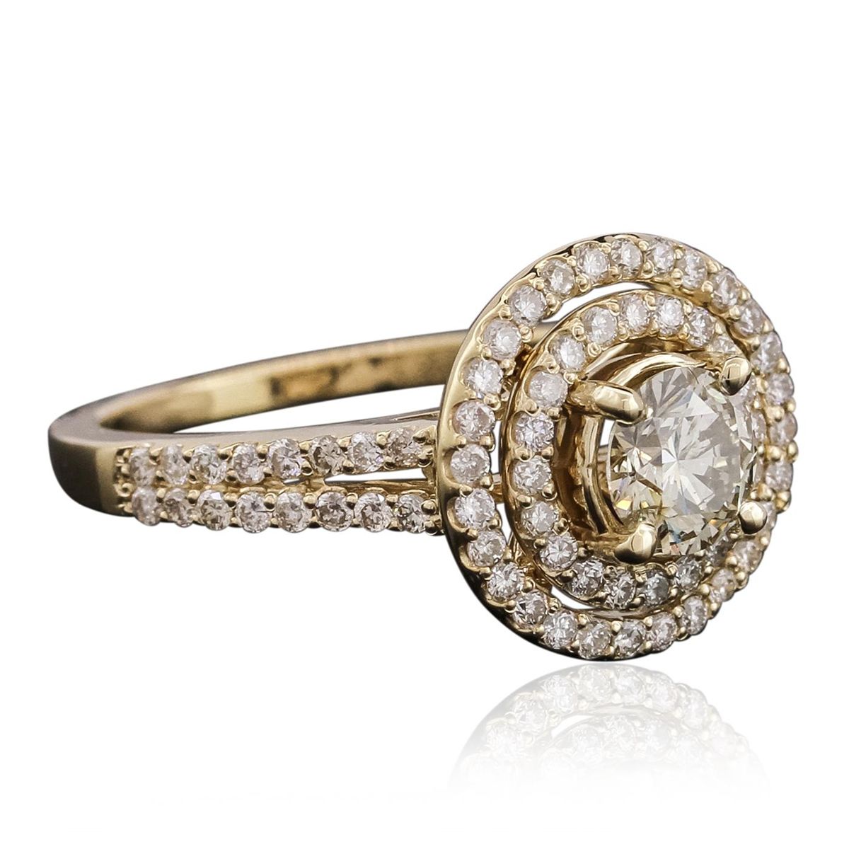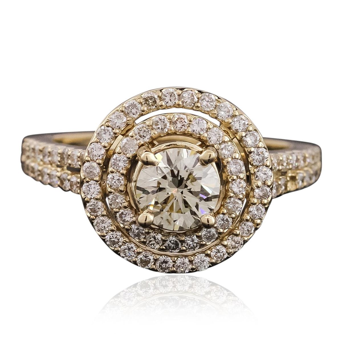 One electronically tested 14KT yellow gold ladies combination cast & assembled engagement ring with a split shank with a bright polish finish. Identified with markings of "14K". Condition is new. Containing: One prong set round brilliant cut diamond, measuring 5.76 - 5.73 x 3.61mm (depth est.) approximate weight of 0.73ct. Clarity: SI-2, Cut is Good. Eighty prong set round brilliant cut diamonds, measuring 1.30 - 1.30 x 0.78mm (depth est.) approximate total weight of 80 Stones = 0.64ct. Clarity: SI-2 to I-1. Color: J - K, Cut is Good. All diamonds are graded in the mounting, unless otherwise stated. Total Weight of Diamonds 1.37ct. Total Weight of Ring 4.50 grams. GGL Appraised at $8,550.00.
