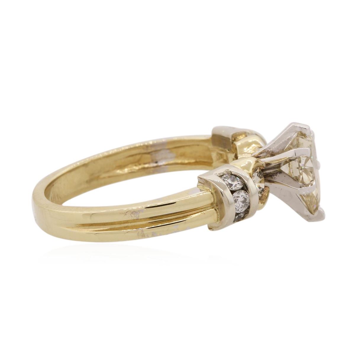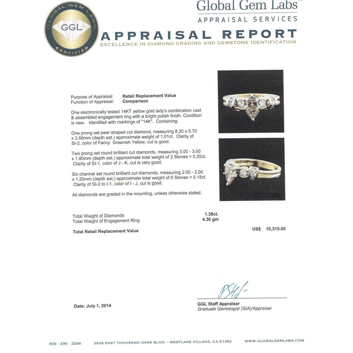 One electronically tested 14KT yellow gold Ladies combination cast & assembled engagement ring with a bright polish finish. Condition is new. Identified with markings of "14K". Containing: One prong set pear shaped cut diamond, measuring 8.20 x 5.70 x 3.59mm (depth est.) approximate weight of 1.01ct. Clarity: SI-2, Cut is Good. Two prong set round brilliant cut diamonds, measuring 3.00 - 3.00 x 1.80mm (depth est.) approximate total weight of 2 Stones = 0.20ct. Clarity: SI-1. Color: J - K, Cut is Very Good. Six channel set round brilliant cut diamonds, measuring 2.00 - 2.00 x 1.20mm (depth est.) approximate total weight of 6 Stones = 0.18ct. Clarity: SI-2 to I-1. Color: I - J, Cut is Good. All diamonds are graded in the mounting, unless otherwise stated. Total Weight of Diamonds 1.38ct. Total Weight of Engagement Ring 4.30 grams. GGL Appraised at $10,315.00.