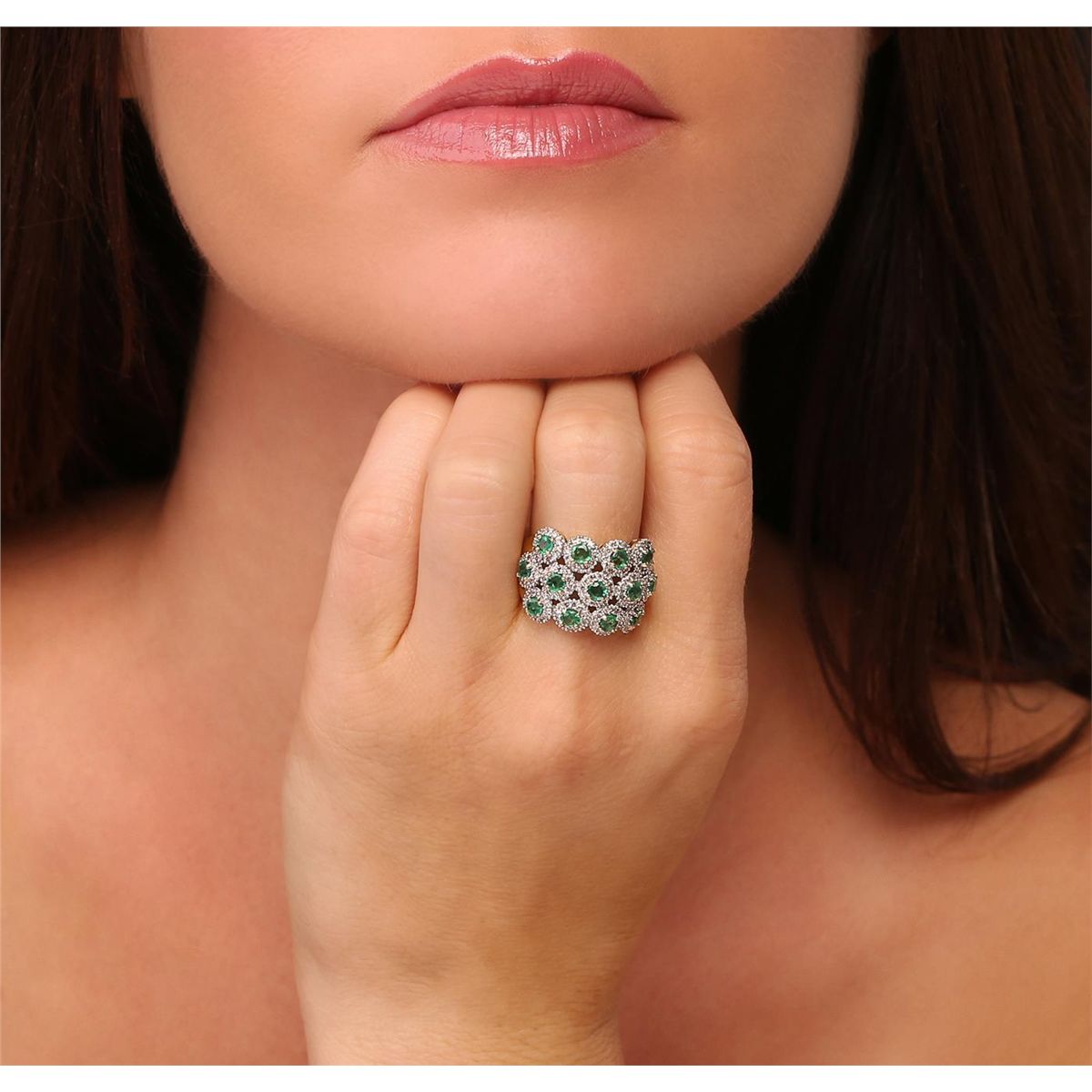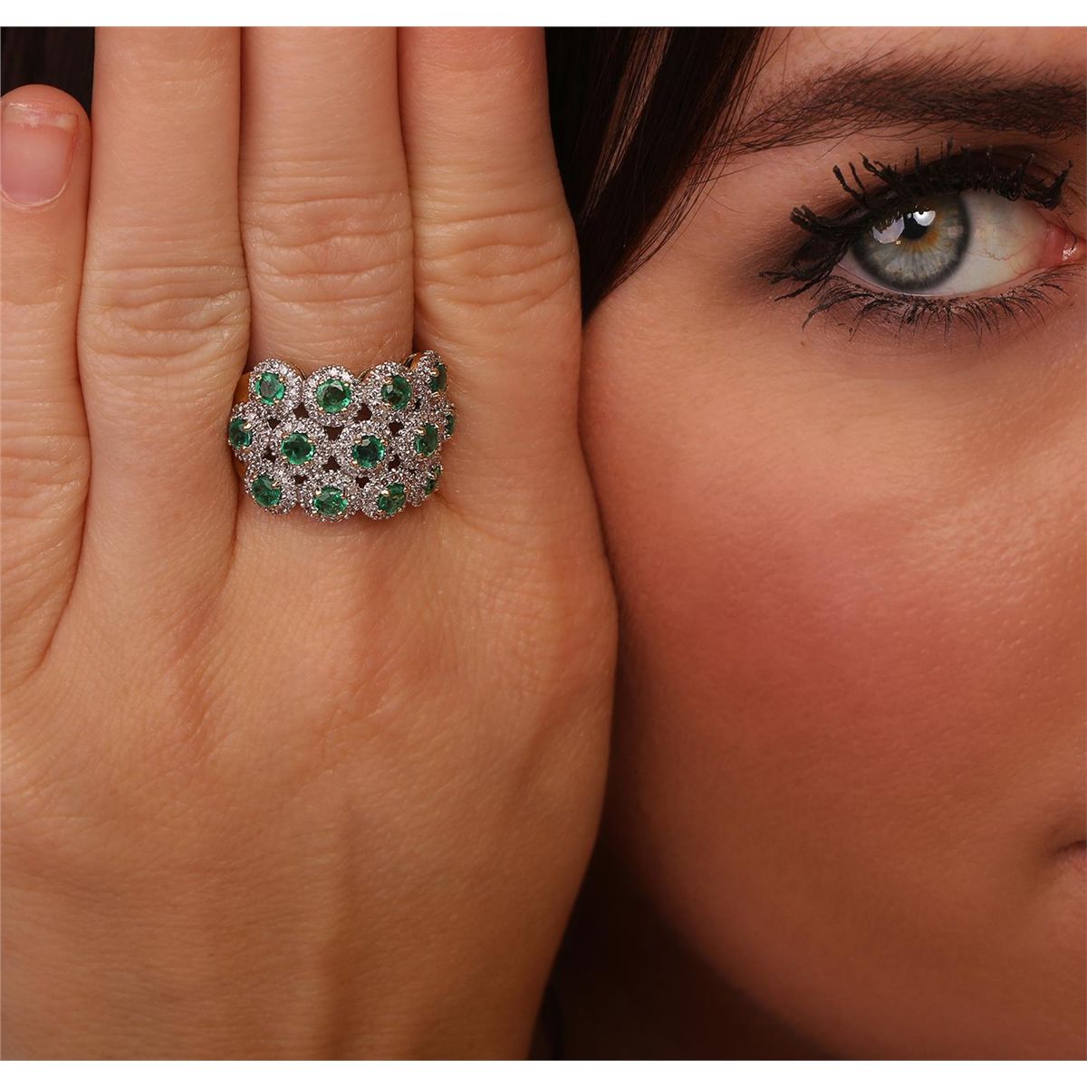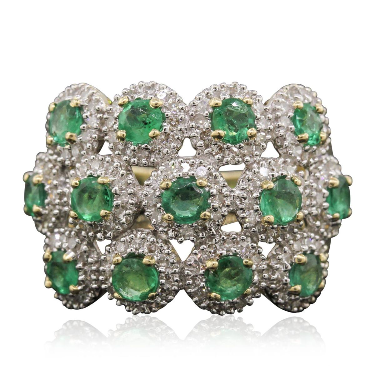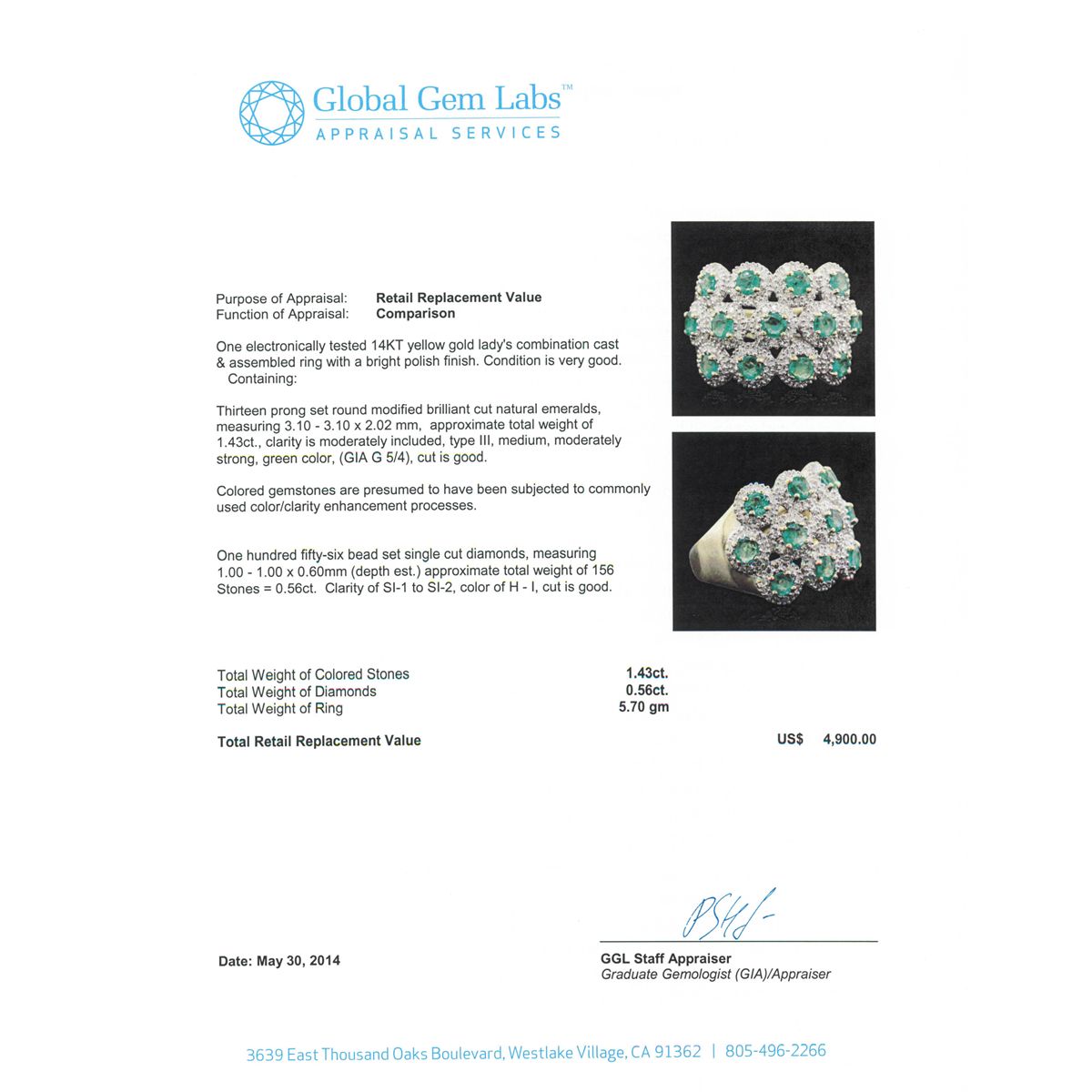 One electronically tested 14KT yellow gold Ladies combination cast & assembled ring with a bright polish finish. Condition is very good. Containing: Thirteen prong set round modified brilliant cut natural emeralds, measuring 3.10 - 3.10 x 2.02 mm, approximate. Total Weight of 1.43ct., clarity is moderately included, type III, medium, moderately strong, green color, (GIA G 5/4), cut is good. Colored gemstones are presumed to have been subjected to commonly used color/clarity enhancement processes. One Hundred Fifty-Six bead set single cut diamonds, measuring 1.00 - 1.00 x 0.60mm (depth est.) approximate. Total Weight of 156 Stones = 0.56ct. Clarity: SI-1 to SI-2. Color: H - I, Cut is Good. Total Weight of Colored Stones 1.43ct. Total Weight of Diamonds 0.56ct. Total Weight of Ring 5.70 grams. GGL Appraised at $4,900.00.
