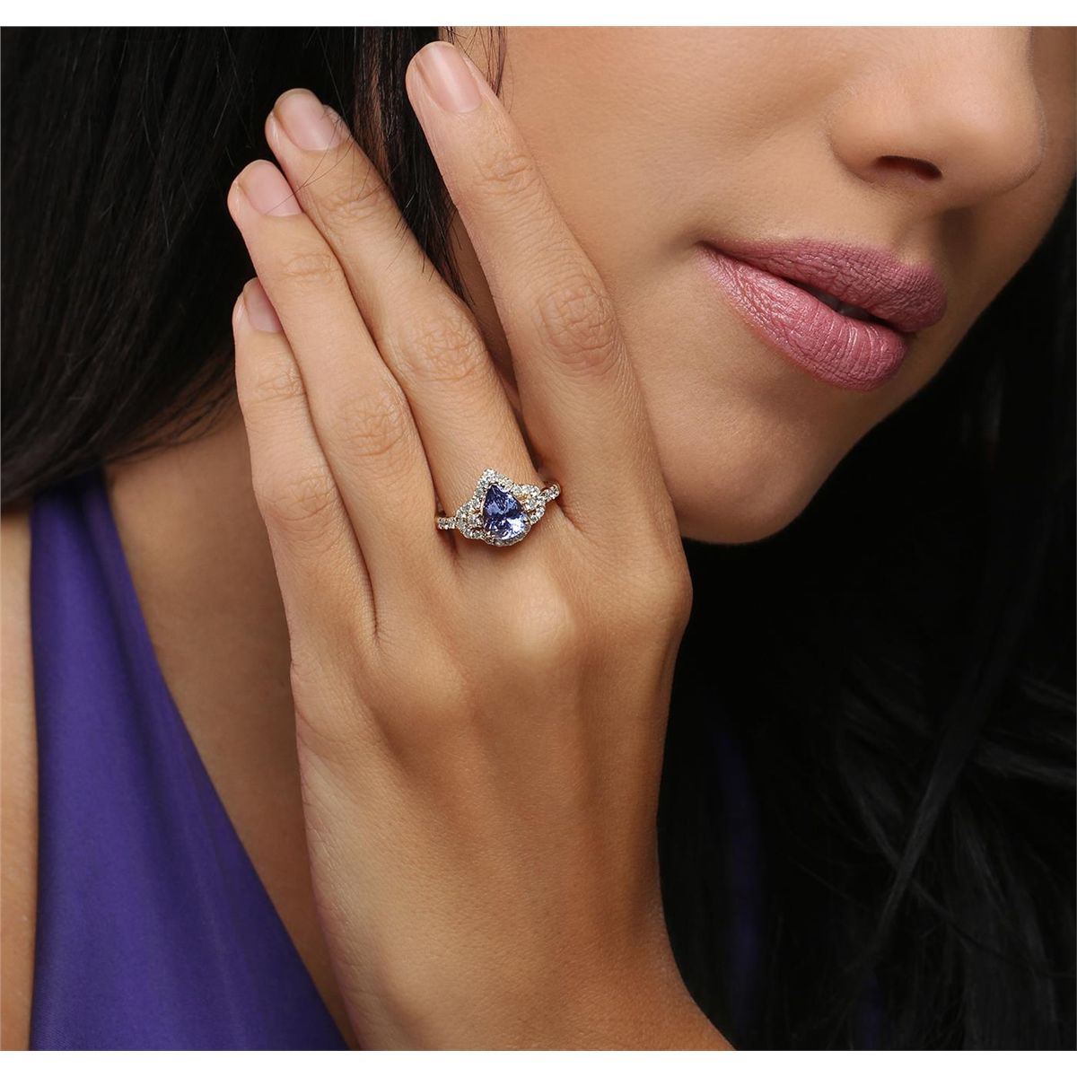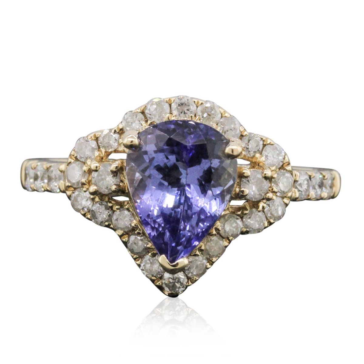 One electronically tested 14KT yellow gold ladies combination cast & assembled tanzanite and diamond ring with a flat shank with a bright polish finish. Identified with markings of "14K". Condition is new. Containing: One prong set pear modified brilliant cut natural tanzanite, measuring 9.00 x 6.91 x 3.46mm, approximate weight of 1.44ct., clarity is eye clean, type I, medium, very slightly grayish, violet color, (GIA V 5/3), cut is good. Thirty prong set round brilliant cut diamonds, measuring 1.90 - 1.50 x 1.02mm (depth est.) approximate total weight of 30 Stones = 0.40ct. Clarity: I-1 to I-2. Color: I - J, Cut is Good. Colored gemstones are presumed to have been subjected to commonly used enhancement processes. All diamonds and colored gemstones are graded in the mounting, unless otherwise stated. Total Weight of Colored Stones 1.44ct. Total Weight of Diamonds 0.40ct. Total Weight of Ring 3.60 grams. GGL Appraised at $4,130.00. AIGAppraised at $27,435.00.