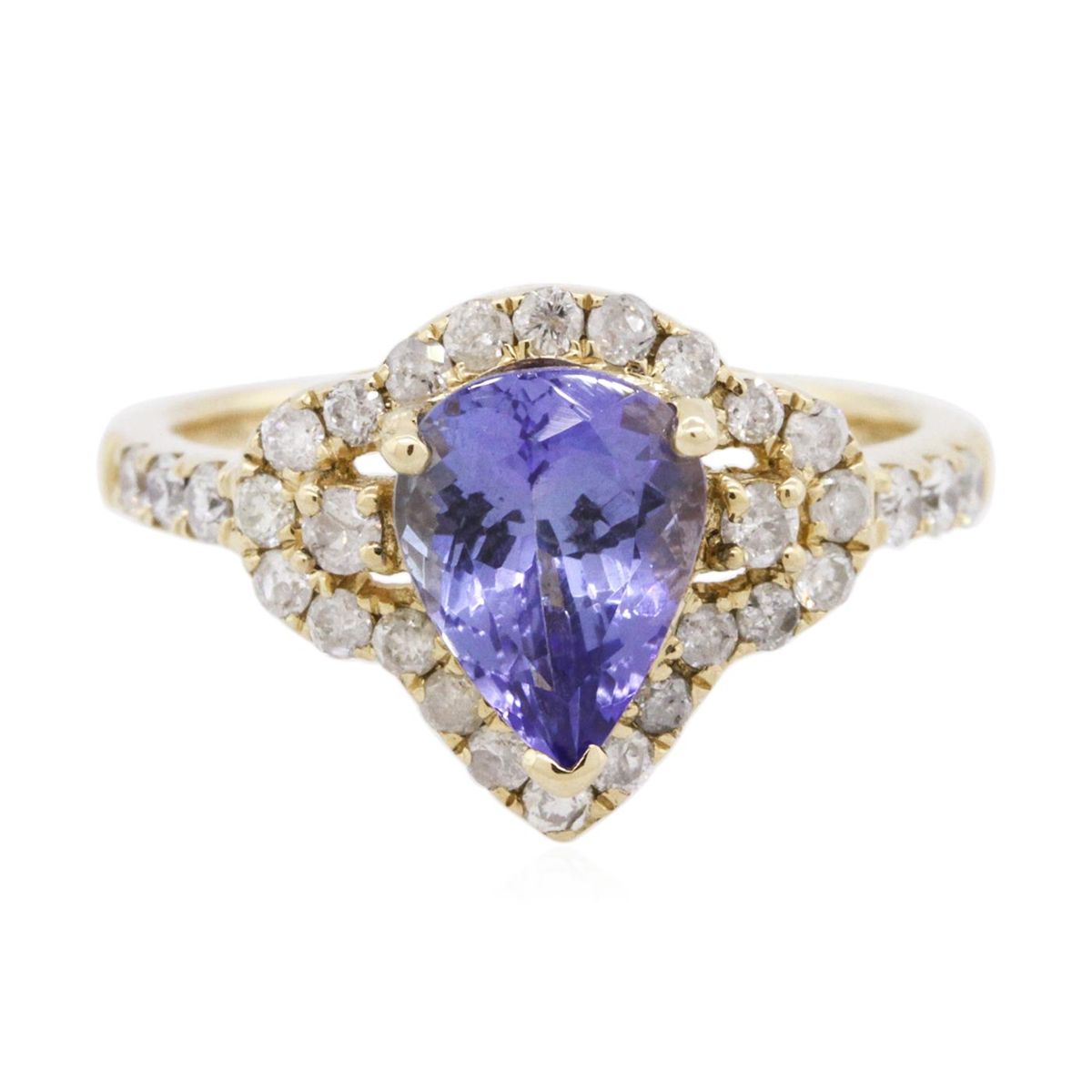 One electronically tested 14KT yellow gold ladies combination cast & assembled tanzanite and diamond ring with a flat shank with a bright polish finish. Identified with markings of "14K". Condition is new. Containing: One prong set pear modified brilliant cut natural tanzanite, measuring 9.00 x 6.91 x 3.46mm, approximate weight of 1.44ct., clarity is eye clean, type I, medium, very slightly grayish, violet color, (GIA V 5/3), cut is good. Thirty prong set round brilliant cut diamonds, measuring 1.90 - 1.50 x 1.02mm (depth est.) approximate total weight of 30 Stones = 0.40ct. Clarity: I-1 to I-2. Color: I - J, Cut is Good. Colored gemstones are presumed to have been subjected to commonly used enhancement processes. All diamonds and colored gemstones are graded in the mounting, unless otherwise stated. Total Weight of Colored Stones 1.44ct. Total Weight of Diamonds 0.40ct. Total Weight of Ring 3.60 grams. GGL Appraised at $4,130.00.
