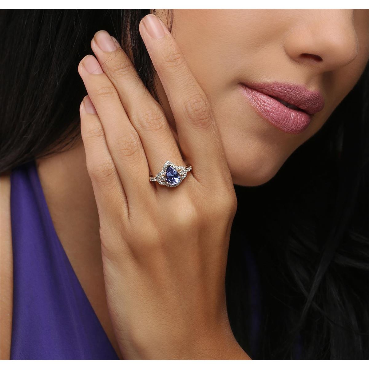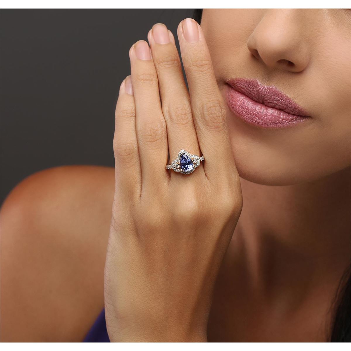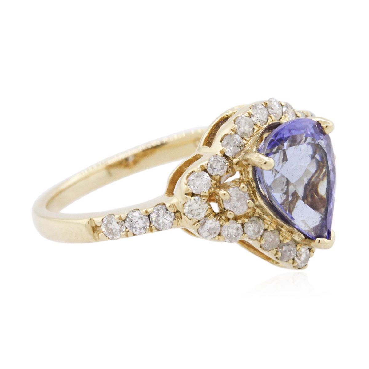 One electronically tested 14KT yellow gold ladies combination cast & assembled tanzanite and diamond ring with a flat shank with a bright polish finish. Identified with markings of "14K". Condition is new. Containing: One prong set pear modified brilliant cut natural tanzanite, measuring 9.00 x 6.91 x 3.46mm, approximate weight of 1.44ct., clarity is eye clean, type I, medium, very slightly grayish, violet color, (GIA V 5/3), cut is good. Thirty prong set round brilliant cut diamonds, measuring 1.90 - 1.50 x 1.02mm (depth est.) approximate total weight of 30 Stones = 0.40ct. Clarity: I-1 to I-2. Color: I - J, Cut is Good. Colored gemstones are presumed to have been subjected to commonly used enhancement processes. All diamonds and colored gemstones are graded in the mounting, unless otherwise stated. Total Weight of Colored Stones 1.44ct. Total Weight of Diamonds 0.40ct. Total Weight of Ring 3.60 grams. GGL Appraised at $4,130.00.