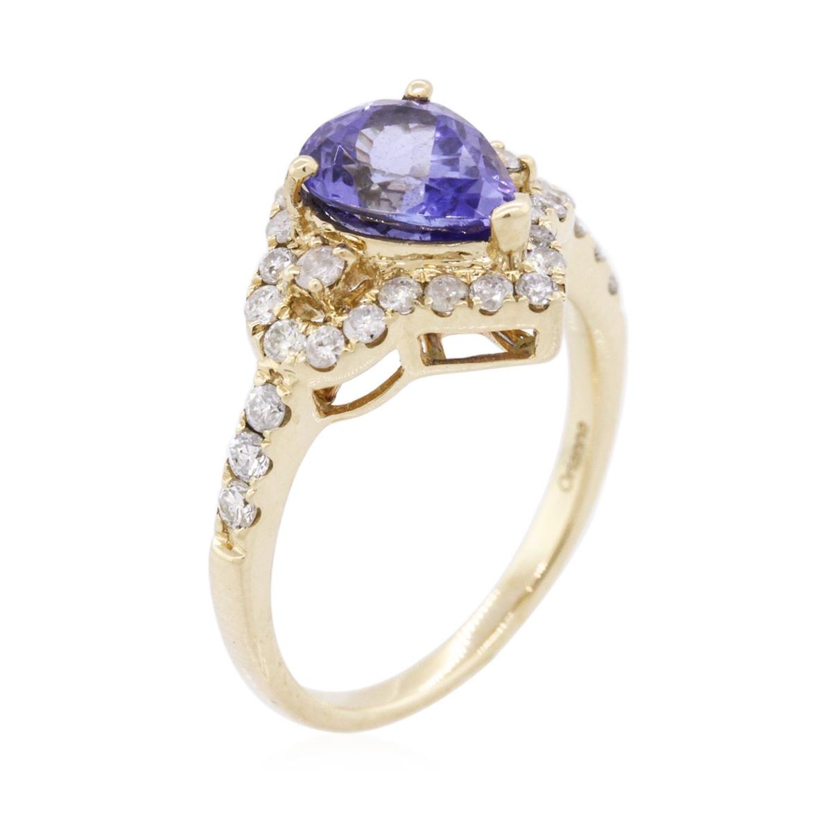 One electronically tested 14KT yellow gold ladies combination cast & assembled tanzanite and diamond ring with a flat shank with a bright polish finish. Identified with markings of "14K". Condition is new. Containing: One prong set pear modified brilliant cut natural tanzanite, measuring 9.00 x 6.91 x 3.46mm, approximate weight of 1.44ct., clarity is eye clean, type I, medium, very slightly grayish, violet color, (GIA V 5/3), cut is good. Thirty prong set round brilliant cut diamonds, measuring 1.90 - 1.50 x 1.02mm (depth est.) approximate total weight of 30 Stones = 0.40ct. Clarity: I-1 to I-2. Color: I - J, Cut is Good. Colored gemstones are presumed to have been subjected to commonly used enhancement processes. All diamonds and colored gemstones are graded in the mounting, unless otherwise stated. Total Weight of Colored Stones 1.44ct. Total Weight of Diamonds 0.40ct. Total Weight of Ring 3.60 grams. GGL Appraised at $4,130.00.