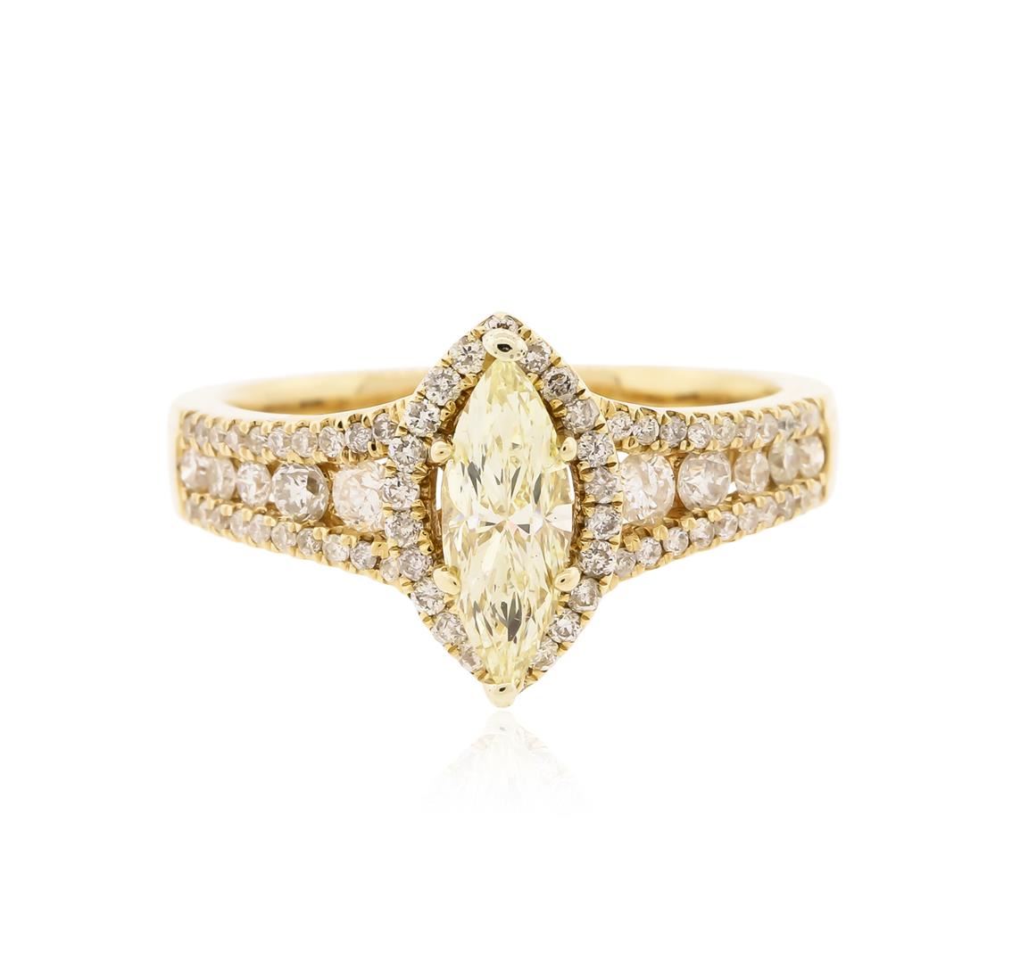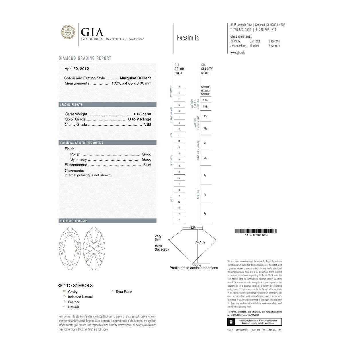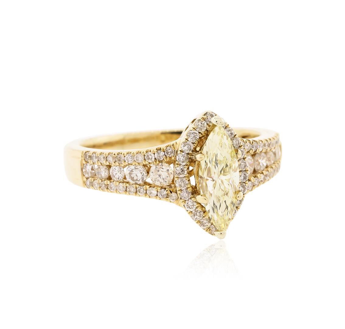 One electronically tested 14KT yellow gold ladies cast diamond unity ring with a bright polish finish. Condition is new, good workmanship. The featured diamond is set within a diamond bezel supported by diamond set shoulders, completed by a two millimeter wide band. Ring size 7.25. Identified with markings of "14K". Containing: One prong set marquise shaped cut diamond, measuring 10.78 x 4.05 x 3.00mm (depth est.) exact weight 0.68ct with a faint fluorescence. GIA Diamond Grading Report attached. Graded loose prior to setting in the GIA Laboratory, Report #2141611794. Clarity VS-2. Color U - V Ten channel set round brilliant cut diamonds, measuring 2.50 - 1.60 x 1.23mm (depth est.) approximate total weight of 10 Stones = 0.40ct. Graded in the setting. Clarity SI-2 to 1-2. Color G - I Sixty-two prong set round brilliant cut diamonds, measuring 1.20 - 1.00 x 0.66mm (depth est.) approximate total weight of 62 Stones = 0.40ct. Graded in the setting. Clarity I-1 to 1-2. Color G - I. Total Weight of Diamonds 1.48ct. Total Weight of Ring 4.74gm. AIG Appraised at $5,605.00.