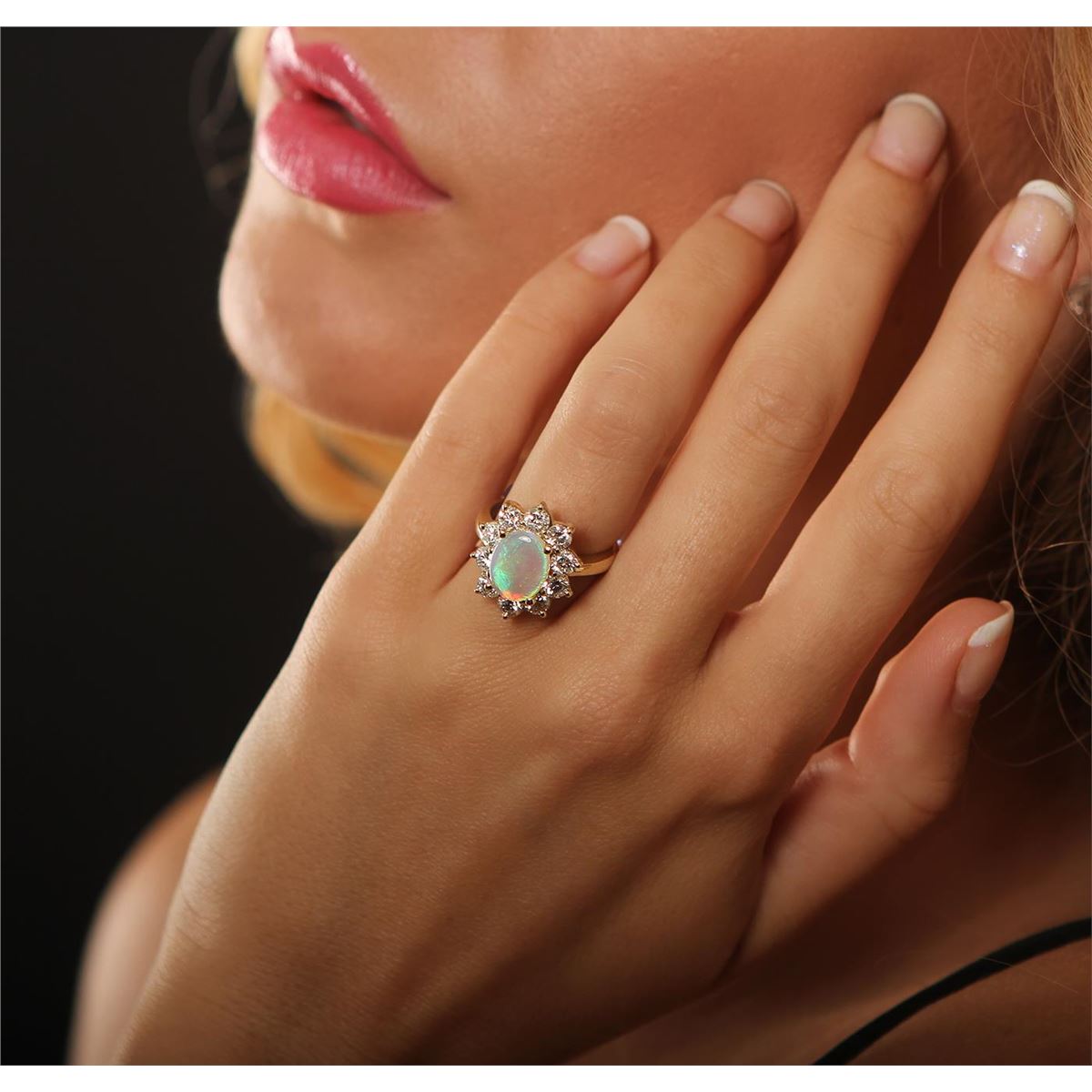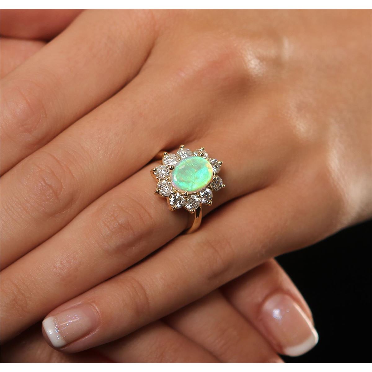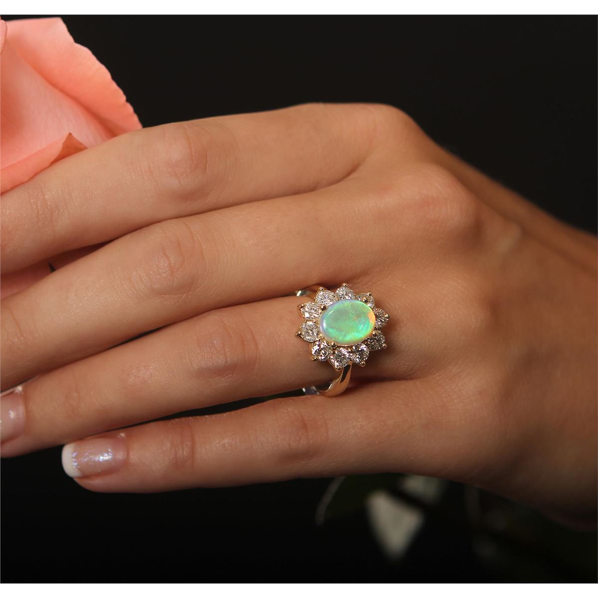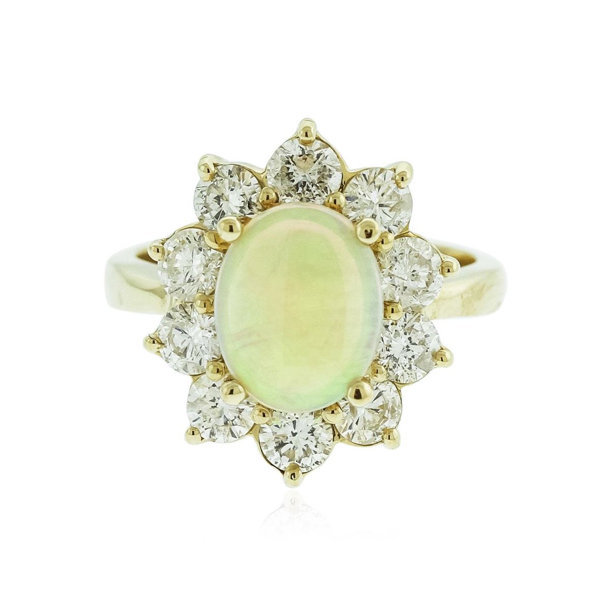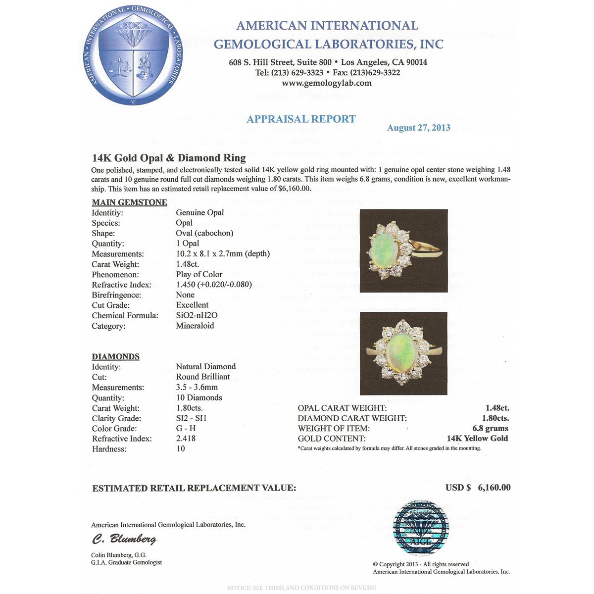 One polished, stamped, and electronically tested solid 14K yellow gold ring mounted with: 1 genuine opal center stone weighing 1.48 carats and 10 genuine round full cut diamonds weighing 1.80 carats. This item weighs 6.8 grams, condition is new, excellent workmanship. AIGL Appraised at $6,160.00.