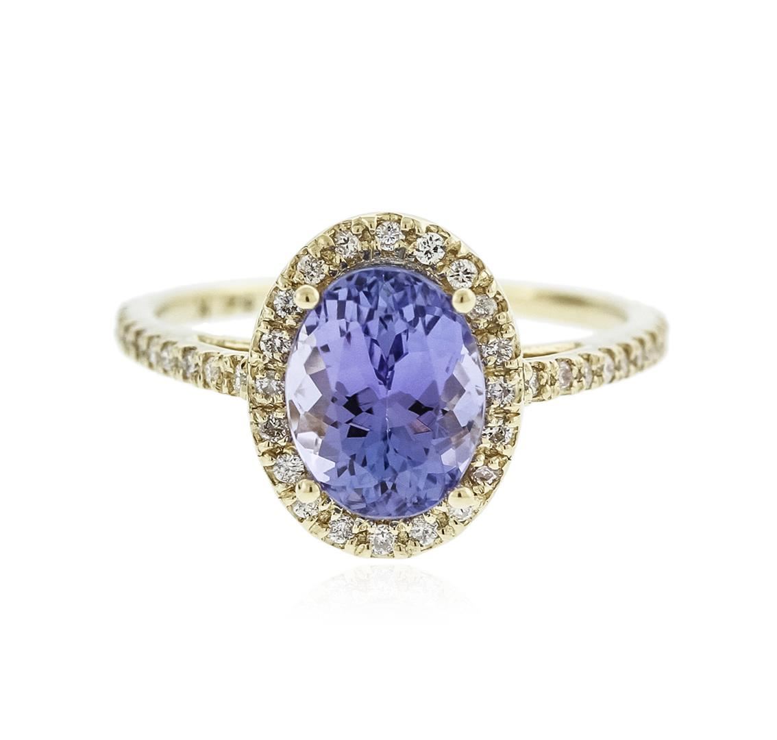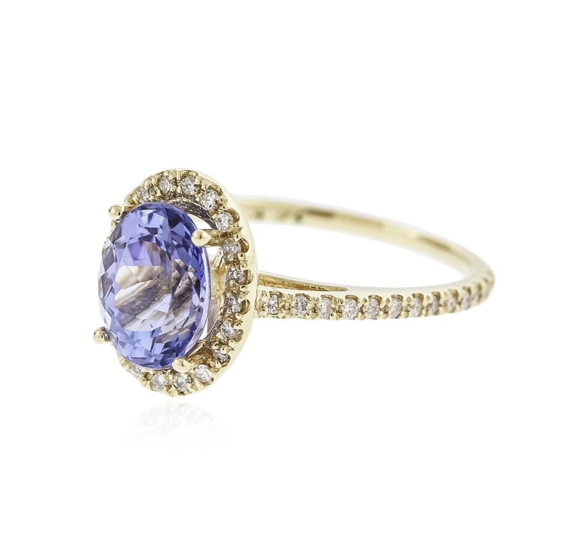 One electronically tested 14KT yellow gold ladies cast tanzanite and diamond ring with a bright polish finish. Identified with markings of "K14". Condition is new. Containing: One prong set oval modified brilliant cut natural tanzanite, measuring 8.80 x 6.80 x 3.57mm, approximate weight of 1.50ct., clarity is eye clean, type I, medium light, very slightly grayish, violet color, (GIA V 4/3), cut is good. Forty-Six prong set round brilliant cut diamonds, measuring 1.20 - 1.10 x 0.69mm (depth est.) approximate total weight of 46 Stones = 0.25ct. Clarity: SI-2 to I-2. Color: I - J, Cut is Good. Colored gemstones are presumed to have been subjected to commonly used enhancement processes. All diamonds and colored gemstones are graded in the mounting, unless otherwise stated. Total Weight of Colored Stones 1.50ct. Total Weight of Diamonds 0.25ct. Total Weight of Ring 2.90 grams. GGL Appraised at $2,435.00.