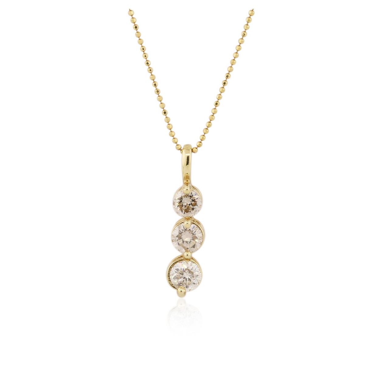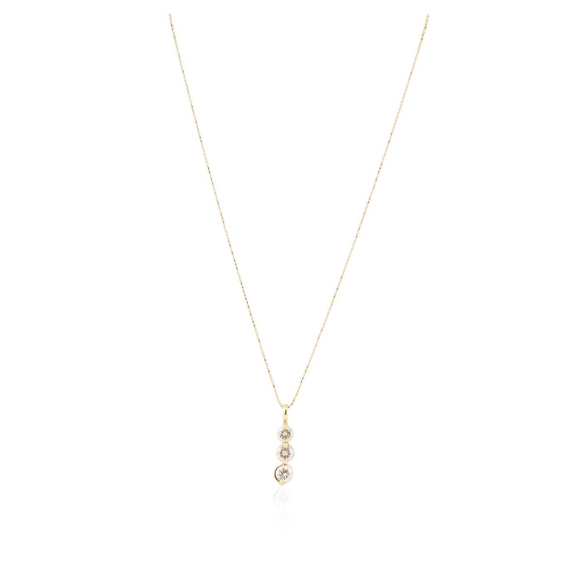 One electronically tested 14KT yellow gold ladies cast diamond pendant & chain 16.0" long, with a lobster claw clasp with a bright polish finish. Identified with markings of "14K". Condition is new. Containing: Three prong set round brilliant cut diamonds, measuring 5.50 - 4.80 x 3.09mm (depth est.) approximate total weight of 3 Stones = 1.50ct. Clarity: I-1, Cut is Good. All diamonds are graded in the mounting, unless otherwise stated. Total Weight of Diamonds 1.50ct. Total Weight of Pendant & Chain 3.90 grams. GGL Appraised at $4,235.00.