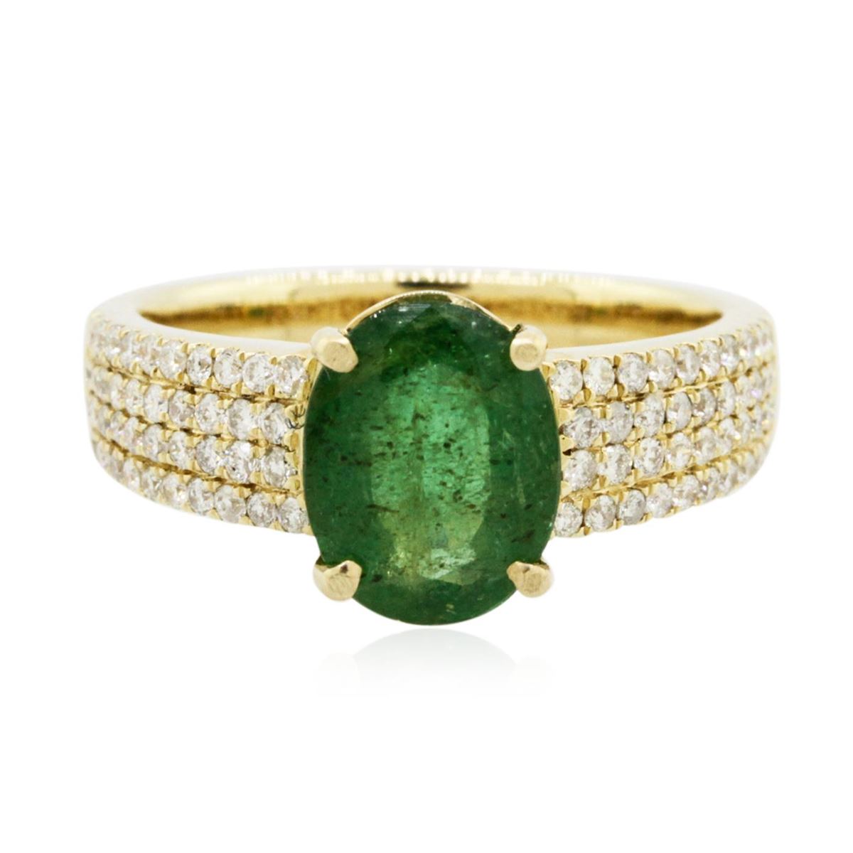 One electronically tested 14KT yellow gold Ladies combination cast & assembled ring with a bright polish finish. Condition is new. Identified with markings of "14K". Containing: One prong set oval modified brilliant cut natural emerald, measuring 9.40 x 7.60 x 3.86mm, approximate weight of 1.52ct., clarity is moderately included, type III, medium, moderately strong, green color, (GIA G 5/4), cut is good. Colored gemstones are presumed to have been subjected to commonly used color/clarity enhancement processes. Eighty prong set round brilliant cut diamonds, measuring 1.00. - 1.00. x 0.60mm (depth est.) approximate. Total Weight of 80 Stones = 0.29ct. . Clarity: I-1 to I-2. Color: I - J, Cut is Good. . Total Weight of Colored Stones 1.52ct. Total Weight of Diamonds 0.29ct. Total Weight of Ring 4.90 grams. GGL Appraised at $5,305.00.