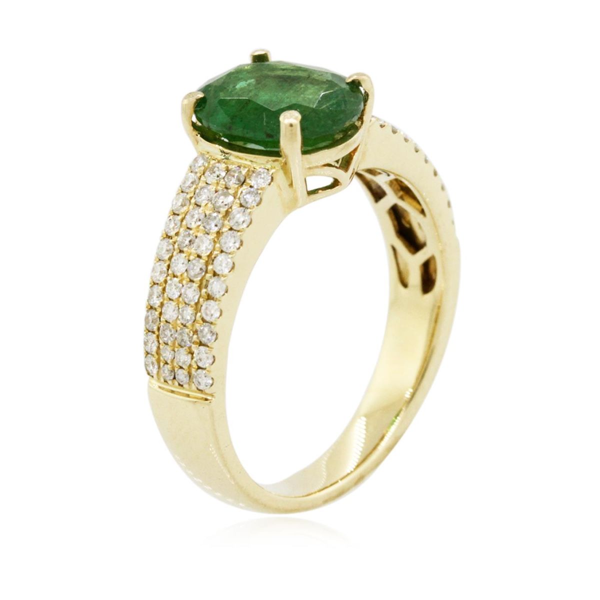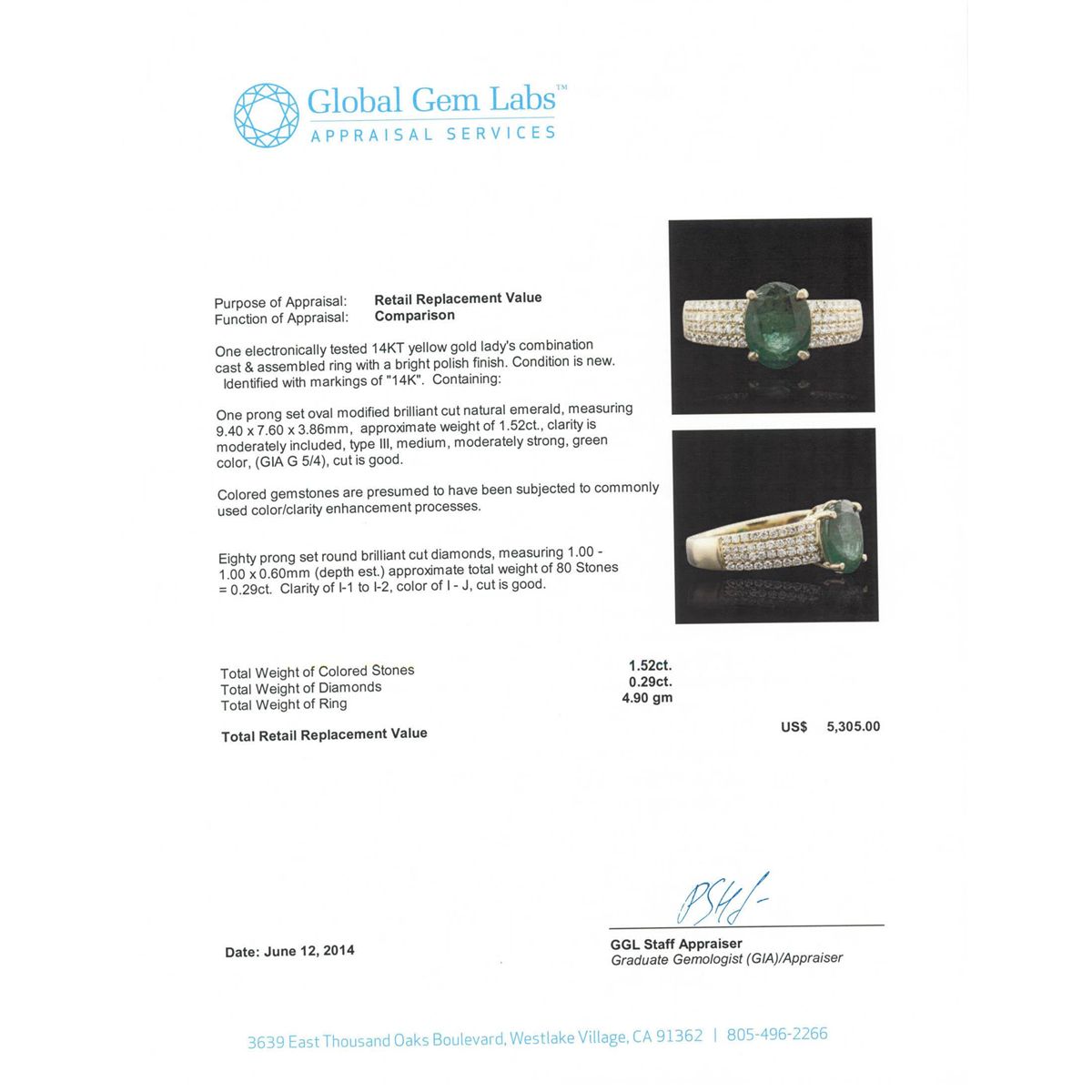 One electronically tested 14KT yellow gold Ladies combination cast & assembled ring with a bright polish finish. Condition is new. Identified with markings of "14K". Containing: One prong set oval modified brilliant cut natural emerald, measuring 9.40 x 7.60 x 3.86mm, approximate weight of 1.52ct., clarity is moderately included, type III, medium, moderately strong, green color, (GIA G 5/4), cut is good. Colored gemstones are presumed to have been subjected to commonly used color/clarity enhancement processes. Eighty prong set round brilliant cut diamonds, measuring 1.00. - 1.00. x 0.60mm (depth est.) approximate. Total Weight of 80 Stones = 0.29ct. . Clarity: I-1 to I-2. Color: I - J, Cut is Good. . Total Weight of Colored Stones 1.52ct. Total Weight of Diamonds 0.29ct. Total Weight of Ring 4.90 grams. GGL Appraised at $5,305.00.