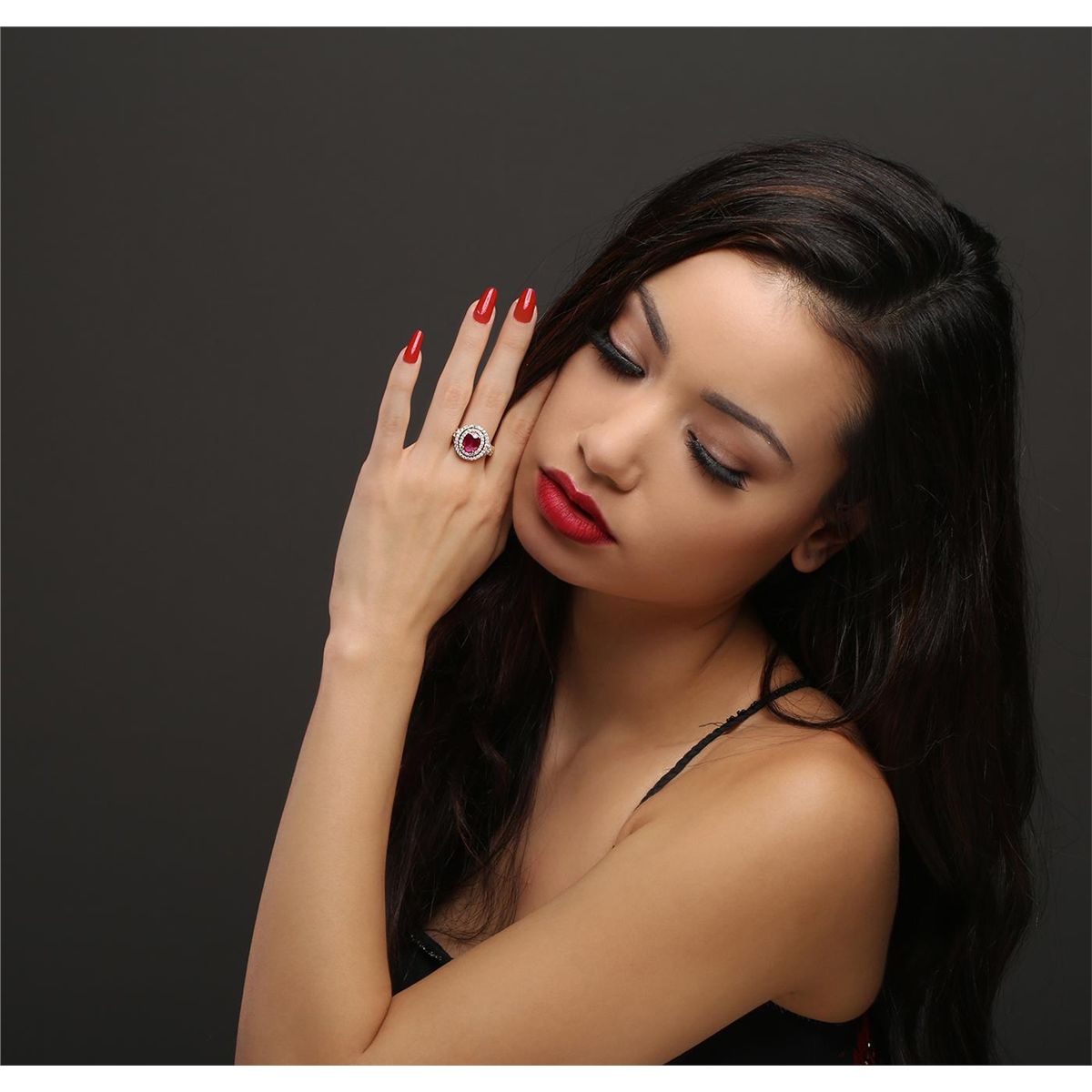 One electronically tested 14KT yellow gold Ladies combination cast & assembled ring with a bright polish finish. Condition is new. Identified with markings of "14K". Containing: One prong set oval modified brilliant cut natural ruby, measuring 9.40 x 7.50 x 2.70mm, approximate weight of 1.54ct., clarity is moderately included, type II, medium dark, moderately strong, strongly purplish red color, (GIA stpR 6/4), cut is good. Colored gemstones are presumed to have been subjected to commonly used color/clarity enhancement processes. Sixty-Eight prong set round brilliant cut diamonds, measuring 1.40 - 1.40 x 0.84mm (depth est.) approximate. Total Weight of 68 Stones = 0.68ct. Clarity: I-1 to I-2. Color: I - J, Cut is Good. Two prong set round brilliant cut diamonds, measuring 2.00 - 2.00 x 1.20mm (depth est.) approximate. Total Weight of 2 Stones = 0.06ct. Clarity: SI-1 to SI-2. Color: I - J, Cut is Good. Total Weight of Colored Stones 1.54ct. Total Weight of Diamonds 0.74ct. Total Weight of Ring 5.50 grams. GGL Appraised at $4,110.00.