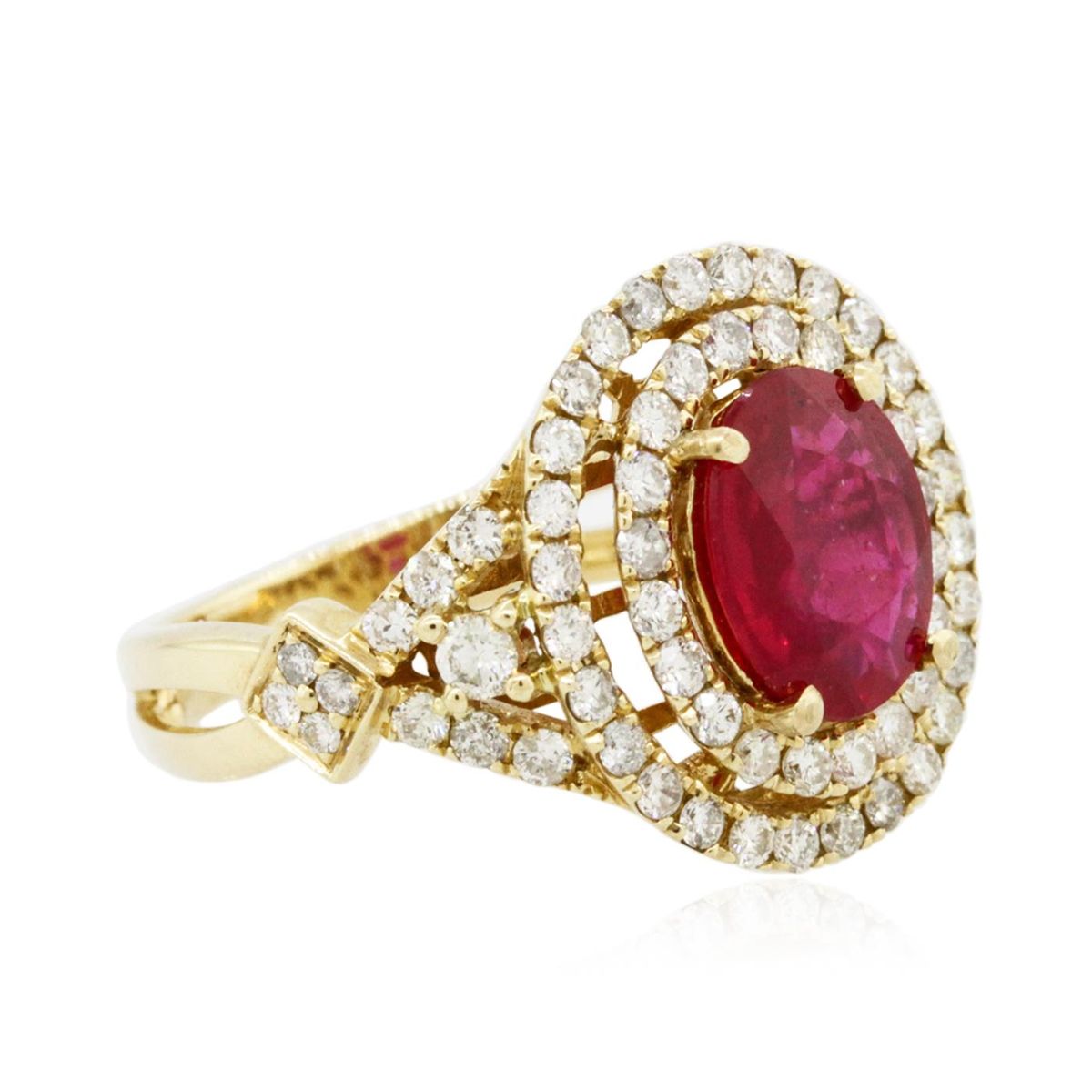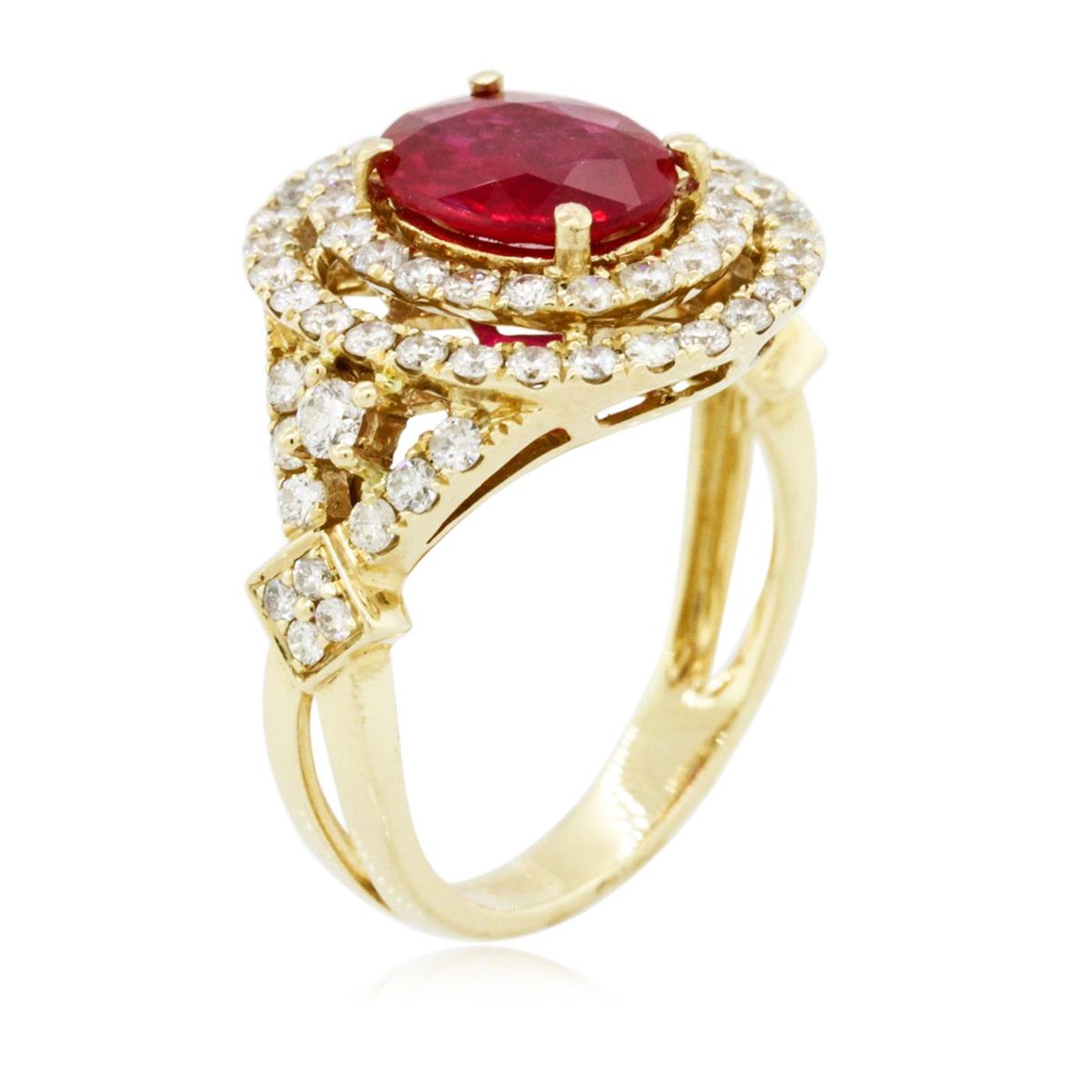 One electronically tested 14KT yellow gold Ladies combination cast & assembled ring with a bright polish finish. Condition is new. Identified with markings of "14K". Containing: One prong set oval modified brilliant cut natural ruby, measuring 9.40 x 7.50 x 2.70mm, approximate weight of 1.54ct., clarity is moderately included, type II, medium dark, moderately strong, strongly purplish red color, (GIA stpR 6/4), cut is good. Colored gemstones are presumed to have been subjected to commonly used color/clarity enhancement processes. Sixty-Eight prong set round brilliant cut diamonds, measuring 1.40 - 1.40 x 0.84mm (depth est.) approximate. Total Weight of 68 Stones = 0.68ct. Clarity: I-1 to I-2. Color: I - J, Cut is Good. Two prong set round brilliant cut diamonds, measuring 2.00 - 2.00 x 1.20mm (depth est.) approximate. Total Weight of 2 Stones = 0.06ct. Clarity: SI-1 to SI-2. Color: I - J, Cut is Good. Total Weight of Colored Stones 1.54ct. Total Weight of Diamonds 0.74ct. Total Weight of Ring 5.50 grams. GGL Appraised at $4,110.00.