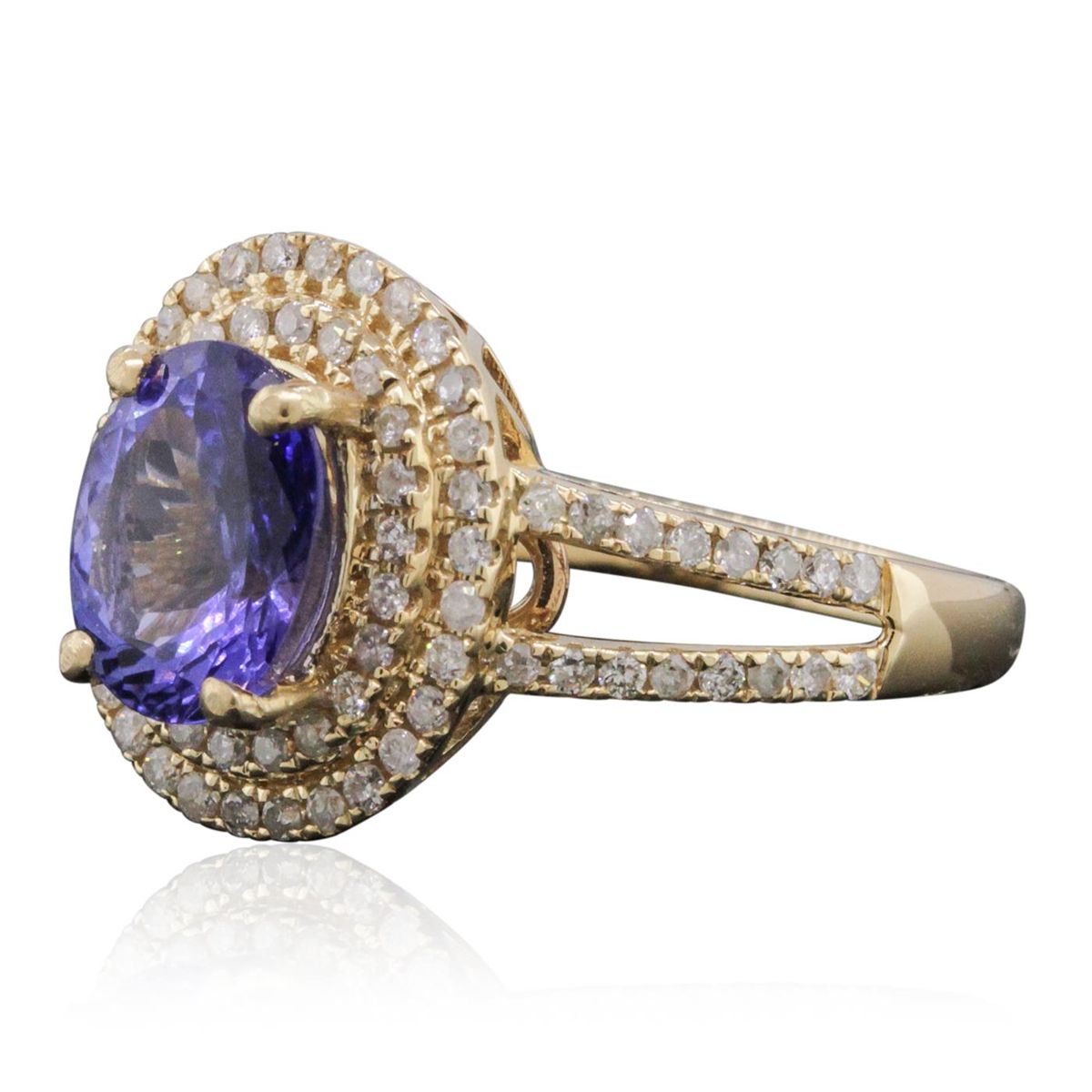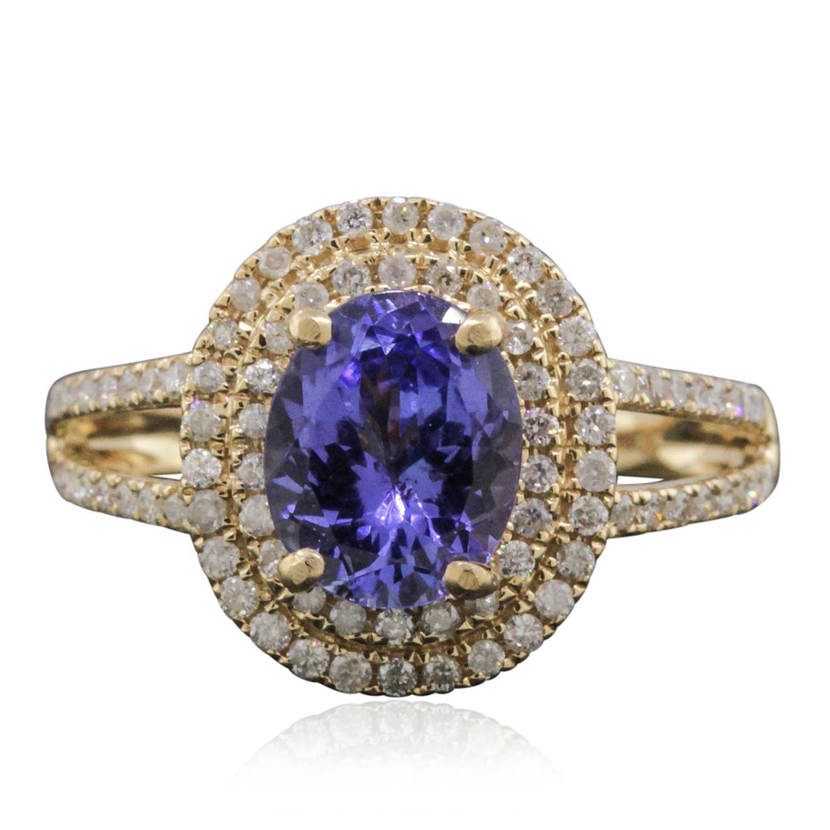 One electronically tested 14KT yellow gold ladies combination cast & assembled tanzanite and diamond ring with a split shank with a bright polish finish. Identified with markings of "14K". Condition is new. Containing: One prong set oval modified brilliant cut natural tanzanite, measuring 8.55 x 6.50 x 4.06mm, approximate weight of 1.54ct., clarity is eye clean, type I, medium light, very slightly grayish, violet color, (GIA V 4/3), cut is good. Sixty-Four prong set round brilliant cut diamonds, measuring 1.80 - 1.50 x 0.99mm (depth est.) approximate total weight of 64 Stones = 1.05ct. Clarity: I-1 to I-2. Color: I - J, Cut is Good. Colored gemstones are presumed to have been subjected to commonly used enhancement processes. All diamonds and colored gemstones are graded in the mounting, unless otherwise stated. Total Weight of Colored Stones 1.54ct. Total Weight of Diamonds 1.05ct. Total Weight of Ring 3.60 grams. GGL Appraised at $5,100.00.