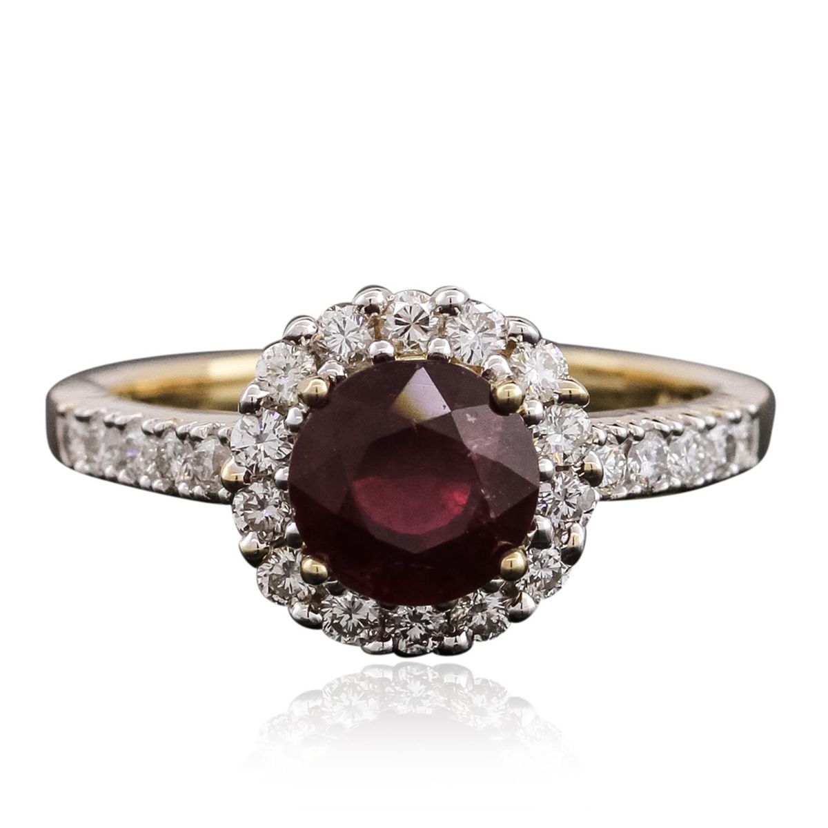 One electronically tested 14KT yellow gold ladies cast ruby and diamond ring. The featured ruby is set within a diamond bezel supported by diamond set shoulders, completed by a one and one-half millimeter wide band. Bright polish finish with rhodium accents. Trademark is Orianne. Identified with markings of "14K". Condition is new, good workmanship. Containing: One prong set round brilliant cut natural ruby, measuring 6.70 - 6.60 x 3.95 mm, 9% bulge factor, approximate weight of 1.55ct., clarity is heavily included, type II, dark, very slightly brownish, slightly purplish red color, (GIA slpR 7/3), cut is good. Transmitting light somewhat diffusely, transparent to translucent. Naturally occurring internal & external characteristics are present. Indications of laboratory high temperature heat treatment, with glass & flux additives. Graded in the setting. Ruby has a low tolerance to rhodium plating, repolishing the surface, & ultrasonic cleaning. Twenty-Four prong set round brilliant cut diamonds, measuring 2.00 - 1.90 x 1.17mm (depth est.) approximate total weight of 24 Stones = 0.75ct. Graded in the setting. Clarity: SI-1 to I-1. Color: G - I. Total Weight of Colored Stones 1.55ct. Total Weight of Diamonds 0.75ct. Total Weight of Ring 4.18 grams. AIG Appraised at $3,170.00.