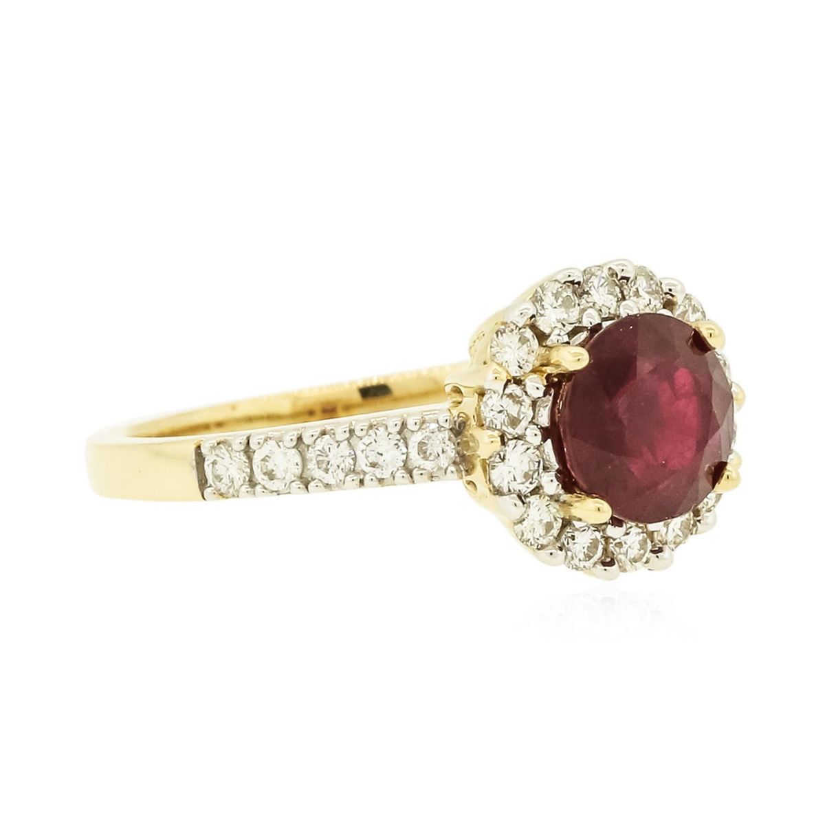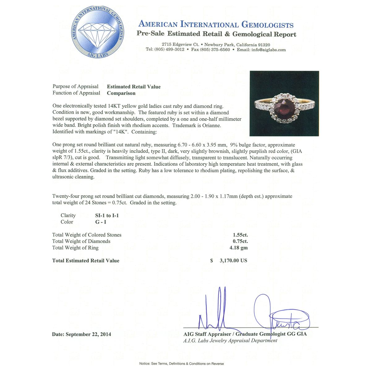 One electronically tested 14KT yellow gold ladies cast ruby and diamond ring. The featured ruby is set within a diamond bezel supported by diamond set shoulders, completed by a one and one-half millimeter wide band. Bright polish finish with rhodium accents. Trademark is Orianne. Identified with markings of "14K". Condition is new, good workmanship. Containing: One prong set round brilliant cut natural ruby, measuring 6.70 - 6.60 x 3.95 mm, 9% bulge factor, approximate weight of 1.55ct., clarity is heavily included, type II, dark, very slightly brownish, slightly purplish red color, (GIA slpR 7/3), cut is good. Transmitting light somewhat diffusely, transparent to translucent. Naturally occurring internal & external characteristics are present. Indications of laboratory high temperature heat treatment, with glass & flux additives. Graded in the setting. Ruby has a low tolerance to rhodium plating, repolishing the surface, & ultrasonic cleaning. Twenty-Four prong set round brilliant cut diamonds, measuring 2.00 - 1.90 x 1.17mm (depth est.) approximate total weight of 24 Stones = 0.75ct. Graded in the setting. Clarity: SI-1 to I-1. Color: G - I. Total Weight of Colored Stones 1.55ct. Total Weight of Diamonds 0.75ct. Total Weight of Ring 4.18 grams. AIG Appraised at $3,170.00.