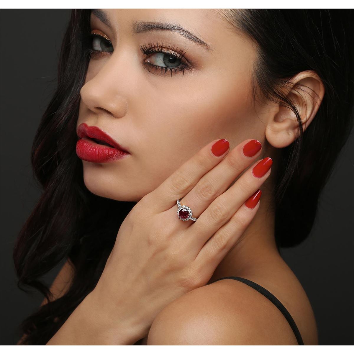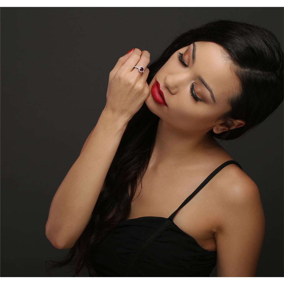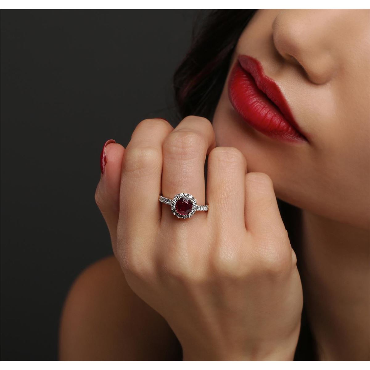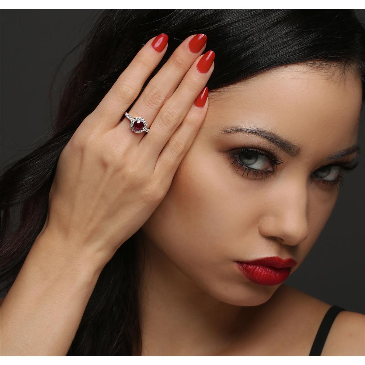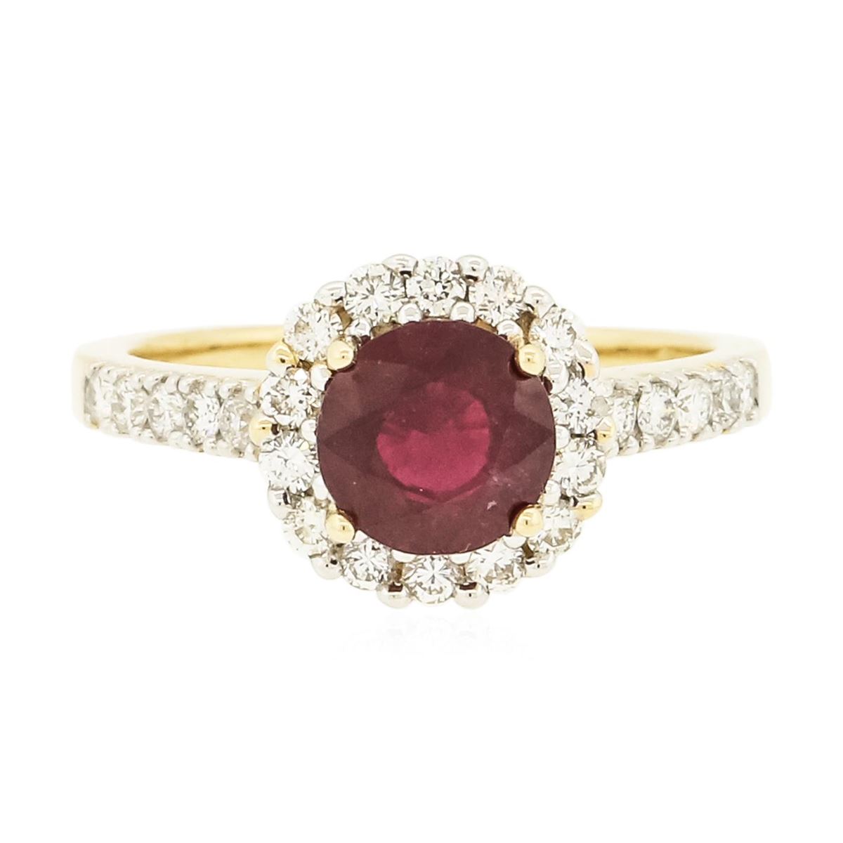 One electronically tested 14KT yellow gold ladies cast ruby and diamond ring. The featured ruby is set within a diamond bezel supported by diamond set shoulders, completed by a one and one-half millimeter wide band. Bright polish finish with rhodium accents. Trademark is Orianne. Identified with markings of "14K". Condition is new, good workmanship. Containing: One prong set round brilliant cut natural ruby, measuring 6.70 - 6.60 x 3.95 mm, 9% bulge factor, approximate weight of 1.55ct., clarity is heavily included, type II, dark, very slightly brownish, slightly purplish red color, (GIA slpR 7/3), cut is good. Transmitting light somewhat diffusely, transparent to translucent. Naturally occurring internal & external characteristics are present. Indications of laboratory high temperature heat treatment, with glass & flux additives. Graded in the setting. Ruby has a low tolerance to rhodium plating, repolishing the surface, & ultrasonic cleaning. Twenty-Four prong set round brilliant cut diamonds, measuring 2.00 - 1.90 x 1.17mm (depth est.) approximate total weight of 24 Stones = 0.75ct. Graded in the setting. Clarity: SI-1 to I-1. Color: G - I. Total Weight of Colored Stones 1.55ct. Total Weight of Diamonds 0.75ct. Total Weight of Ring 4.18 grams. AIG Appraised at $3,170.00.