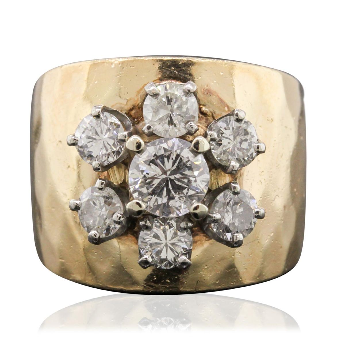 One electronically tested 14KT yellow gold Ladies combination cast & assembled ring with a bright polish finish. Condition is very good. Containing: One prong set round brilliant cut diamond, measuring 5.50 - 5.50 x 3.30mm (depth est.) approximate weight of 0.61ct. Clarity: I-1. Color: J, Cut is Good. Six prong set round brilliant cut diamonds, measuring 3.50 - 3.50 x 2.10mm (depth est.) approximate. Total Weight of 6 Stones = 0.94ct. Clarity: SI-2 to I-1. Color: I - J, Cut is Good. All diamonds are graded in the mounting, unless otherwise stated. Total Weight of Diamonds 1.55ct. Total Weight of Ring 13.40 grams. GGL Appraised at $7,700.00.