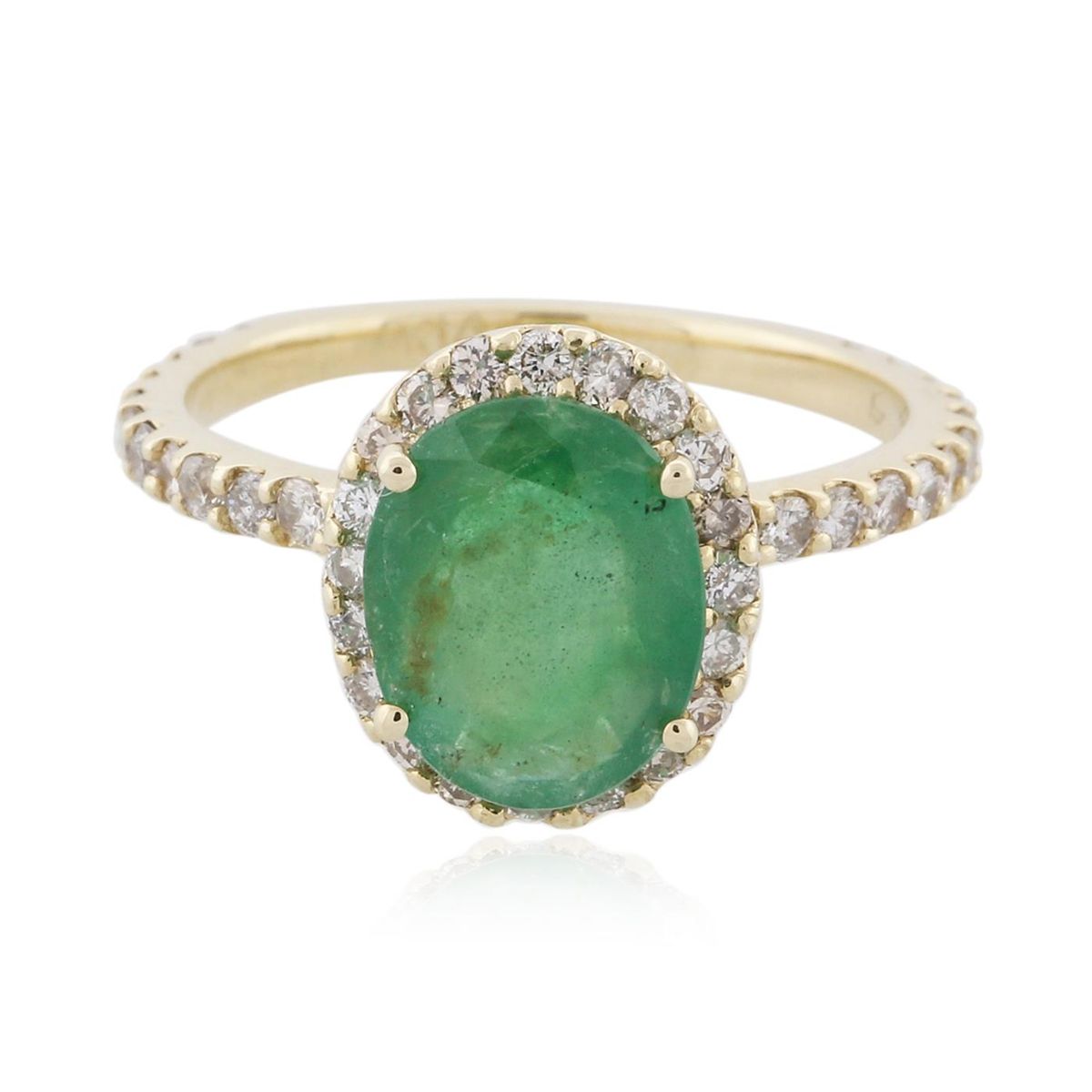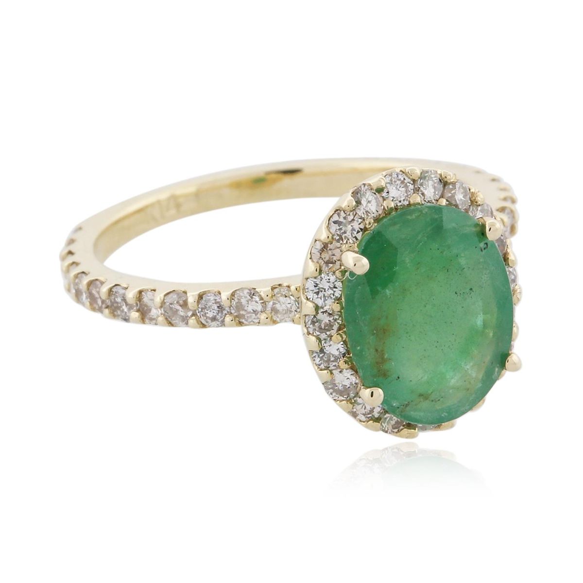 One electronically tested 14KT yellow gold Ladies combination cast & assembled fashion ring with a high polish finish. Condition is new. Identified with markings of "14K". Containing: One prong set oval modified mixed cut natural emerald, measuring 9.80 x 7.80 x 3.70mm, approximate weight of 1.56ct., clarity is heavily included, type III, medium light, very slightly grayish, very slightly bluish green color, (GIA vslbG 4/3), cut is good. Colored gemstones are presumed to have been subjected to commonly used and possible undetectable color/clarity enhancement processes. Forty-Four prong set round brilliant cut diamonds, measuring 1.50 - 1.50 x 0.90mm (depth est.) approximate total weight of 44 Stones = 0.54ct. Clarity of SI-2 to I-2, Color of J - L, Cut is Good. Total Weight of Colored Stones 1.56ct. Total Weight of Diamonds 0.54ct. Total Weight of Ring 3.00 grams. GGL Appraised at $5,140.00.