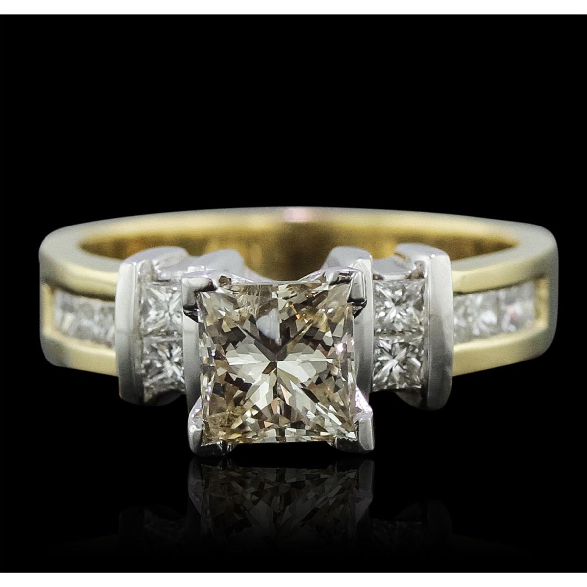 One electronically tested 14KT yellow gold Ladies combination cast & assembled engagement ring with a bright polish finish. Condition is new. Identified with markings of "14K". Containing: One prong set princess cut diamond, measuring 5.80 x 5.80 x 4.35mm (depth est.) approximate weight of 1.20ct. Clarity: I-1. Color: M, Cut is Good. Twelve channel set princess cut diamonds, measuring 1.70 x 1.70 x 1.28mm (depth est.) approximate total weight of 12 Stones = 0.36ct. Clarity: SI-1 to SI-2. Color: I, Cut is Good. All diamonds are graded in the mounting, unless otherwise stated. Total Weight of Diamonds 1.56ct. Total Weight of Engagement Ring 6.10 grams. GGL Appraised at $8,980.00.
