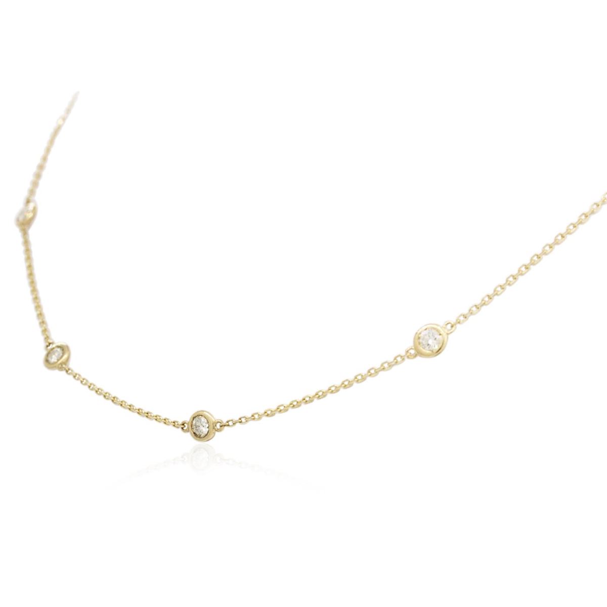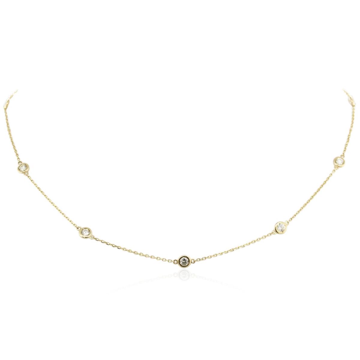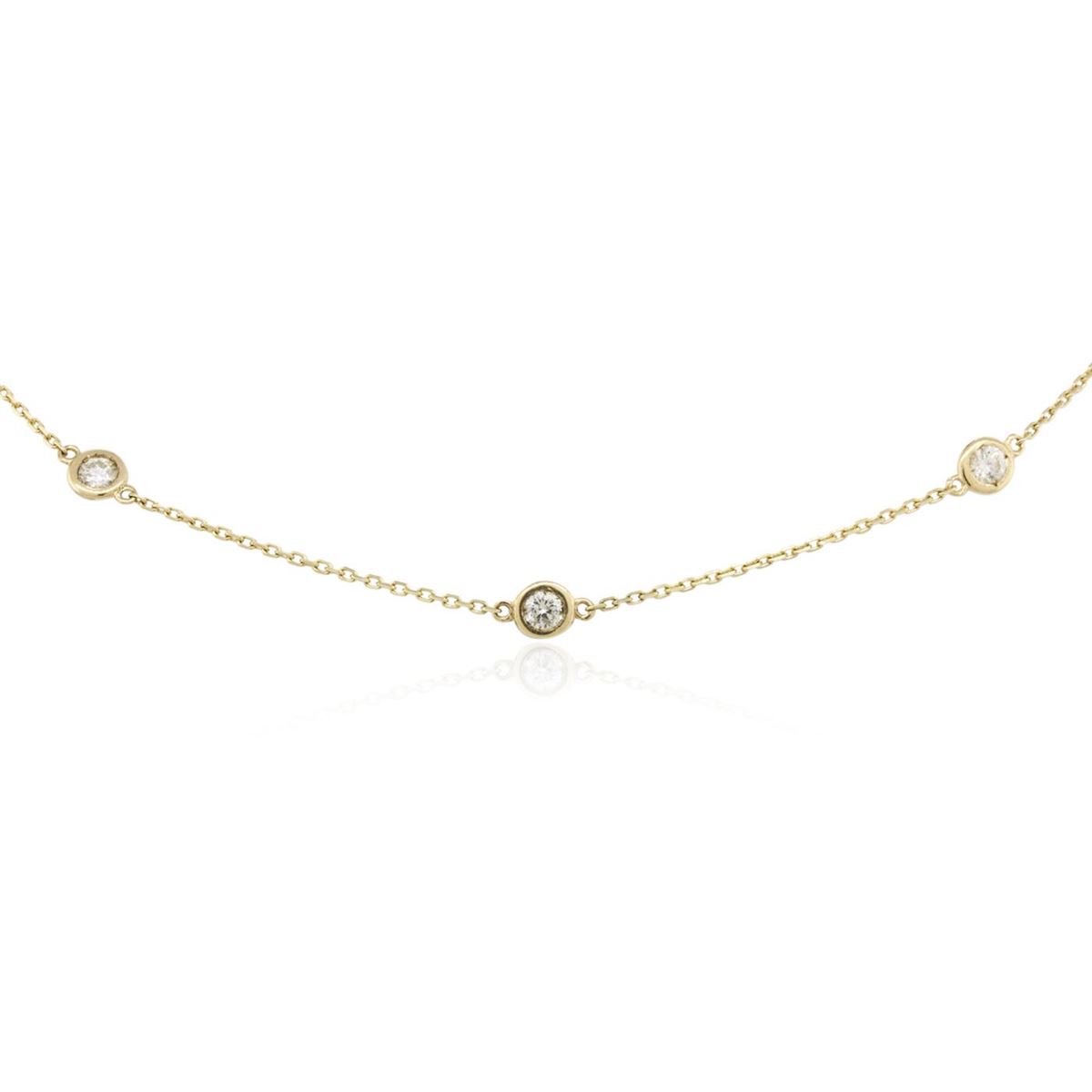 One electronically tested 14KT yellow gold ladies cast diamond necklace with a lobster claw clasp with a bright polish finish. Measurements: 18" in length Identified with markings of "K14". Condition is new. Containing: Ten bezel set round brilliant cut diamonds, measuring 3.50 - 3.50 x 2.10mm (depth est.) approximate total weight of 10 Stones = 1.57ct. Clarity: SI-1 to I-1. Color: J - K, Cut is Good. All diamonds are graded in the mounting, unless otherwise stated. Total Weight of Diamonds 1.57ct. Total Weight of Necklace 4.10 grams. GGL Appraised at $4,300.00.