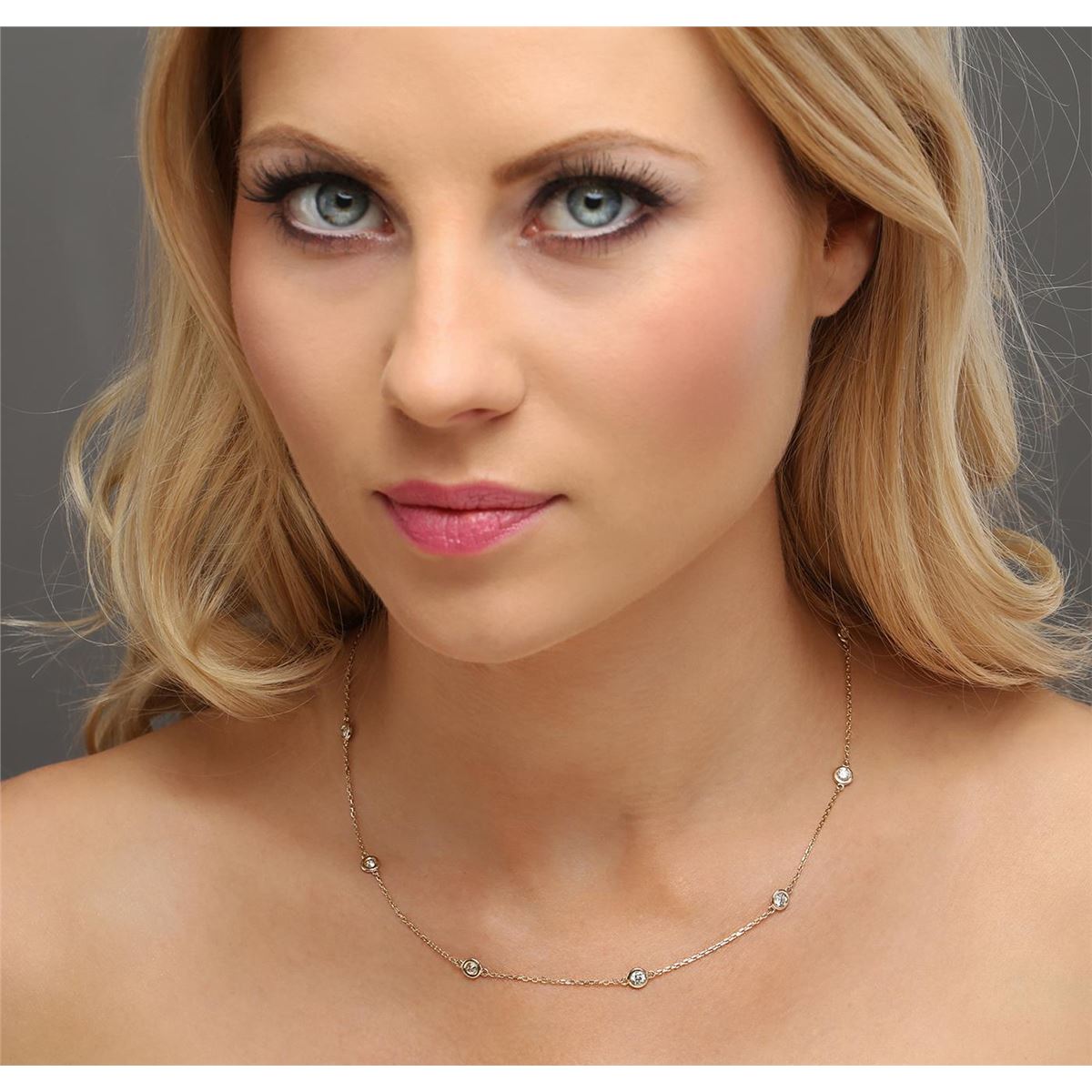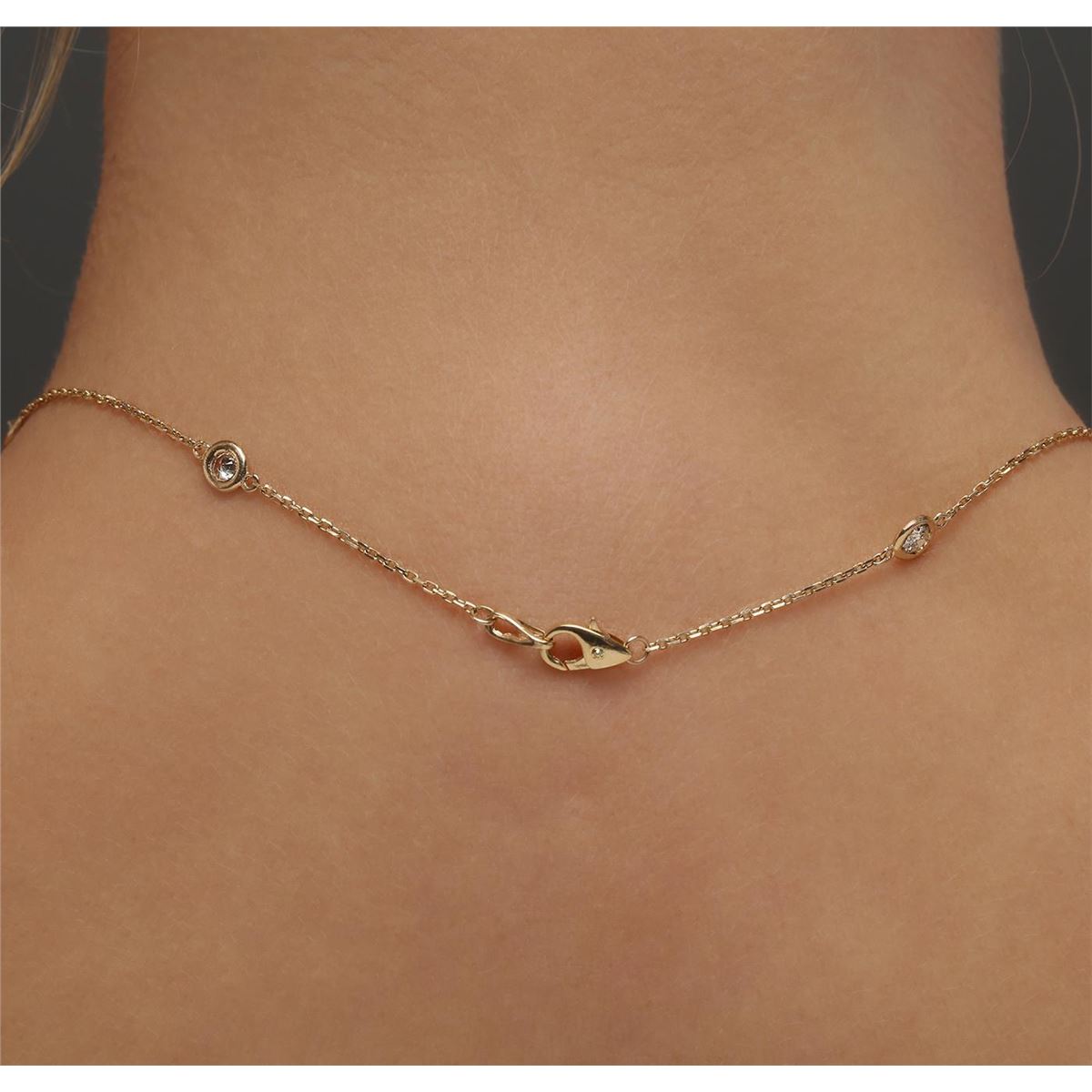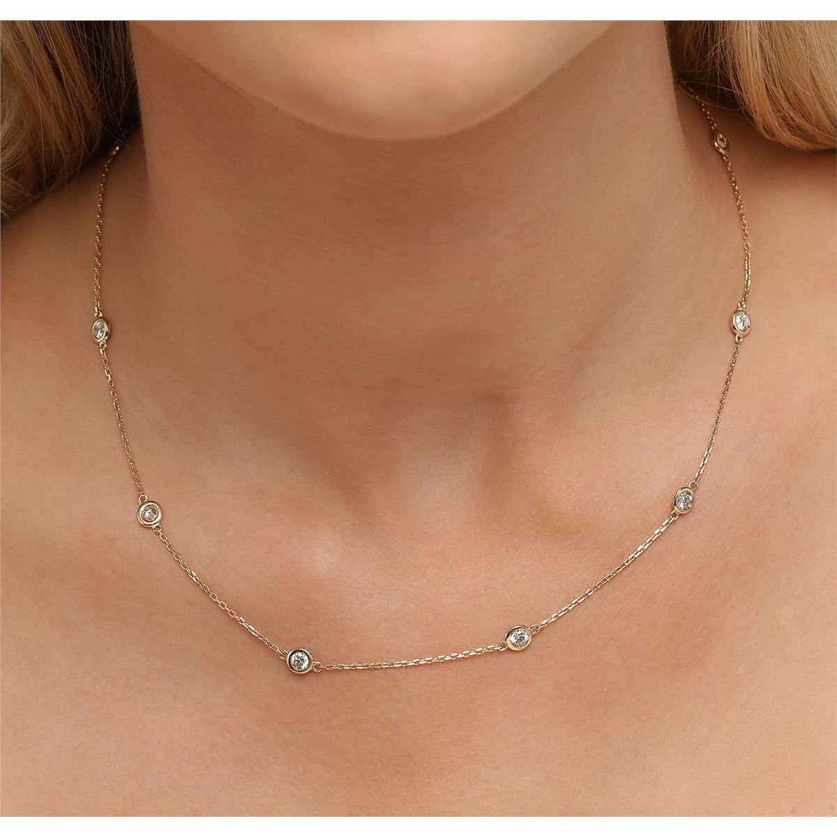 One electronically tested 14KT yellow gold ladies cast diamond necklace with a lobster claw clasp with a bright polish finish. Measurements: 18" in length Identified with markings of "K14". Condition is new. Containing: Ten bezel set round brilliant cut diamonds, measuring 3.50 - 3.50 x 2.10mm (depth est.) approximate total weight of 10 Stones = 1.57ct. Clarity: SI-1 to I-1. Color: J - K, Cut is Good. All diamonds are graded in the mounting, unless otherwise stated. Total Weight of Diamonds 1.57ct. Total Weight of Necklace 4.10 grams. GGL Appraised at $4,300.00.
