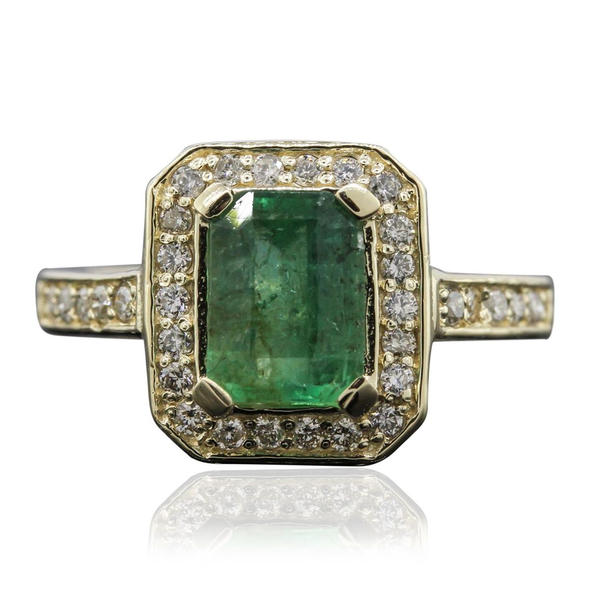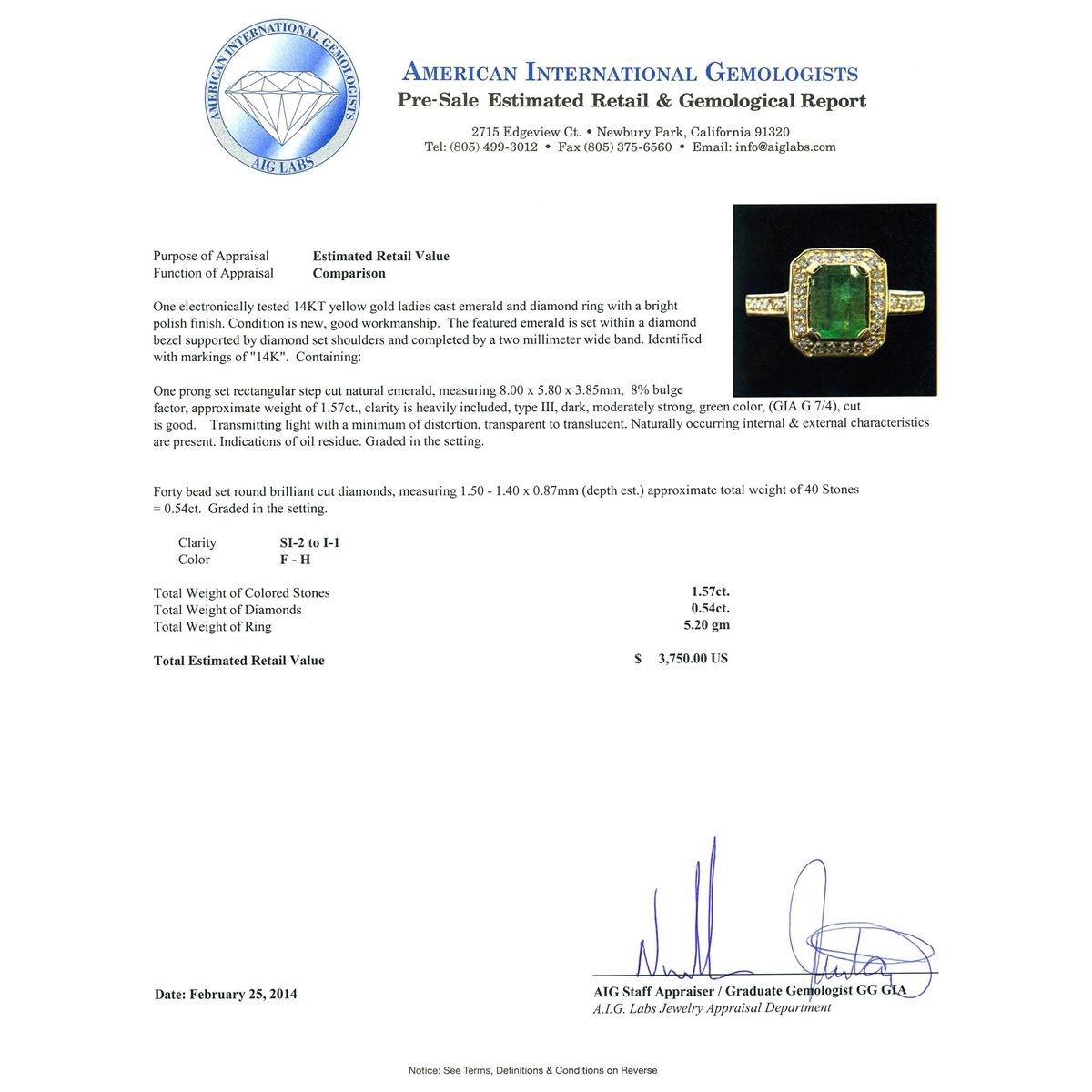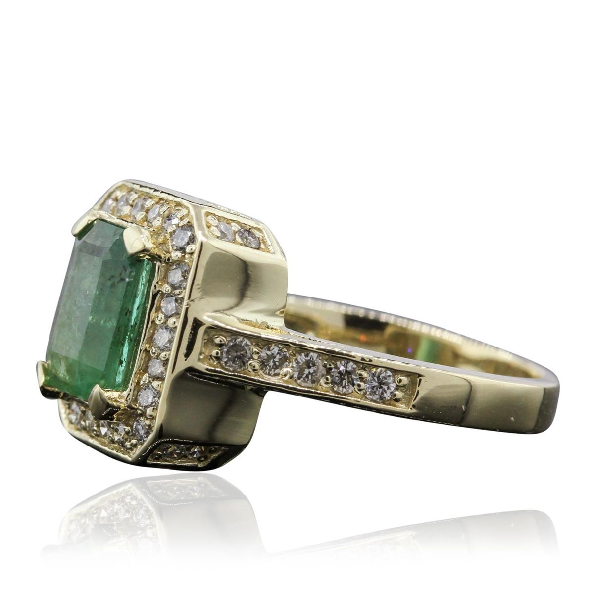 One electronically tested 14KT yellow gold ladies cast emerald and diamond ring with a bright polish finish. Condition is new, good workmanship. The featured emerald is set within a diamond bezel supported by diamond set shoulders and completed by a two millimeter wide band. Identified with markings of "14K". Containing: One prong set rectangular step cut natural aquamarine, measuring 8.00 x 5.80 x 3.85mm, 8% bulge factor, approximate weight of 1.57ct, clarity is heavily included, type I, medium, very slightly grayish, very slightly greenish blue color, (GIA vslgB 5/3), cut is good. Transmitting light with a minimum of distortion, transparent to translucent. Naturally occurring internal & external characteristics are present. Indications of oil residue. Graded in the setting. Forty bead set round brilliant cut diamonds, measuring 1.50 - 1.40 x 0.87mm (depth est.) approximate total weight of 40 Stones = 0.54ct. Graded in the setting. Clarity SI-2 to I-1 Color F - H Total Weight of Colored Stones 1.57ct. Total Weight of Diamonds 0.54ct. Total Weight of Ring 5.20 grams. AIG Appraised at $3,750.00.