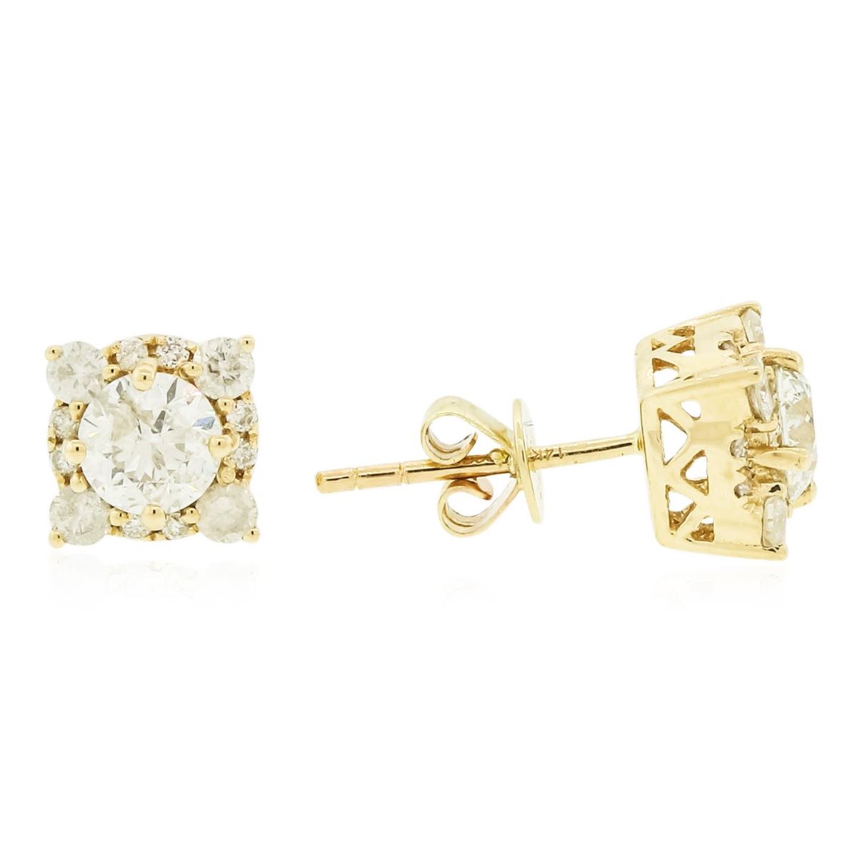 One pair electronically tested 14KT yellow gold ladies cast & assembled diamond earrings with standard backs. Bright polish good. Trademark is Orianne. Identified with markings of "14K". Condition is new, good workmanship. Containing: Two prong set round brilliant cut diamonds, measuring 5.10 - 5.00 x 3.03mm (depth est.) approximate total weight of 2 Stones = 1.04ct. Graded in the setting. Clarity: I-1. Color: J Eight prong set round brilliant cut diamonds, measuring 2.30 - 2.20 x 1.35mm (depth est.) approximate total weight of 8 Stones = 0.43ct. Graded in the setting. Clarity: I-1 to I-2. Color: I - K Sixteen prong set round brilliant cut diamonds, measuring 1.20 - 1.10 x 0.69mm (depth est.) approximate total weight of 16 Stones = 0.15ct. Graded in the setting. Clarity: I-1 to I-2. Color: H - J. Total Weight of Diamonds 1.62ct. Total Weight of Earrings 2.40gm. AIG Appraised at $7,705.00.
