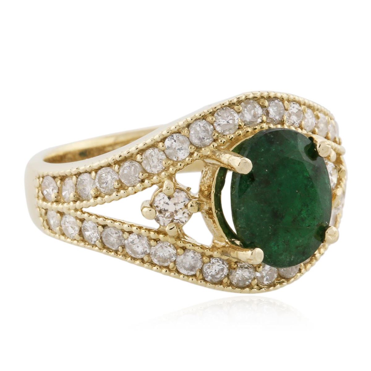 One electronically tested 14KT yellow gold ladies cast emerald and diamond ring. Condition is new, good workmanship. The featured emerald is accented by a single diamond on either side supported by mirroring diamond ribbons, completed by a three millimeter wide band. Bright polish finish with milgrain detailing throughout. Identified with markings of "K14". Containing: One prong set oval mixed cut natural emerald, measuring 8.95 x 7.00 x 4.35mm, 8% bulge factor, approximate weight of 1.63ct, clarity is heavily included, type III, medium dark, moderately strong, very slightly bluish green color, (GIA vslbG 6/4), cut is good. Transmitting light somewhat diffusely, transparent to translucent. Naturally occurring internal & external characteristics are present. Indications of oil residue. Graded in the setting. Two prong set old European & round brilliant cut diamonds, measuring 2.50 x 2.40 x 1.47mm (depth est.) approximate total weight of 2 Stones = 0.16ct. Graded in the setting. Clarity SI-2 Color H - I Thirty-Eight bead set round brilliant cut diamonds, measuring 1.70 - 1.60 x 0.99mm (depth est.) approximate total weight of 38 Stones = 0.72ct. Graded in the setting. Clarity I-1 to I-3 Color H - J Total Weight of Colored Stones 1.63ct. Total Weight of Diamonds 0.88ct. Total Weight of Ring 5.91 grams. AIG Appraised at $3,830.00.