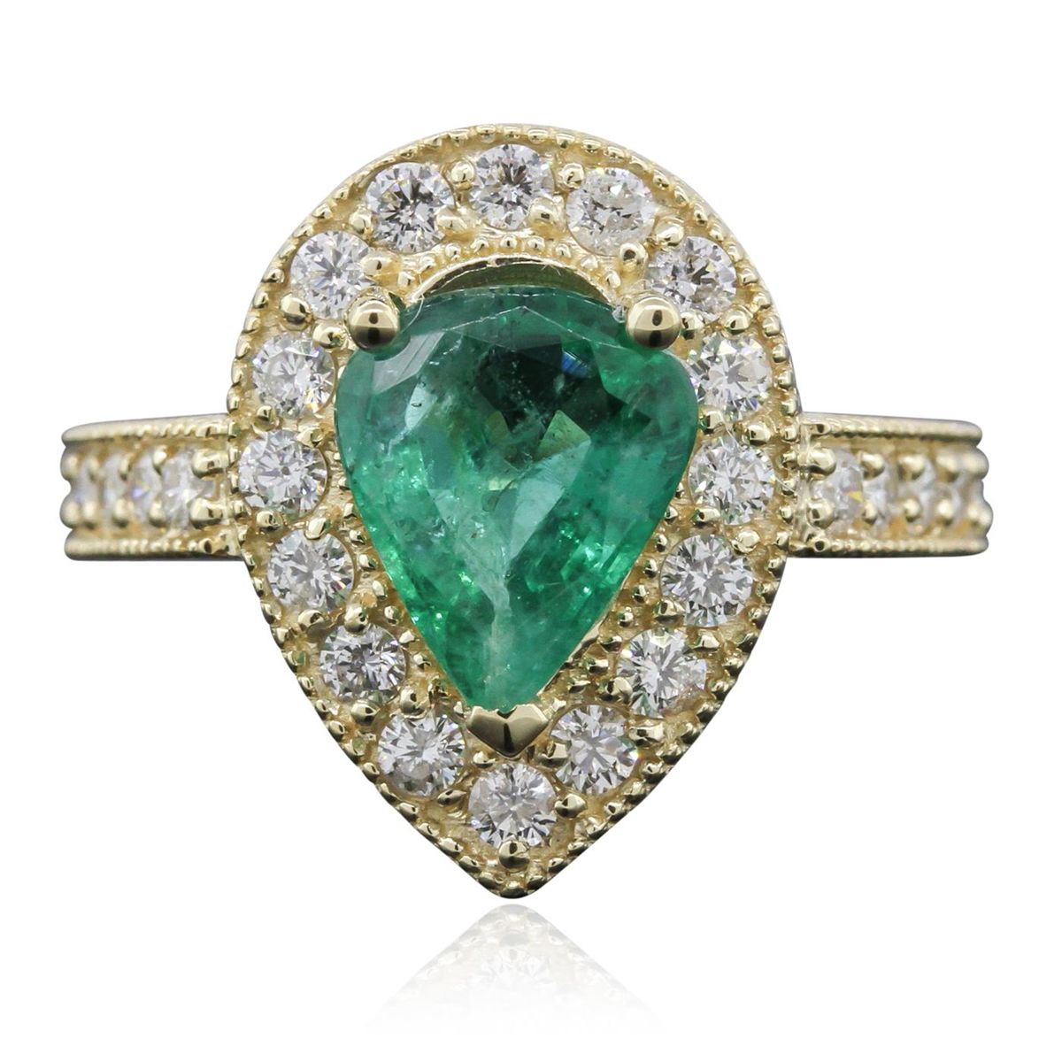 Great Condition! One electronically tested 14KT yellow gold Ladies combination cast & assembled fashion ring with a bright polish finish. Condition is new. Identified with markings of "14K". Containing: One prong set pear modified brilliant cut natural emerald, measuring 9.70 x 7.80 x 4.00mm, approximate weight of 1.65ct., clarity is moderately included, type III, medium light, moderately strong, very slightly bluish green color, (GIA vslbG 4/4), cut is good. Colored gemstones are presumed to have been subjected to commonly used and possible undetectable color/clarity enhancement processes. Twenty-Eight bead set round brilliant cut diamonds, measuring 1.90 - 1.90 x 1.14mm (depth est.) approximate total weight of 28 Stones = 0.70ct. Clarity of I-1 to I-2, Color of I - J, Cut is Good. Total Weight of Colored Stones 1.65ct. Total Weight of Diamonds 0.70ct. Total Weight of Ring 5.80 grams. GGL Appraised at $6,445.00.