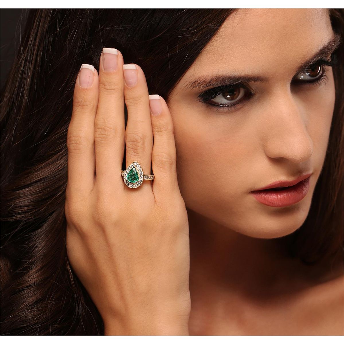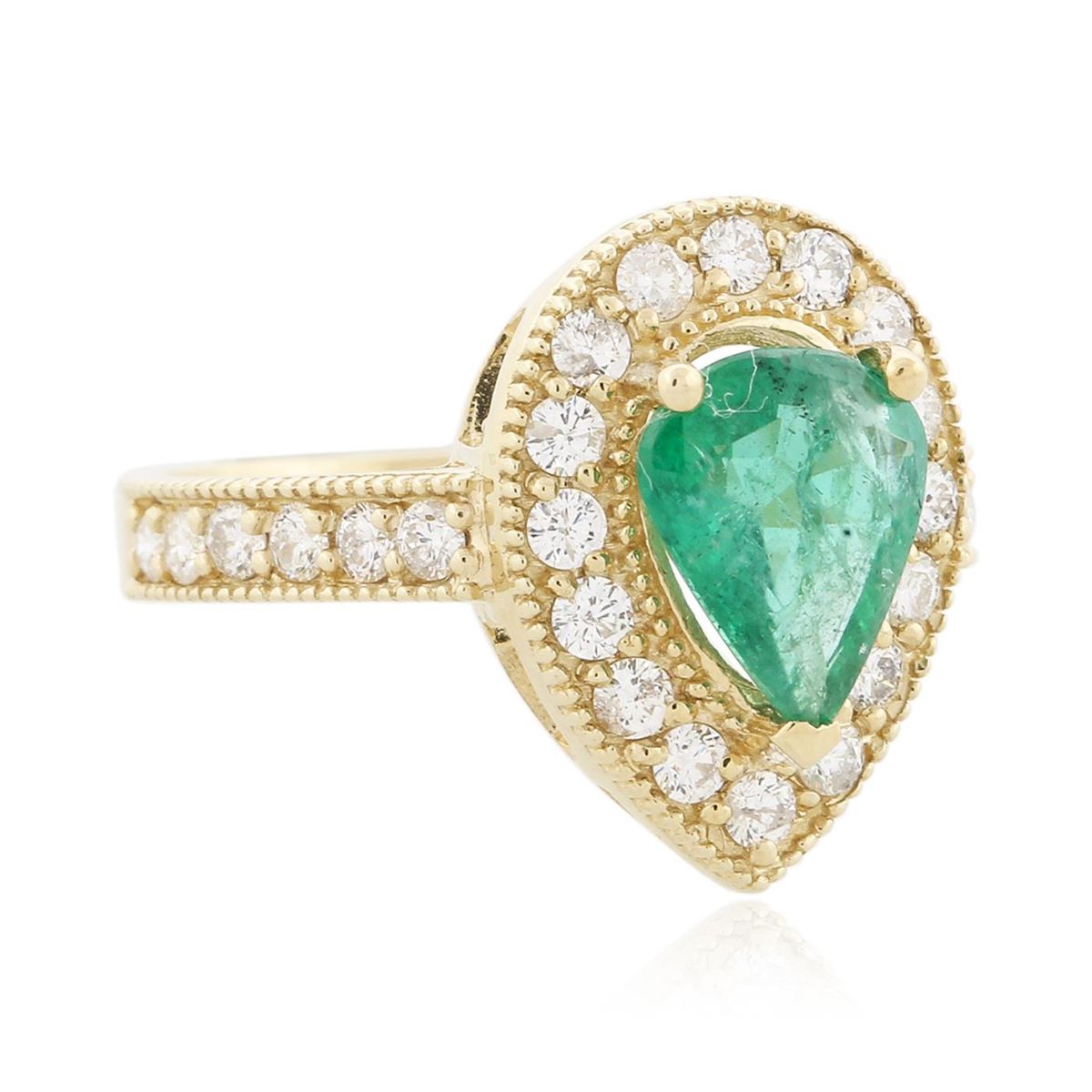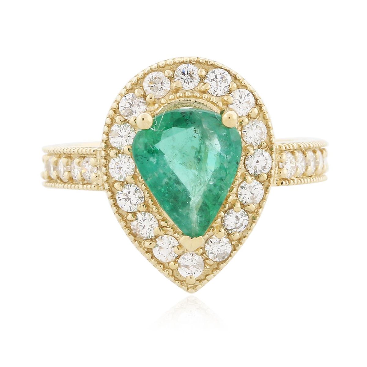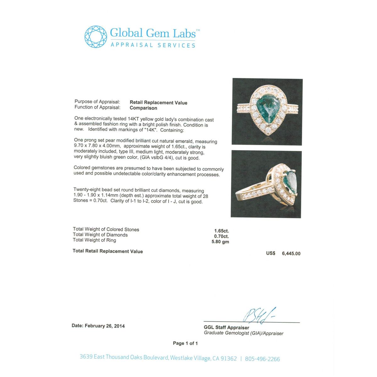 Great Condition! One electronically tested 14KT yellow gold Ladies combination cast & assembled fashion ring with a bright polish finish. Condition is new. Identified with markings of "14K". Containing: One prong set pear modified brilliant cut natural emerald, measuring 9.70 x 7.80 x 4.00mm, approximate weight of 1.65ct., clarity is moderately included, type III, medium light, moderately strong, very slightly bluish green color, (GIA vslbG 4/4), cut is good. Colored gemstones are presumed to have been subjected to commonly used and possible undetectable color/clarity enhancement processes. Twenty-Eight bead set round brilliant cut diamonds, measuring 1.90 - 1.90 x 1.14mm (depth est.) approximate total weight of 28 Stones = 0.70ct. Clarity of I-1 to I-2, Color of I - J, Cut is Good. Total Weight of Colored Stones 1.65ct. Total Weight of Diamonds 0.70ct. Total Weight of Ring 5.80 grams. GGL Appraised at $6,445.00.