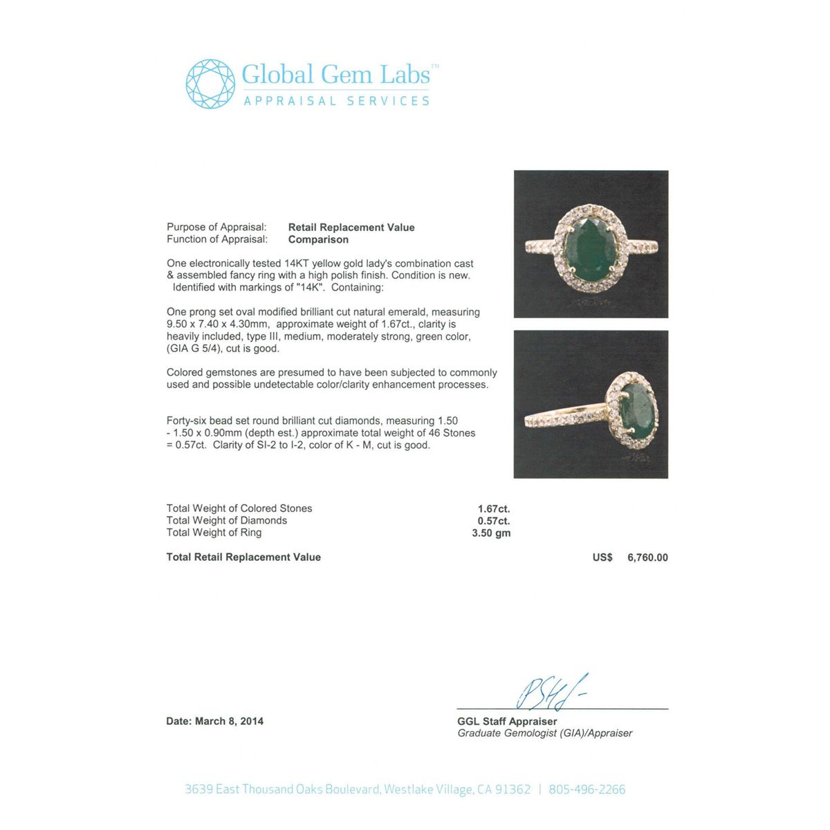 One electronically tested 14KT yellow gold Ladies combination cast & assembled fancy ring with a high polish finish. Condition is new. Identified with markings of "14K". Containing: One prong set oval modified brilliant cut natural emerald, measuring 9.50 x 7.40 x 4.30mm, approximate weight of 1.67ct., clarity is heavily included, type III, medium, moderately strong, green color, (GIA G 5/4), cut is good. Colored gemstones are presumed to have been subjected to commonly used and possible undetectable color/clarity enhancement processes. Forty-Six bead set round brilliant cut diamonds, measuring 1.50 - 1.50 x 0.90mm (depth est.) approximate total weight of 46 Stones = 0.57ct. Clarity of SI-2 to I-2, Color of K - M, Cut is Good. Total Weight of Colored Stones 1.67ct. Total Weight of Diamonds 0.57ct. Total Weight of Ring 3.50 grams. GGL Appraised at $6,760.00.