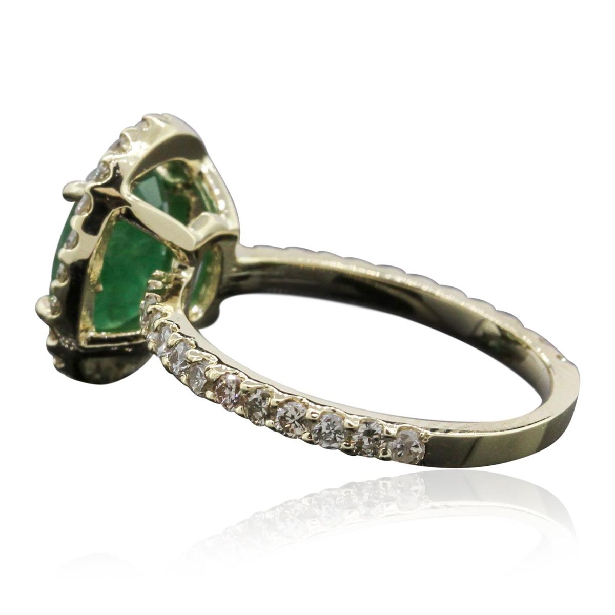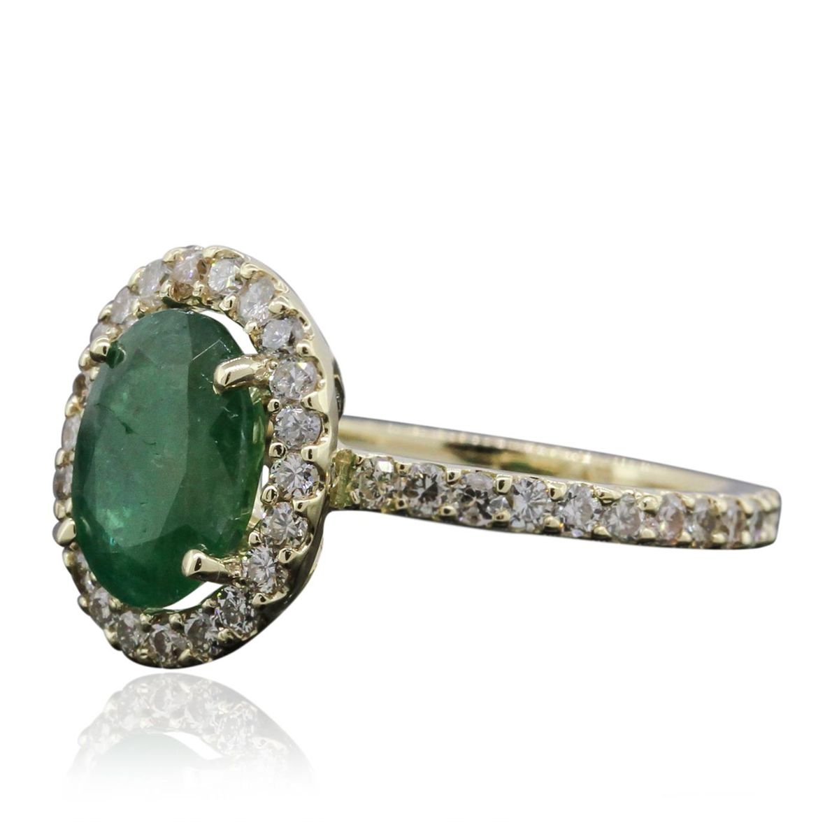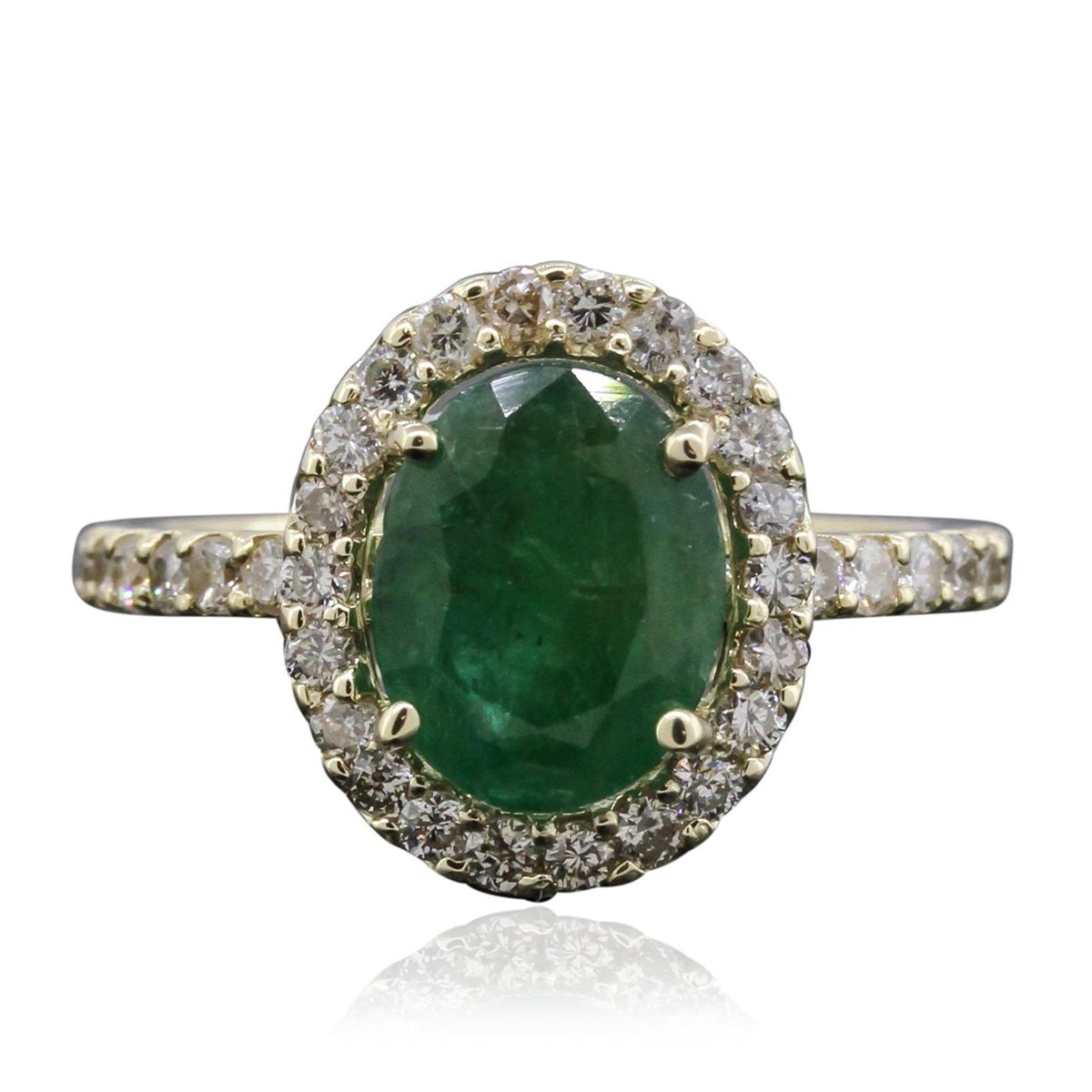 One electronically tested 14KT yellow gold Ladies combination cast & assembled fancy ring with a high polish finish. Condition is new. Identified with markings of "14K". Containing: One prong set oval modified brilliant cut natural emerald, measuring 9.50 x 7.40 x 4.30mm, approximate weight of 1.67ct., clarity is heavily included, type III, medium, moderately strong, green color, (GIA G 5/4), cut is good. Colored gemstones are presumed to have been subjected to commonly used and possible undetectable color/clarity enhancement processes. Forty-Six bead set round brilliant cut diamonds, measuring 1.50 - 1.50 x 0.90mm (depth est.) approximate total weight of 46 Stones = 0.57ct. Clarity of SI-2 to I-2, Color of K - M, Cut is Good. Total Weight of Colored Stones 1.67ct. Total Weight of Diamonds 0.57ct. Total Weight of Ring 3.50 grams. GGL Appraised at $6,760.00.