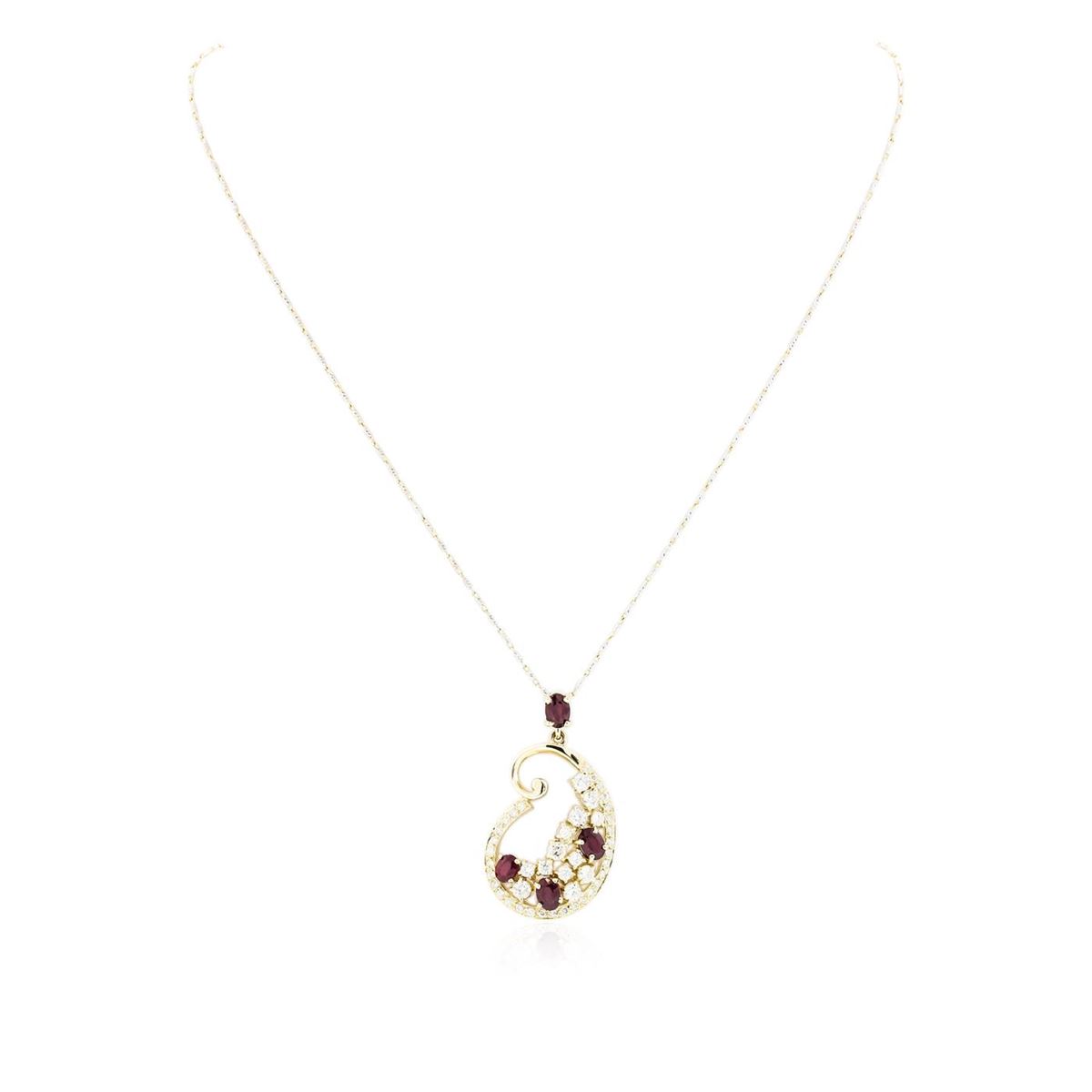 One electronically tested 14KT yellow gold ladies cast & assembled ruby and diamond pendant with chain. Condition is new, good workmanship. The pendant features a stylized ruby and diamond cluster pendant, completed by a ruby set bail. The pendant is supported by an eighteen inch length 14KT yellow gold designer style chain with rhodium accents, terminating in a lobster claw clasp. Bright polish finish. Containing: Four prong set oval mixed cut natural rubies, measuring 5.50 x 3.00 x 2.70mm, 8%. bulge factor, approximate. Total Weight of 1.68ct., clarity is heavily included, type II, dark, very slightly brownish, slightly purplish red color, (GIA slpR 7/3), cut is good. Transmitting light somewhat diffusely, transparent to translucent. Naturally occurring internal & external characteristics are present. Indications of laboratory high temperature heat treatment, with glass & flux additives. Measurements & the color grade are an average for the group. Graded in the setting. Ruby has a low tolerance to rhodium plating, repolishing the surface, & ultrasonic cleaning. Thirteen prong set round brilliant cut diamonds, measuring 3.00 - 2.50 x 1.65mm (depth est.) approximate. Total Weight of 13 Stones = 1.09ct. Graded in the setting. Clarity: SI-2 to I-1. Color: G - I Thirty-One bead set round brilliant cut diamonds, measuring 1.60 - 1.50 x 0.93mm (depth est.) approximate. Total Weight of 31 Stones = 0.52ct. Graded in the setting. Clarity: I-1 to I-2. Color: G - I. Total Weight of Colored Stones 1.68ct. Total Weight of Diamonds 1.61ct. Total Weight of Pendant With Chain 10.62 grams. AIG Appraised at $6,480.00.