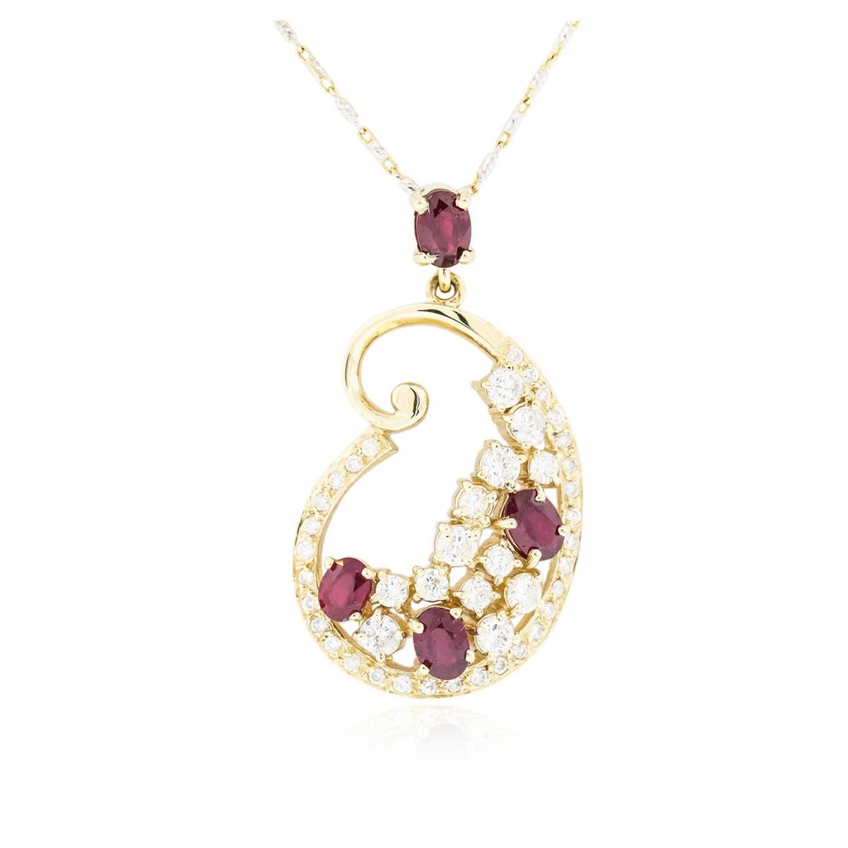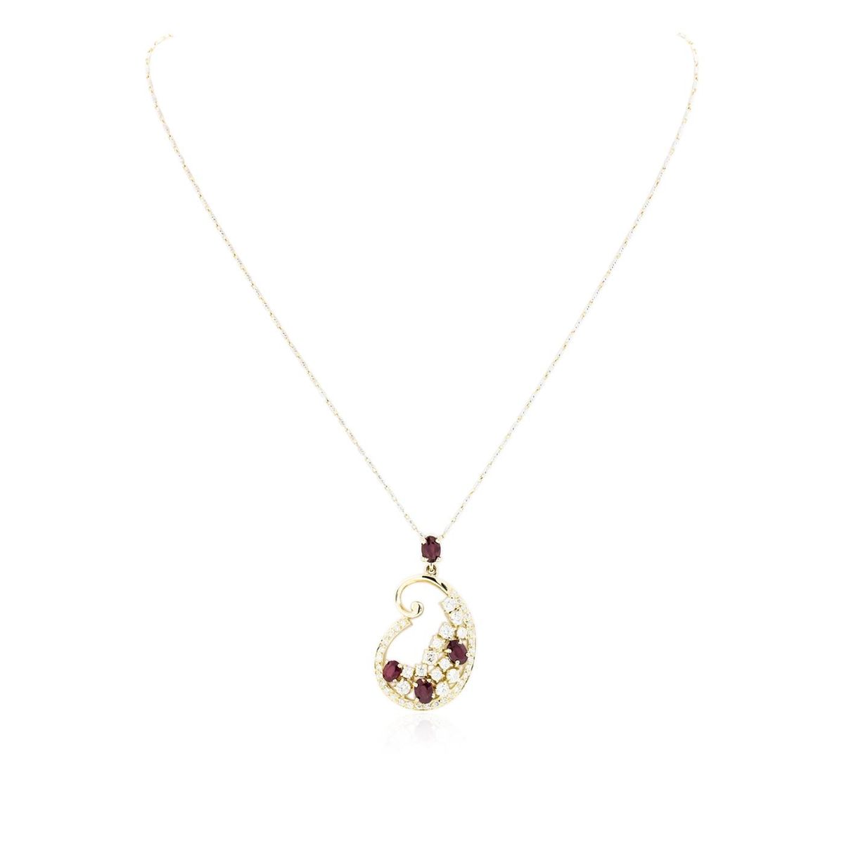 One electronically tested 14KT yellow gold ladies cast & assembled ruby and diamond pendant with chain. Condition is new, good workmanship. The pendant features a stylized ruby and diamond cluster pendant, completed by a ruby set bail. The pendant is supported by an eighteen inch length 14KT yellow gold designer style chain with rhodium accents, terminating in a lobster claw clasp. Bright polish finish. Containing: Four prong set oval mixed cut natural rubies, measuring 5.50 x 3.00 x 2.70mm, 8%. bulge factor, approximate. Total Weight of 1.68ct., clarity is heavily included, type II, dark, very slightly brownish, slightly purplish red color, (GIA slpR 7/3), cut is good. Transmitting light somewhat diffusely, transparent to translucent. Naturally occurring internal & external characteristics are present. Indications of laboratory high temperature heat treatment, with glass & flux additives. Measurements & the color grade are an average for the group. Graded in the setting. Ruby has a low tolerance to rhodium plating, repolishing the surface, & ultrasonic cleaning. Thirteen prong set round brilliant cut diamonds, measuring 3.00 - 2.50 x 1.65mm (depth est.) approximate. Total Weight of 13 Stones = 1.09ct. Graded in the setting. Clarity: SI-2 to I-1. Color: G - I Thirty-One bead set round brilliant cut diamonds, measuring 1.60 - 1.50 x 0.93mm (depth est.) approximate. Total Weight of 31 Stones = 0.52ct. Graded in the setting. Clarity: I-1 to I-2. Color: G - I. Total Weight of Colored Stones 1.68ct. Total Weight of Diamonds 1.61ct. Total Weight of Pendant With Chain 10.62 grams. AIG Appraised at $6,480.00.
