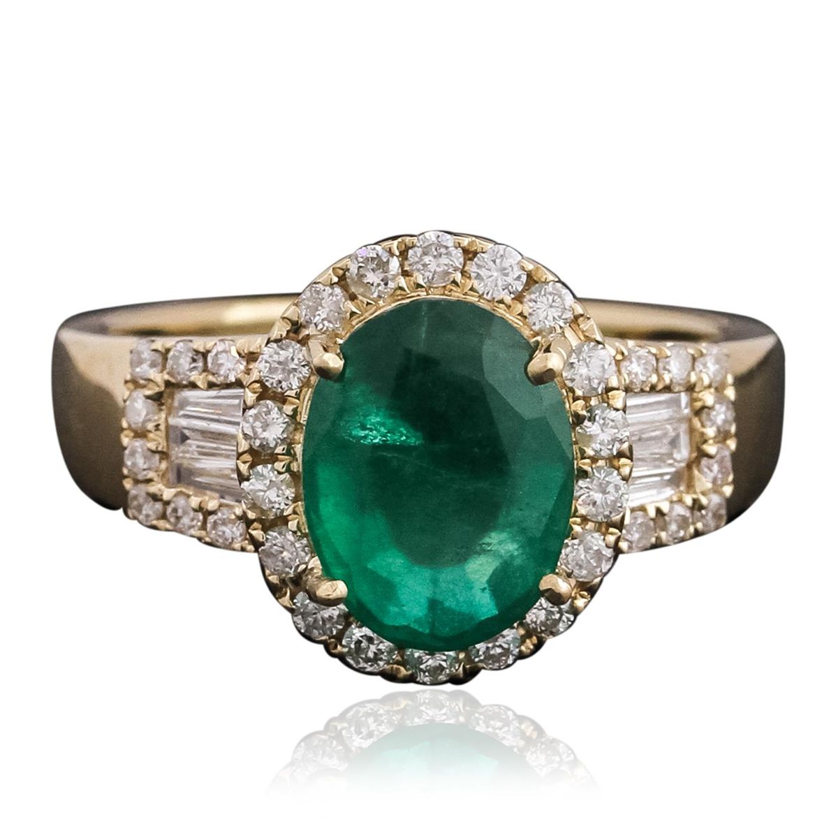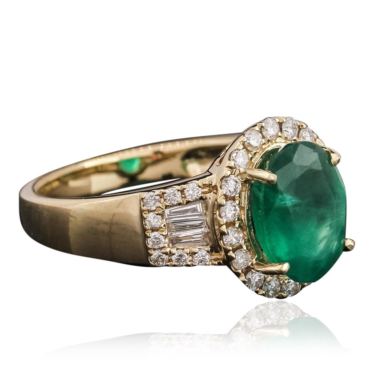 One electronically tested 14KT yellow gold ladies cast emerald and diamond ring with a bright polish finish. The featured emerald is set within a diamond bezel supported by diamond set shoulders, completed by a two and one-half millimeter wide band. Identified with markings of "14K". Condition is new, good workmanship. Containing: One prong set oval mixed cut natural emerald, measuring 9.10 x 7.45 x 4.20mm, 8% bulge factor, approximate weight of 1.69ct., clarity is heavily included, type III, medium dark, moderately strong, very slightly bluish green color, (GIA vslbG 6/4), cut is good. Transmitting light with a minimum of distortion, transparent. Naturally occurring internal & external characteristics are present. Indications of multiple laboratory enhancements, including oil residue. Graded in the setting. Six channel set baguette cut (tapered) diamonds, measuring from 2.80 x 1.20 x 0.84mm (depth est.) to 2.90 x 1.20 x 0.84mm (depth est.) approximate total weight of 6 Stones = 0.15ct. Graded in the setting. Clarity: SI-1 to SI-2. Color: G - H Thirty-Four prong set round brilliant cut diamonds, measuring 1.50 - 1.30 x 0.84mm (depth est.) approximate total weight of 34 Stones = 0.44ct. Graded in the setting. Clarity: SI-1 to I-1. Color: G - I. Total Weight of Colored Stones 1.69ct. Total Weight of Diamonds 0.59ct. Total Weight of Ring 5.01 grams. AIG Appraised at $4,930.00.
