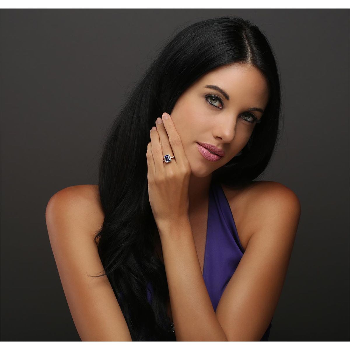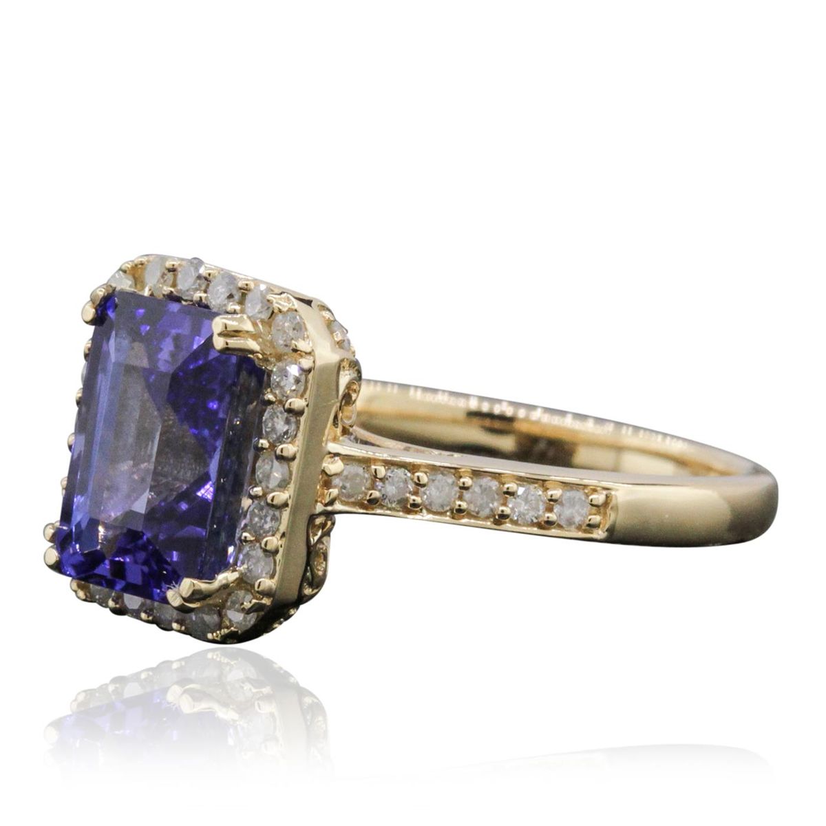 One electronically tested 14KT yellow gold ladies combination cast & assembled tanzanite and diamond ring with a flat shank with a bright polish finish. Identified with markings of "14K". Condition is new. Containing: One prong set emerald standard step cut natural tanzanite, measuring 9.29 x 6.31 x 3.19mm, approximate weight of 1.69ct., clarity is eye clean, type I, medium light, very slightly grayish, violet color, (GIA V 4/3), cut is good. Thirty-Three prong set round brilliant cut diamonds, measuring 1.30 - 1.30 x 0.78mm (depth est.) approximate total weight of 33 Stones = 0.26ct. Clarity: I-1 to I-2. Color: J - K, Cut is Good. Colored gemstones are presumed to have been subjected to commonly used enhancement processes. All diamonds and colored gemstones are graded in the mounting, unless otherwise stated. Total Weight of Colored Stones 1.69ct. Total Weight of Diamonds 0.26ct. Total Weight of Ring 4.20 grams. GGL Appraised at $4,170.00.