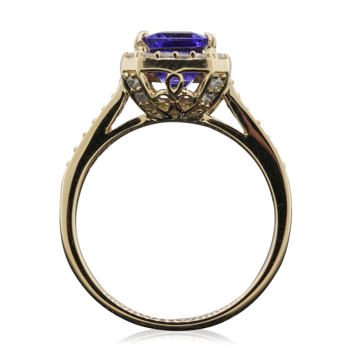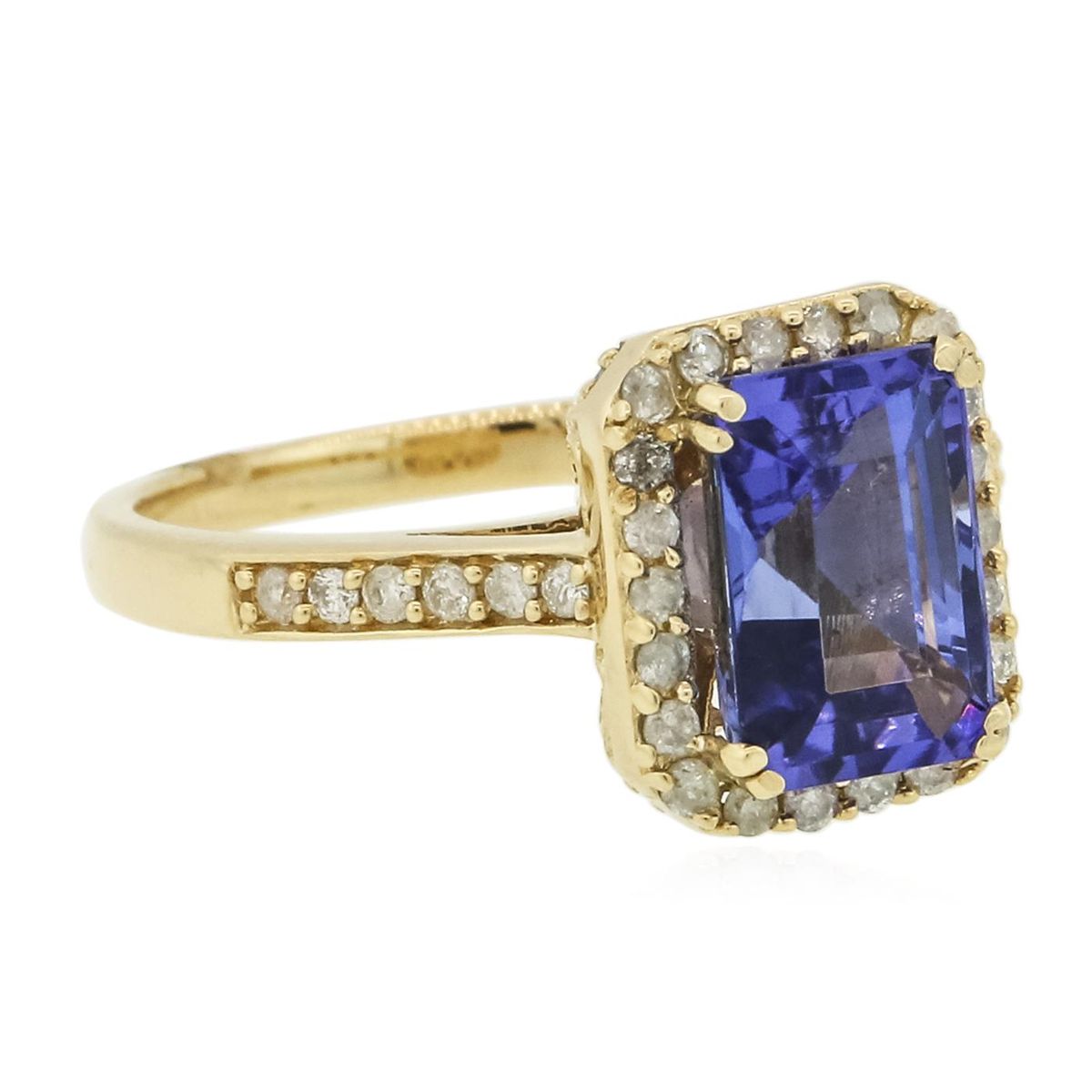 One electronically tested 14KT yellow gold ladies combination cast & assembled tanzanite and diamond ring with a flat shank with a bright polish finish. Identified with markings of "14K". Condition is new. Containing: One prong set emerald standard step cut natural tanzanite, measuring 9.29 x 6.31 x 3.19mm, approximate weight of 1.69ct., clarity is eye clean, type I, medium light, very slightly grayish, violet color, (GIA V 4/3), cut is good. Thirty-Three prong set round brilliant cut diamonds, measuring 1.30 - 1.30 x 0.78mm (depth est.) approximate total weight of 33 Stones = 0.26ct. Clarity: I-1 to I-2. Color: J - K, Cut is Good. Colored gemstones are presumed to have been subjected to commonly used enhancement processes. All diamonds and colored gemstones are graded in the mounting, unless otherwise stated. Total Weight of Colored Stones 1.69ct. Total Weight of Diamonds 0.26ct. Total Weight of Ring 4.20 grams. GGL Appraised at $4,170.00.