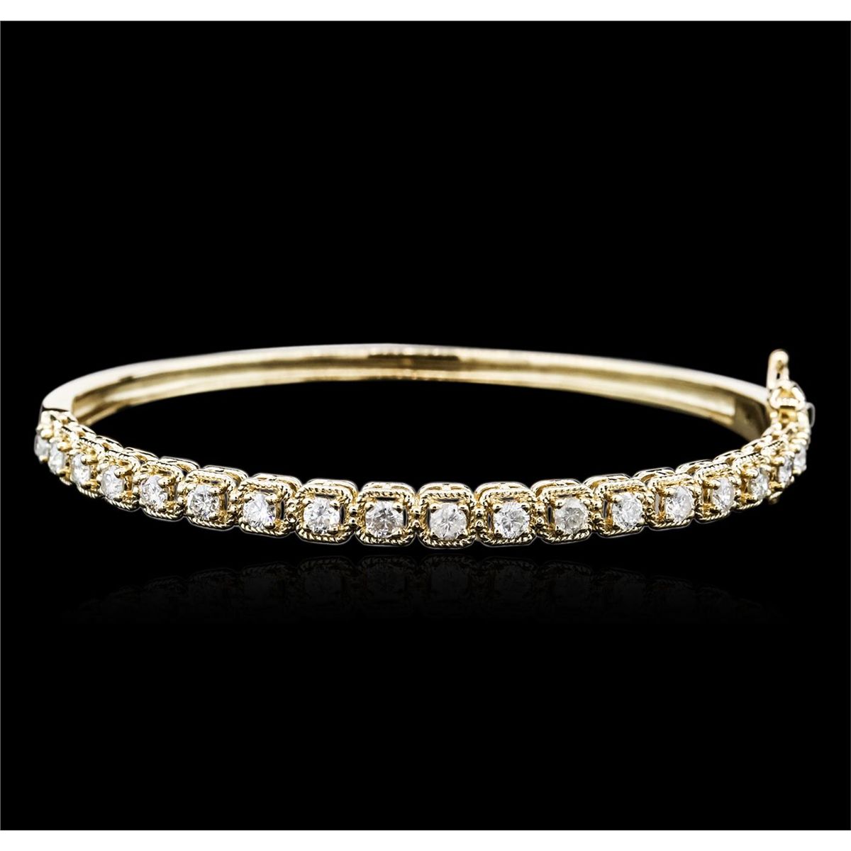 One electronically tested 14KT yellow gold ladies cast diamond bangle bracelet with a hidden box clasp with safety closer with a bright polish finish. Identified with markings of "K14". Condition is new. Containing: Nineteen prong set round brilliant cut diamonds, measuring 2.90 - 2.90 x 1.74mm (depth est.) approximate total weight of 19 Stones = 1.70ct. Clarity: SI-2 to I-1. Color: J - K, Cut is Good. All diamonds are graded in the mounting, unless otherwise stated. Total Weight of Diamonds 1.70ct. Total Weight of Bangle Bracelet 11.30 grams. GGL Appraised at $7,250.00.