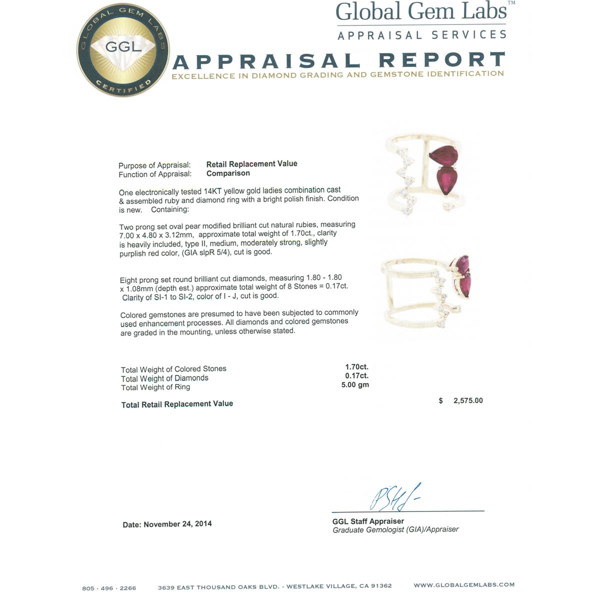 One electronically tested 14KT yellow gold ladies combination cast & assembled ruby and diamond ring with a bright polish finish. Condition is new. Containing: Two prong set oval pear modified brilliant cut natural rubies, measuring 7.00 x 4.80 x 3.12mm, approximate total weight of 1.70ct., clarity is heavily included, type II, medium, moderately strong, slightly purplish red color, (GIA slpR 5/4), cut is good. Eight prong set round brilliant cut diamonds, measuring 1.80 - 1.80 x 1.08mm (depth est.) approximate total weight of 8 Stones = 0.17ct. Clarity: SI-1 to SI-2. Color: I - J, Cut is Good. Colored gemstones are presumed to have been subjected to commonly used enhancement processes. All diamonds and colored gemstones are graded in the mounting, unless otherwise stated. Total Weight of Colored Stones 1.70ct. Total Weight of Diamonds 0.17ct. Total Weight of Ring 5.00 grams. GGL Appraised at $2,575.00.