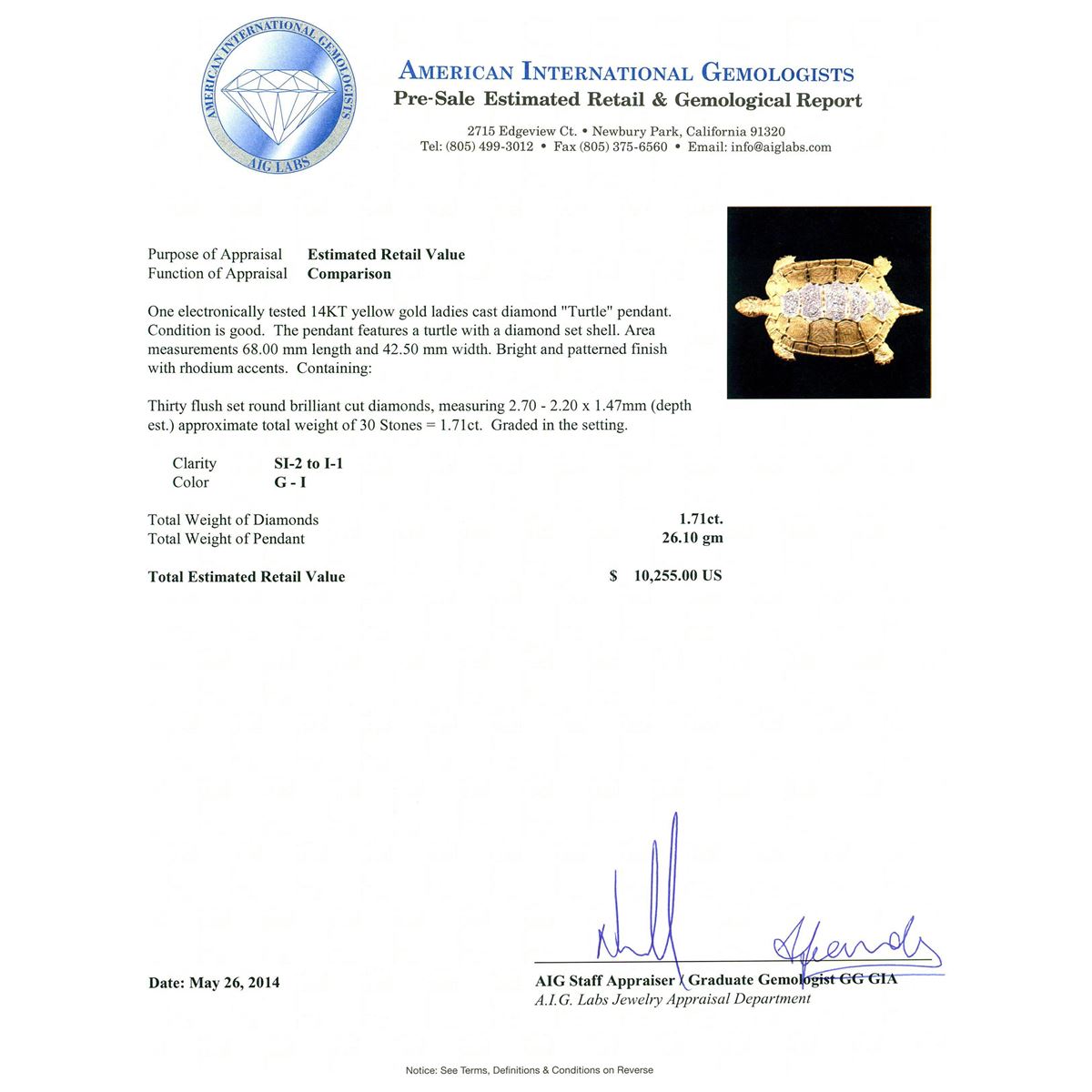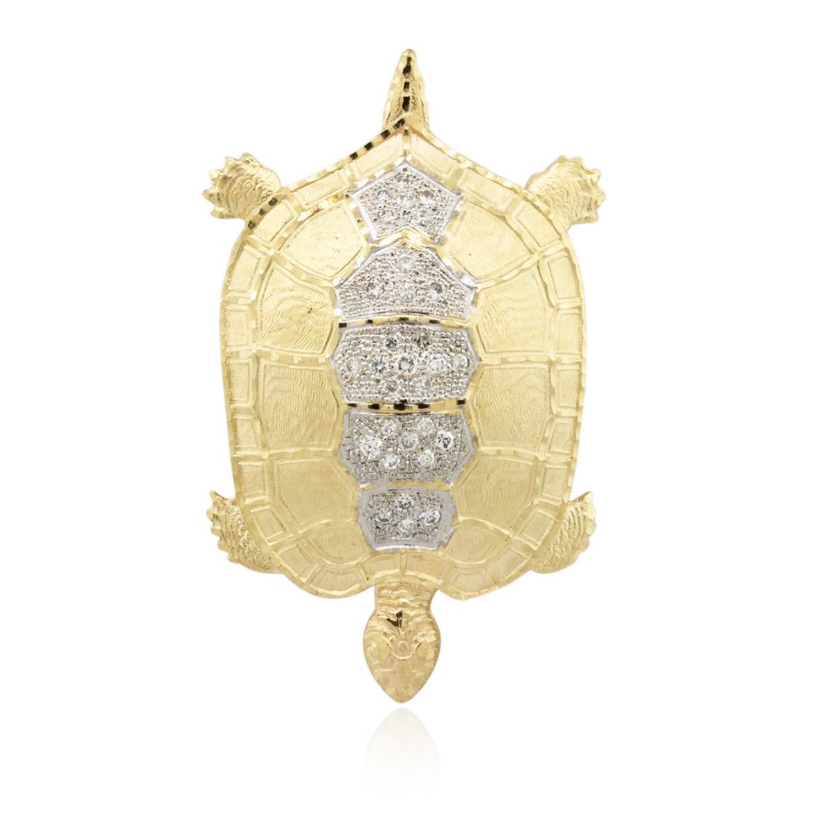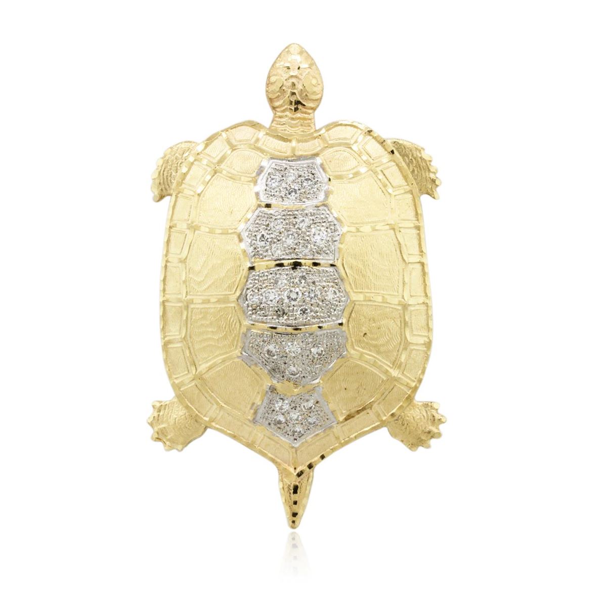 One electronically tested 14KT yellow gold ladies cast diamond "Turtle" pendant. Condition is good. The pendant features a turtle with a diamond set shell. Area measurements 68.00 mm length and 42.50 mm width. Bright and patterned finish with rhodium accents. Containing: Thirty flush set round brilliant cut diamonds, measuring 2.70 - 2.20 x 1.47mm (depth est.) approximate. Total Weight of 30 Stones = 1.71ct. Graded in the setting. Clarity: SI-2 to I-1. Color: G - I. Total Weight of Diamonds 1.71ct. Total Weight of Pendant 26.10 grams. AIG Appraised at $10,255.00.