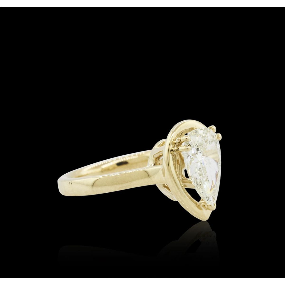 One electronically tested 14KT yellow gold ladies cast diamond solitaire ring with a bright polish finish. The ring is completed by a two and one-half millimeter wide band. Identified with markings of "14K". Condition is new, good workmanship. Containing: One prong set pear shaped cut diamond, measuring 11.50 x 6.70 x 3.50mm (depth est.), 4.00.%. GTCF approximate weight of 1.71ct with a medium blue fluorescence. Graded in the setting. Clarity: I-1. Color: 52.2%. Table 58.2%. Total Weight of Diamonds 1.71ct. Total Weight of Ring 5.86 grams. AIG Appraised at $10,985.00.