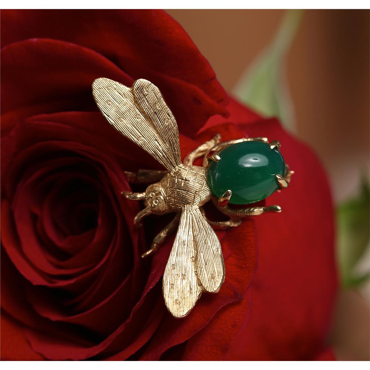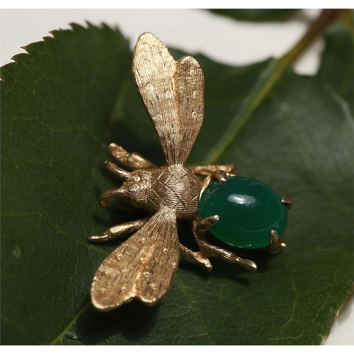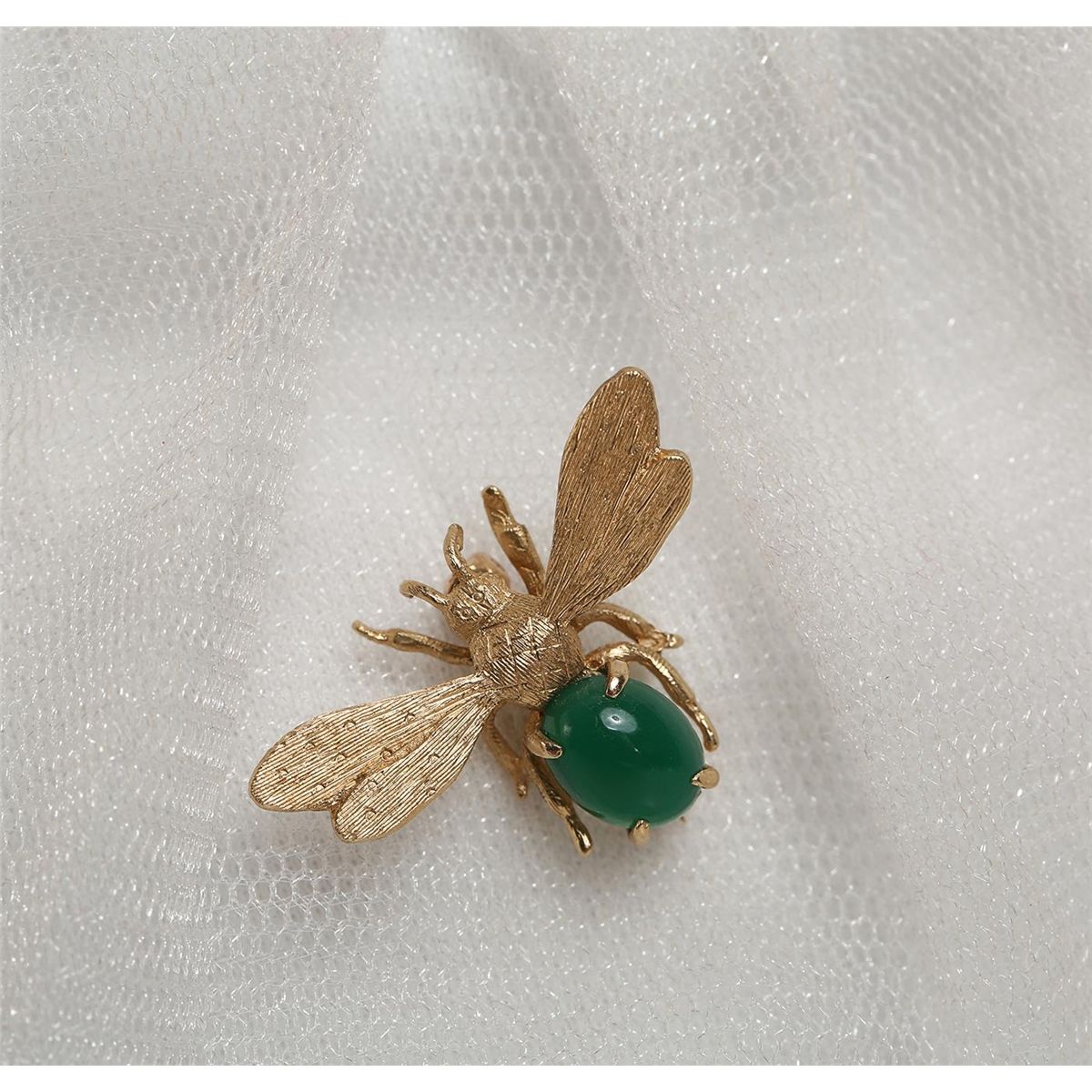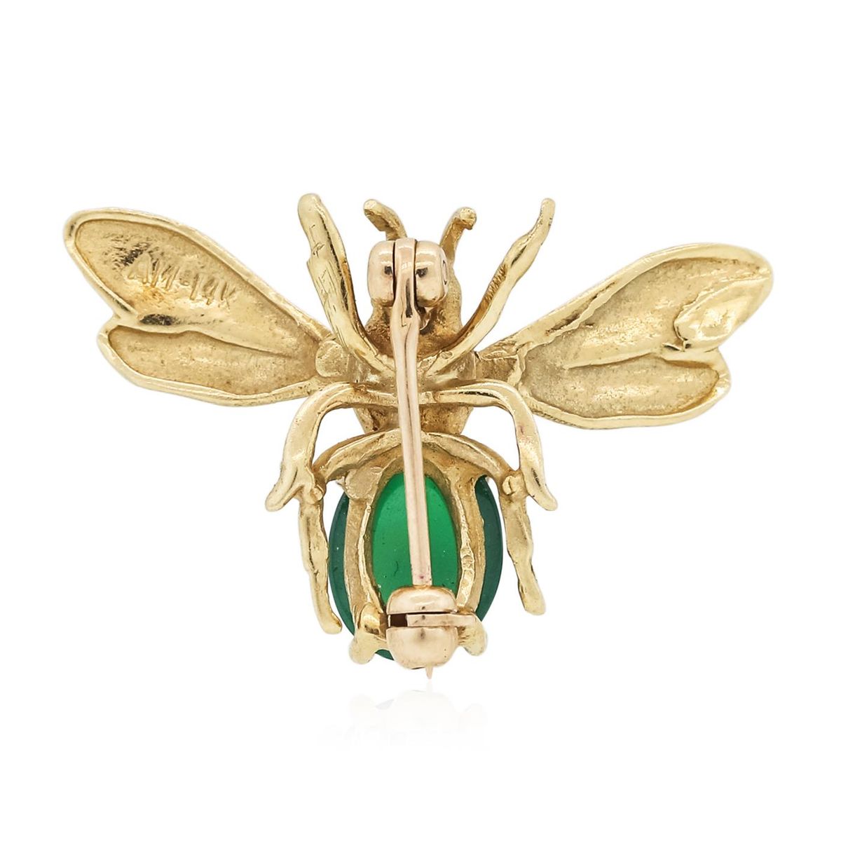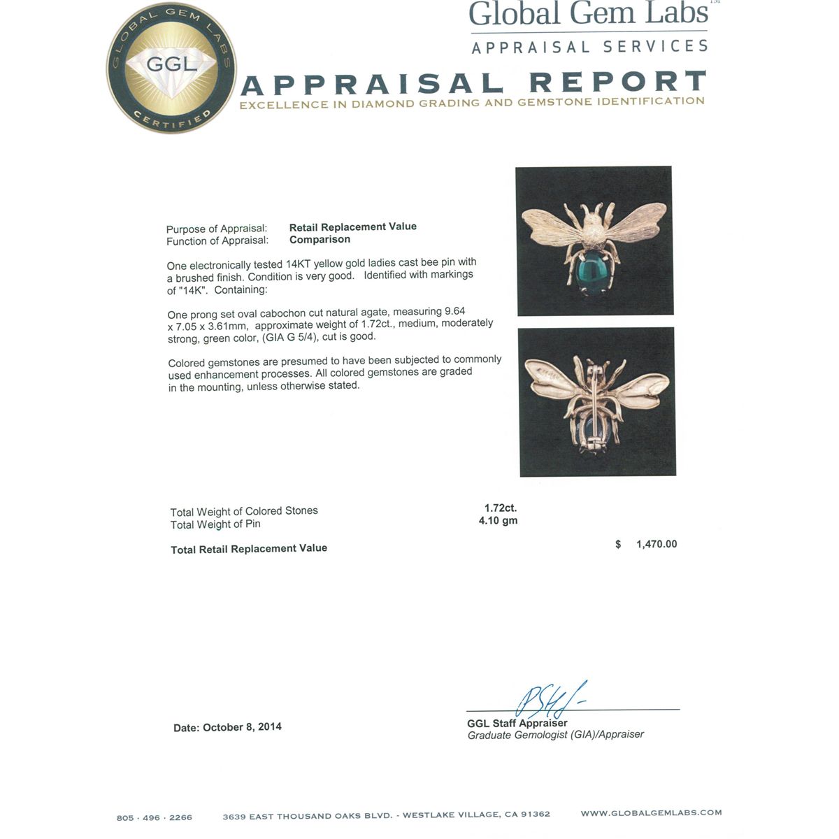 One electronically tested 14KT yellow gold ladies cast bee pin with a brushed finish. Identified with markings of "14K". Condition is very good. Containing: One prong set oval cabochon cut natural agate, measuring 9.64 x 7.05 x 3.61mm, approximate weight of 1.72ct., medium, moderately strong, green color, (GIA G 5/4), cut is good. Colored gemstones are presumed to have been subjected to commonly used enhancement processes. All colored gemstones are graded in the mounting, unless otherwise stated. Total Weight of Colored Stones 1.72ct. Total Weight of Pin 4.10 grams. GGL Appraised at $1,470.00.