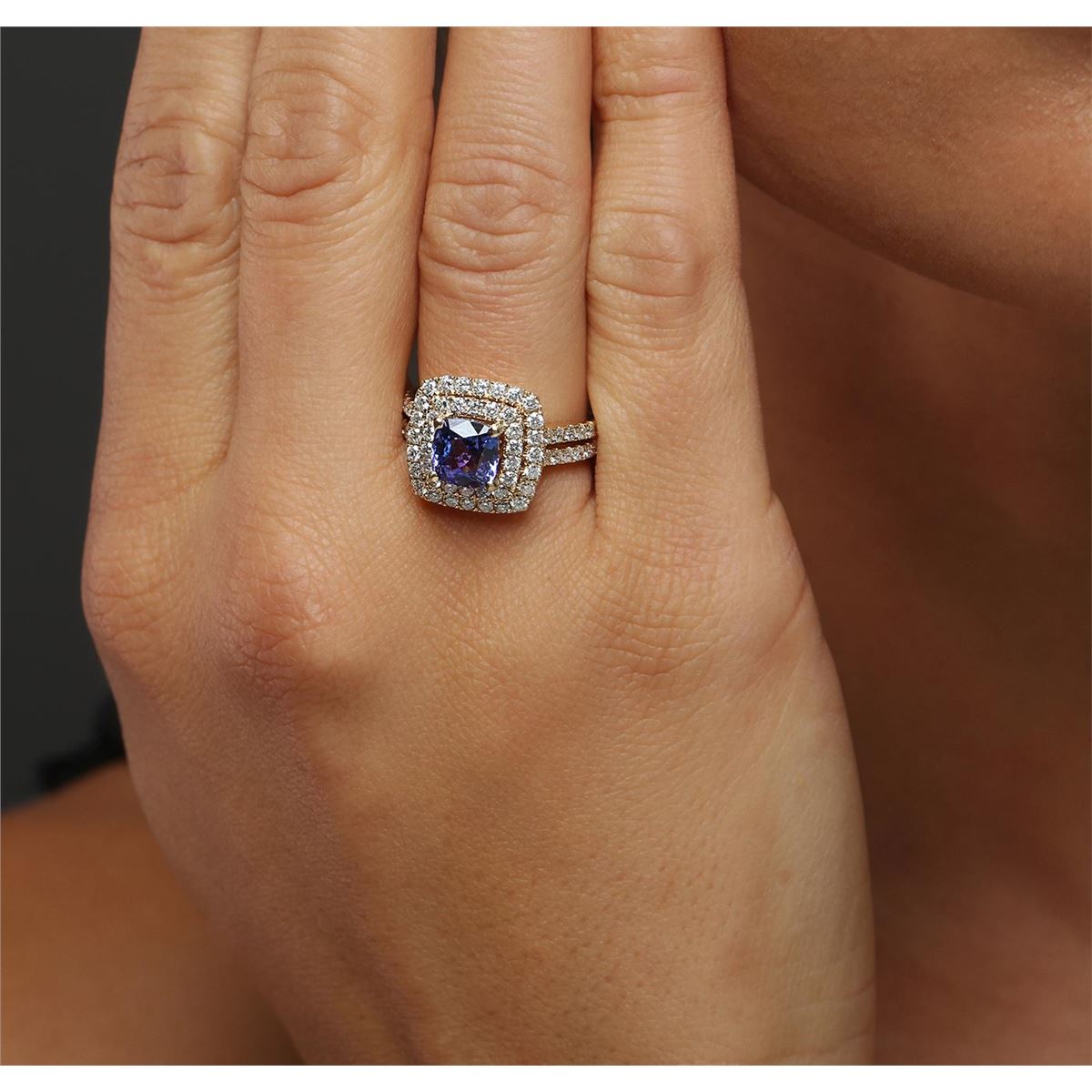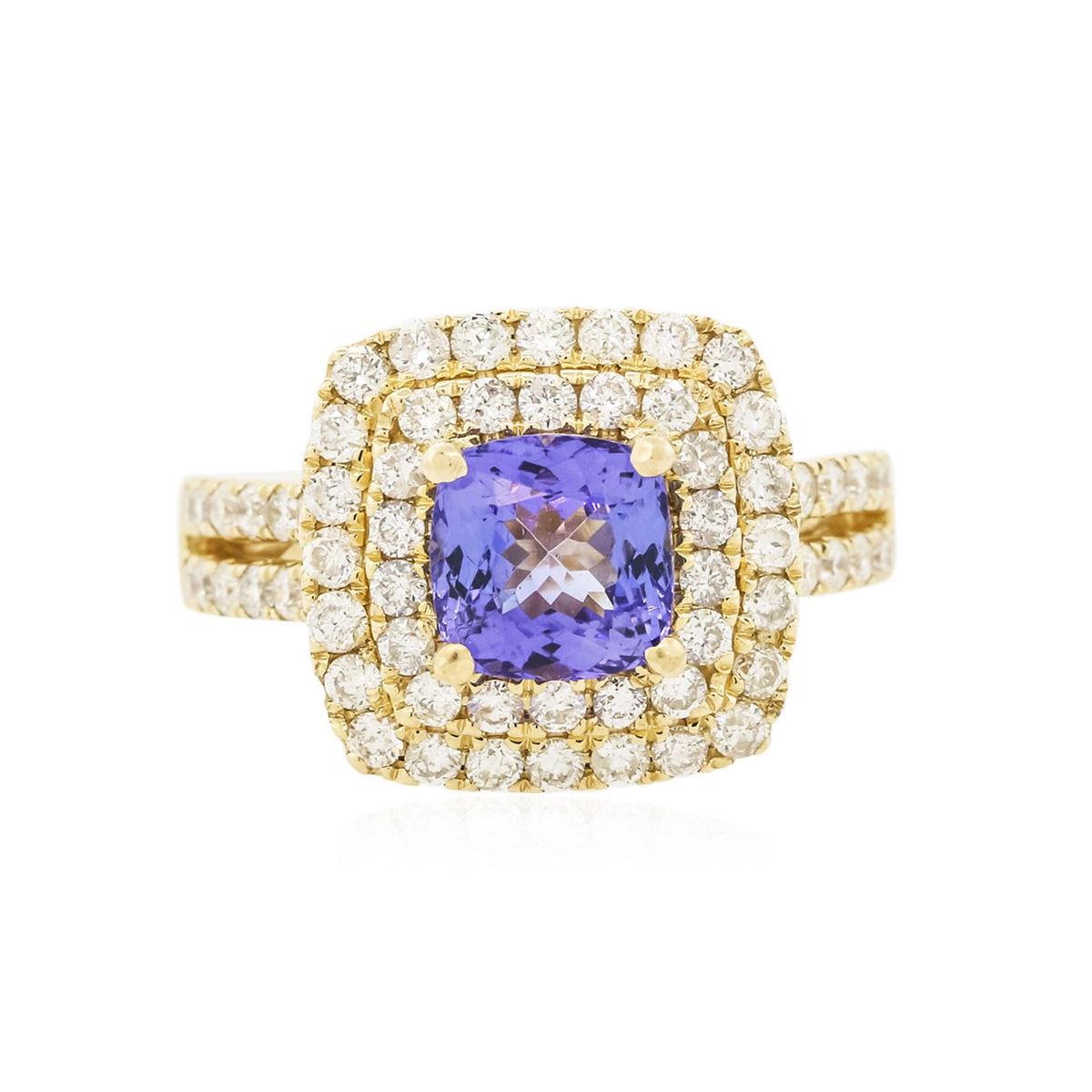 One electronically tested 14KT yellow gold Ladies combination cast & assembled ring with a bright polish finish. Condition is new. Identified with markings of "14K". Containing: One prong set square cushion modified brilliant cut natural tanzanite, measuring 7.00 x 7.00 x 4.55mm, approximate weight of 1.76ct., clarity is eye clean, type I, medium, moderately strong, bluish violet color, (GIA bV 5/4), cut is good. Colored gemstones are presumed to have been subjected to commonly used color/clarity enhancement processes. Seventy prong set round brilliant cut diamonds, measuring 1.50 - 1.50 x 0.90mm (depth est.) approximate. Total Weight of 70 Stones = 0.86ct. Clarity: I-1 to I-2. Color: J - K, Cut is Good. Total Weight of Colored Stones 1.76ct. Total Weight of Diamonds 0.86ct. Total Weight of Ring 6.80 grams. GGL Appraised at $6,920.00.