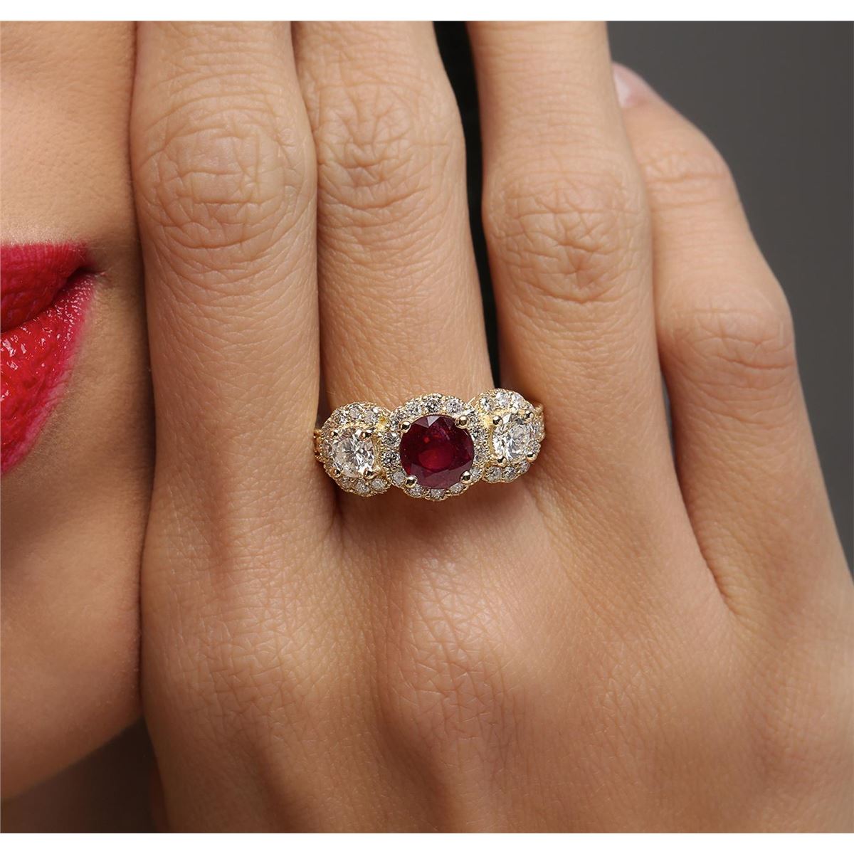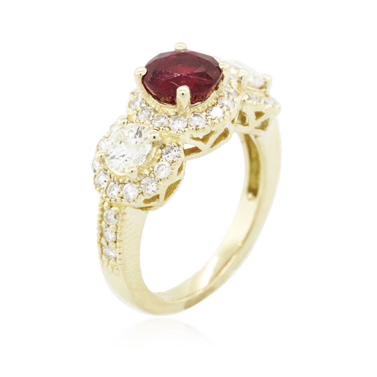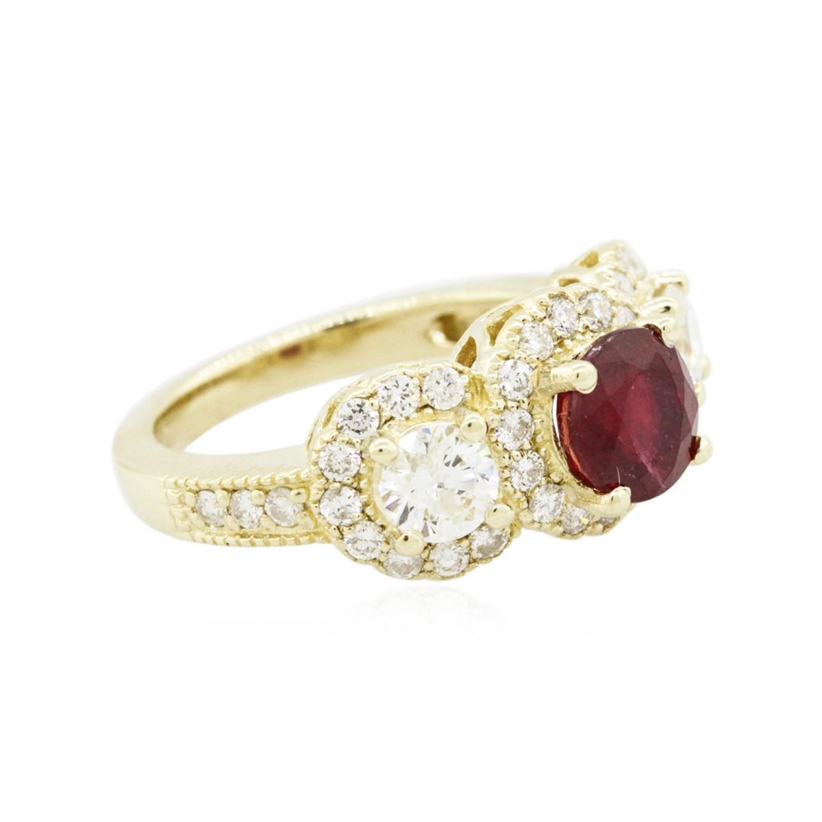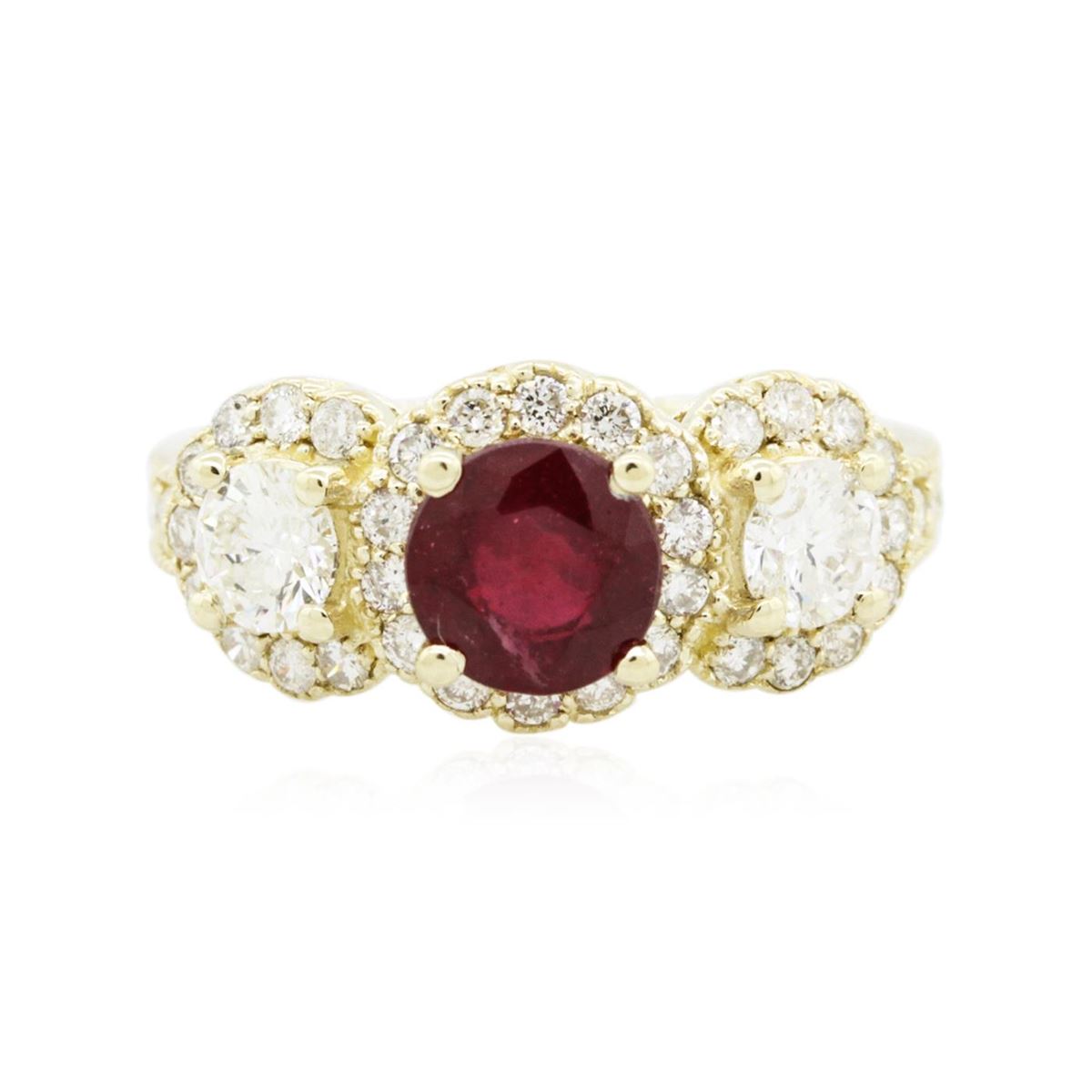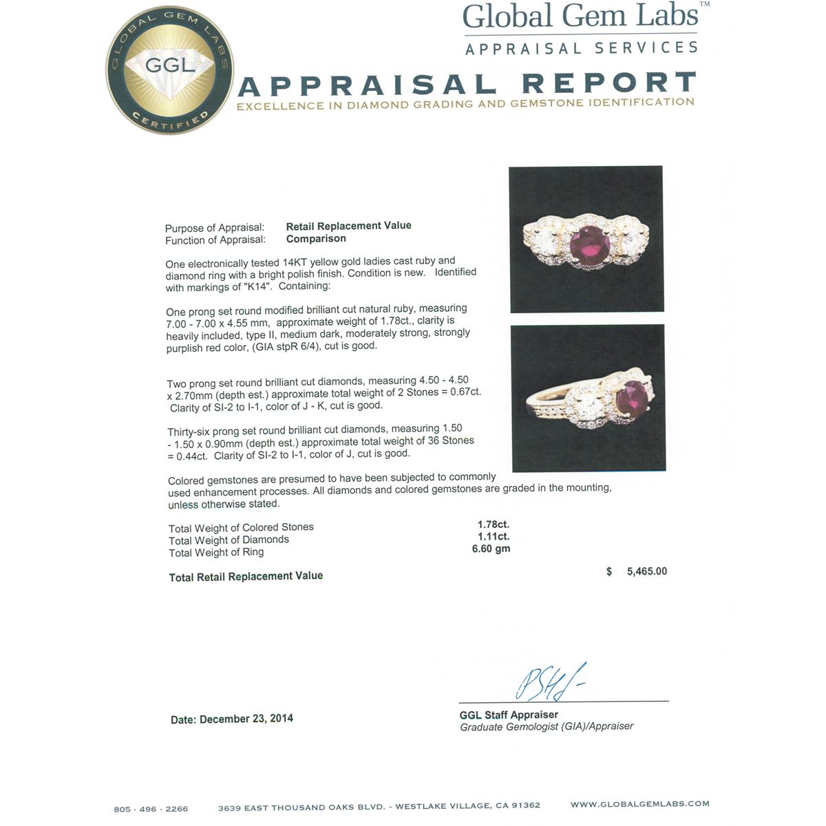 One electronically tested 14KT yellow gold ladies cast ruby and diamond ring with a bright polish finish. Identified with markings of "K14". Condition is new. Containing: One prong set round modified brilliant cut natural ruby, measuring 7.00 - 7.00 x 4.55 mm, approximate weight of 1.78ct., clarity is heavily included, type II, medium dark, moderately strong, strongly purplish red color, (GIA stpR 6/4), cut is good. Two prong set round brilliant cut diamonds, measuring 4.50 - 4.50 x 2.70mm (depth est.) approximate total weight of 2 Stones = 0.67ct. Clarity: SI-2 to I-1. Color: J - K, Cut is Good. Thirty-Six prong set round brilliant cut diamonds, measuring 1.50 - 1.50 x 0.90mm (depth est.) approximate total weight of 36 Stones = 0.44ct. Clarity: SI-2 to I-1. Color: J, Cut is Good. Colored gemstones are presumed to have been subjected to commonly used enhancement processes. All diamonds and colored gemstones are graded in the mounting, unless otherwise stated. Total Weight of Colored Stones 1.78ct. Total Weight of Diamonds 1.11ct. Total Weight of Ring 6.60 grams. GGL Appraised at $5,465.00.